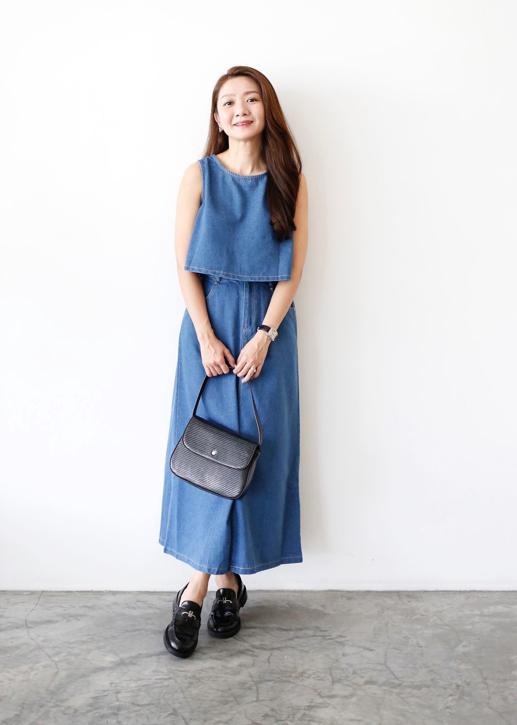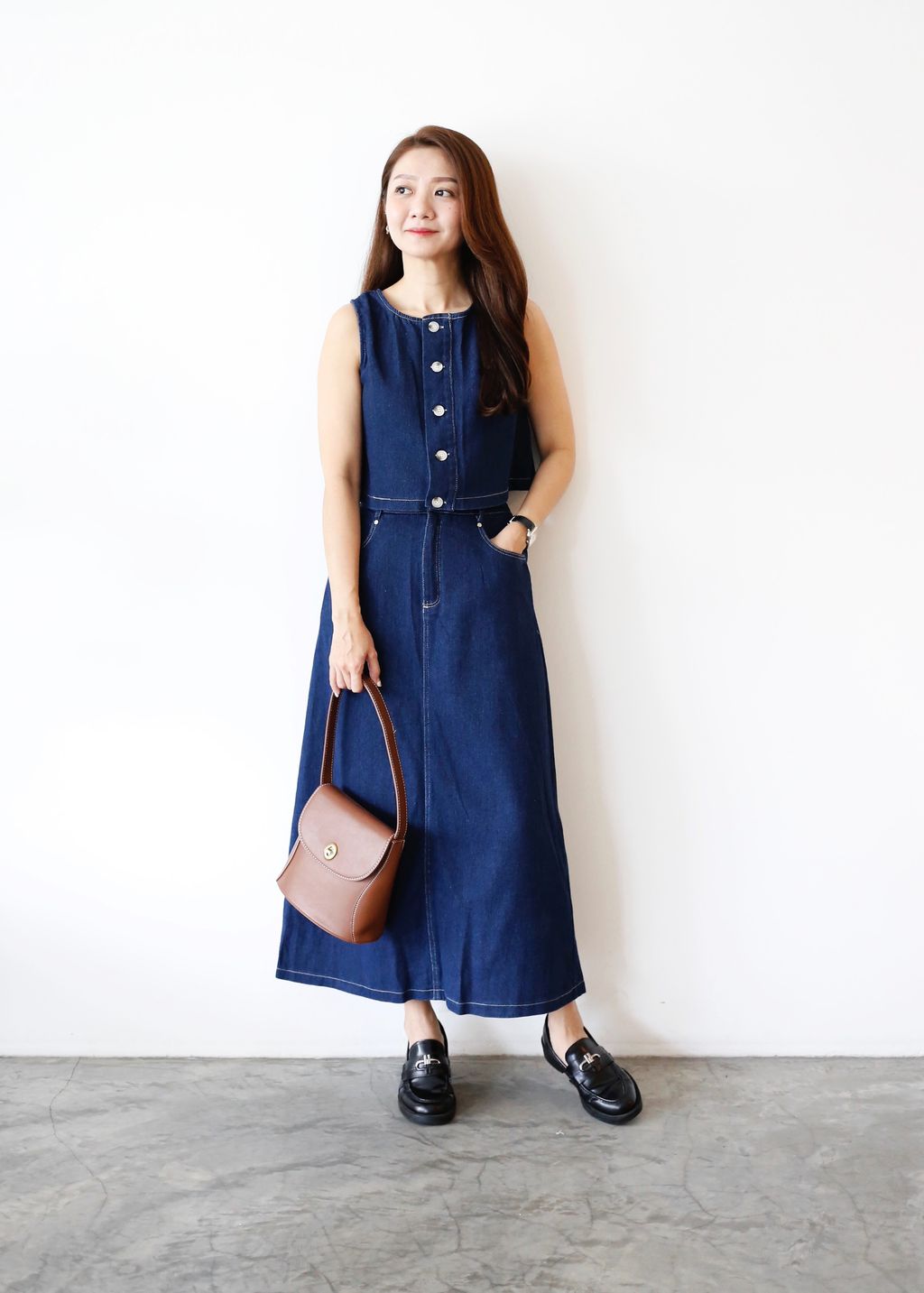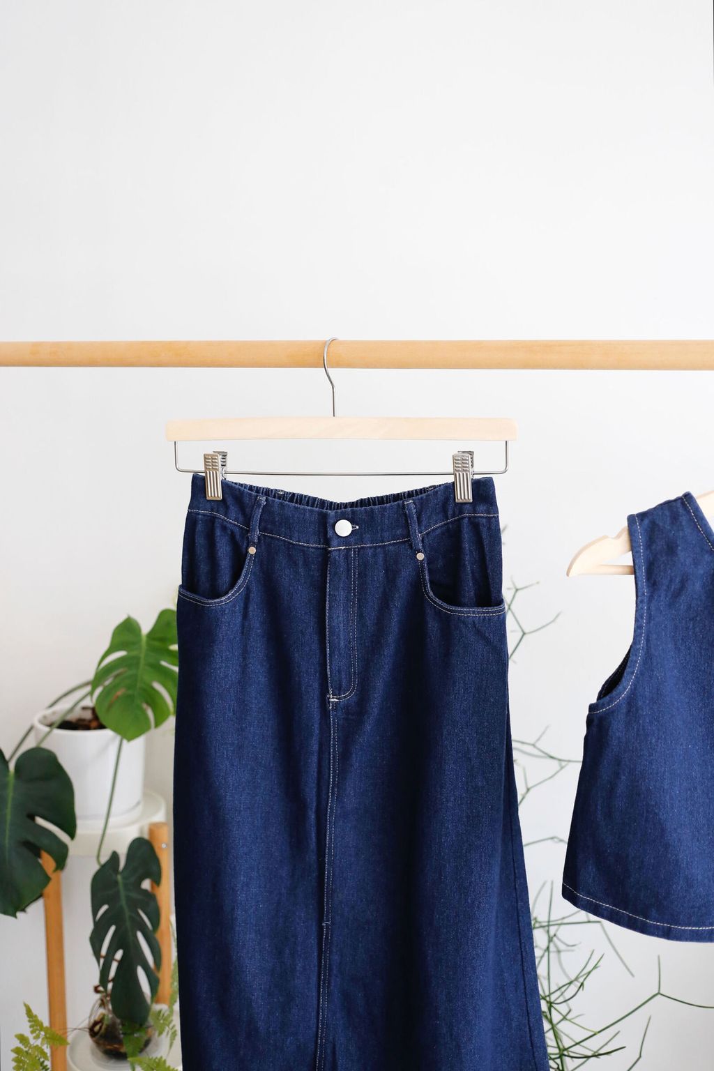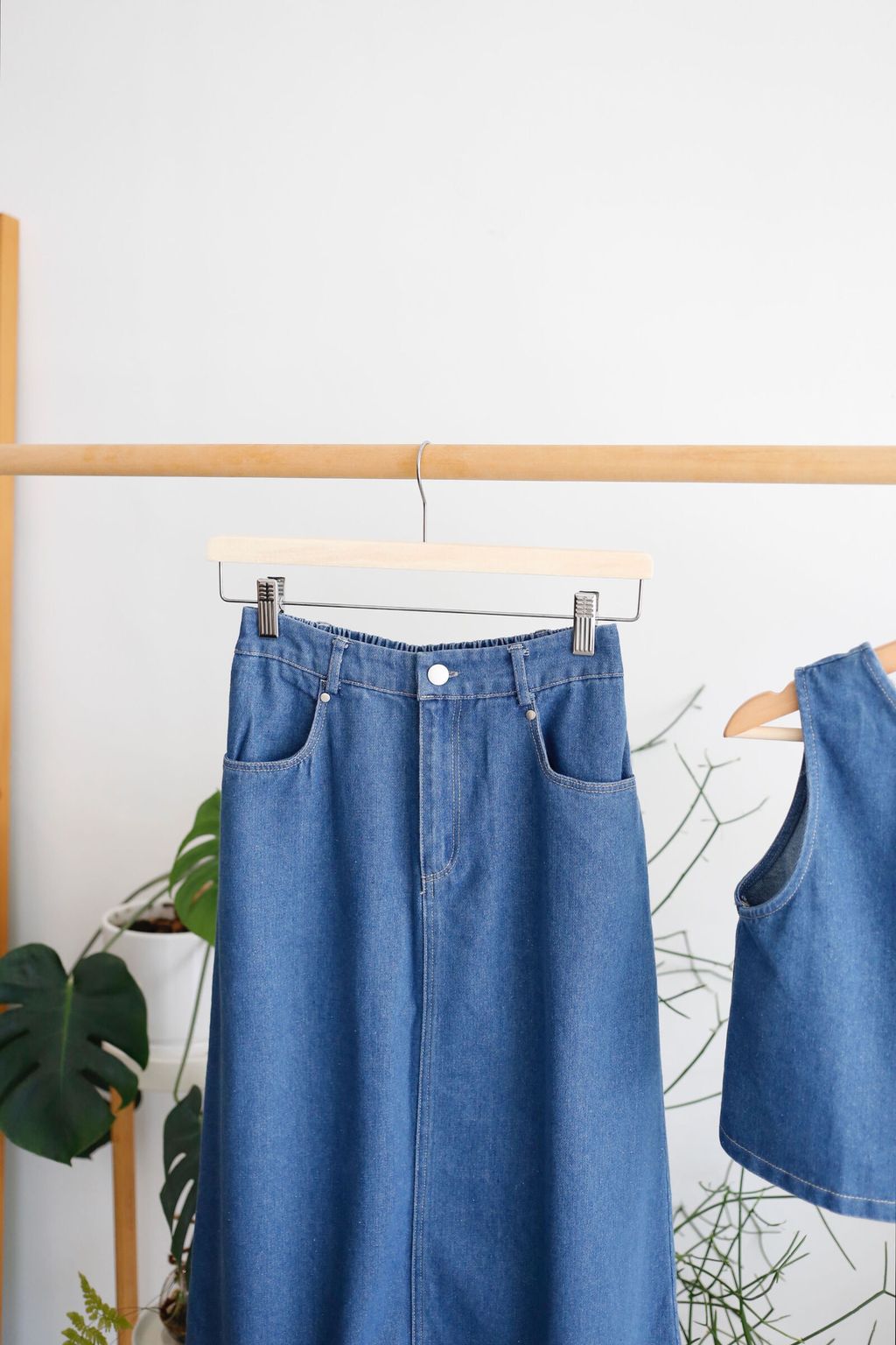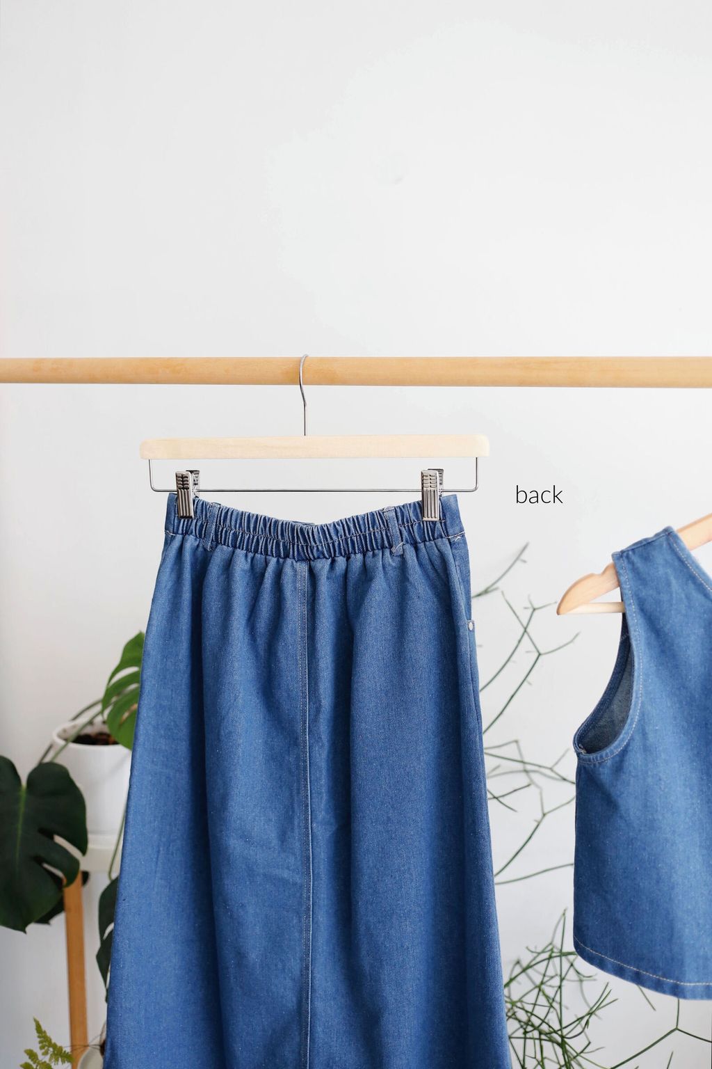 Type: 2PCS Denim Top and Midi Skirt Set | Non Stretchable Denim Fabric | Stretchable Waistband for Skirt | Front Zipper | Side Pockets | Functional Button for Top | Wear the Top Two Ways - Front or Back