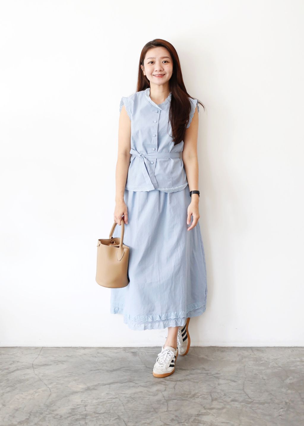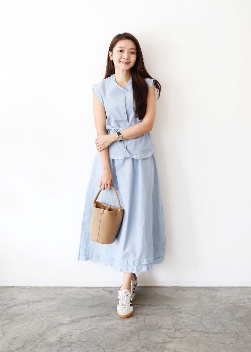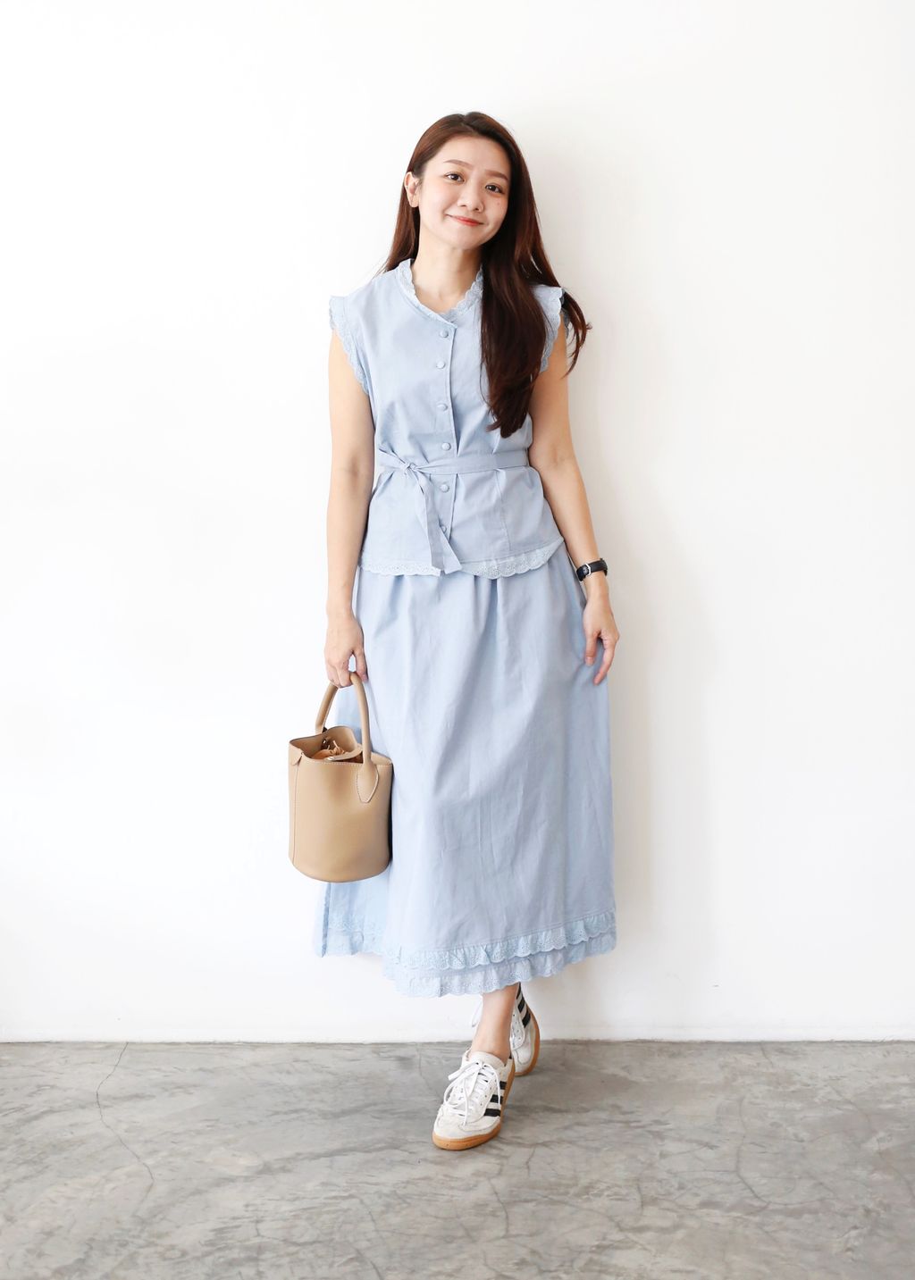 Type: 2PCS Eyelet Embroidered Blouse with Midi Skirt Set | PREMIUM SERIES | Linen Fabric | Stretchable Waistband for Skirt | Side Pockets | Skirt Comes with Lining | Kindly Take Note on Bigger Armpit Gap Hole for Blouse