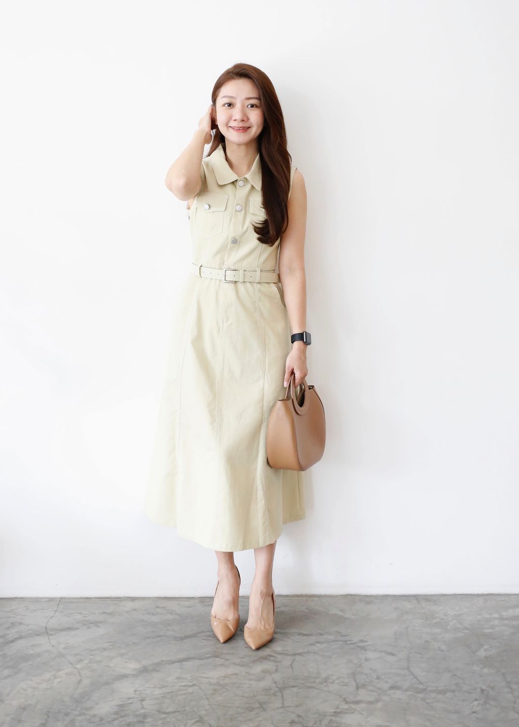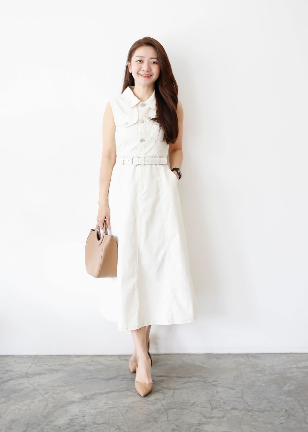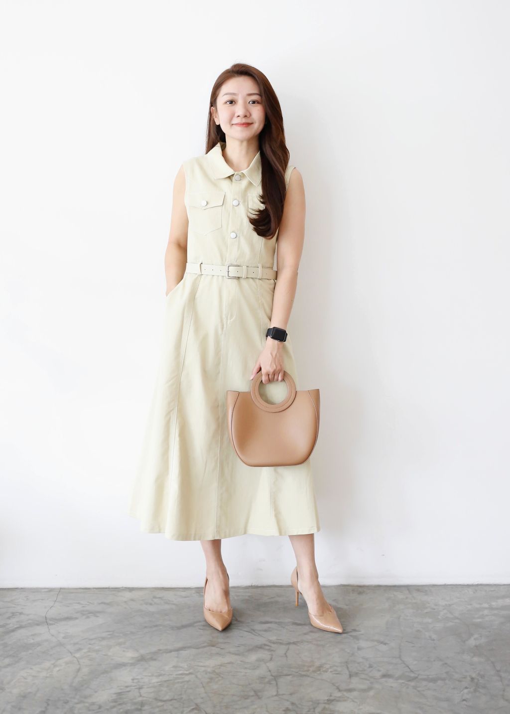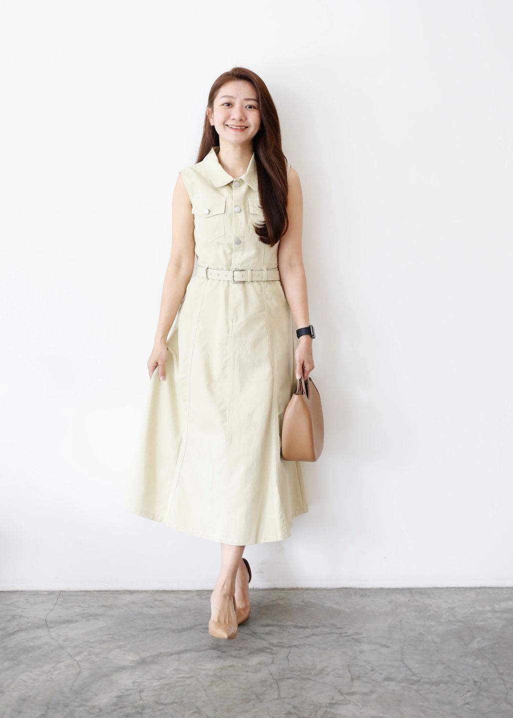 Type: Contrast Trim Sleeveless Midi Dress with Belt | Cotton Fabric | Not Stretchable | Button Through Design with Front Zipper From Waist | Side Pockets | Comes with Separate Belt