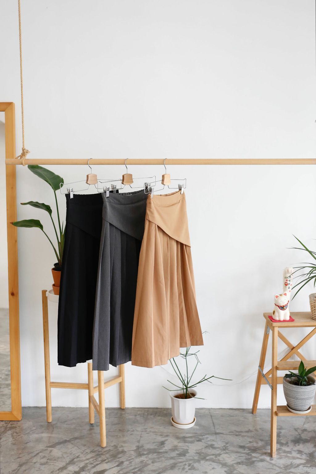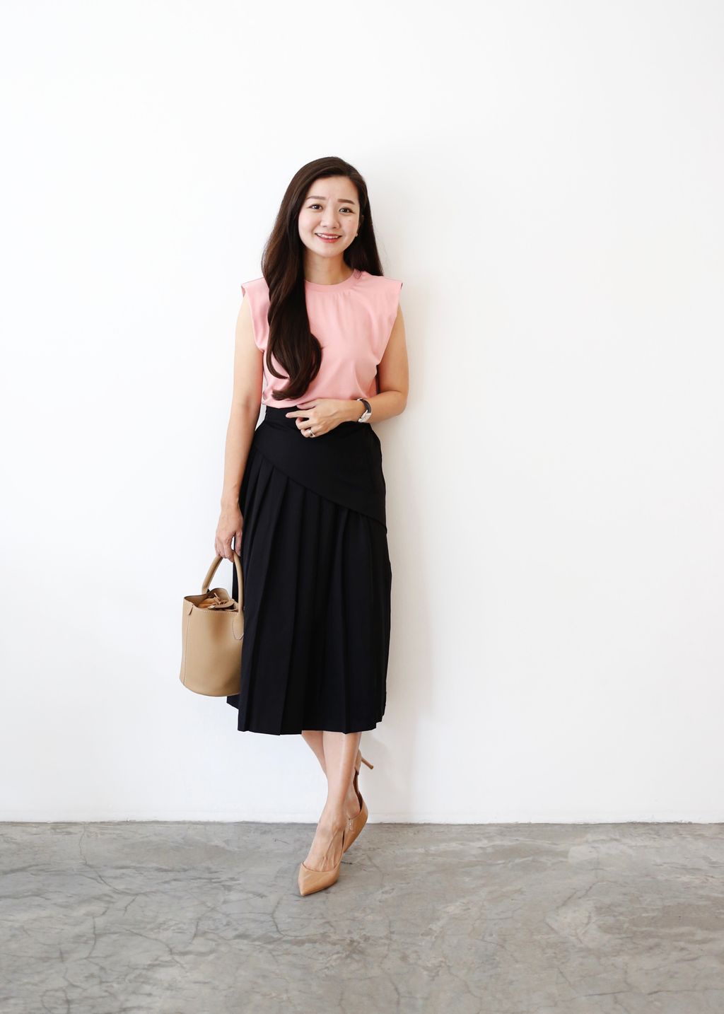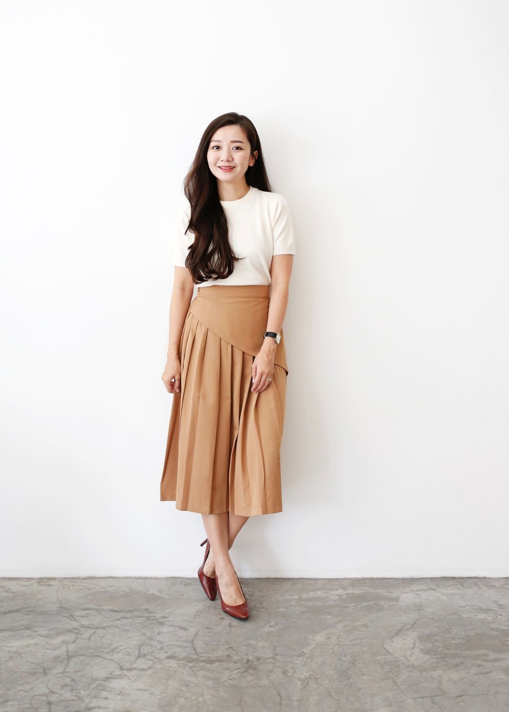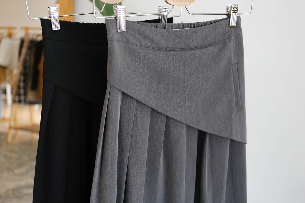 Type: Slant Cut Front Pleated Midi Skirt | Side Zipper | Stretchable Waistband | Suit Fabric