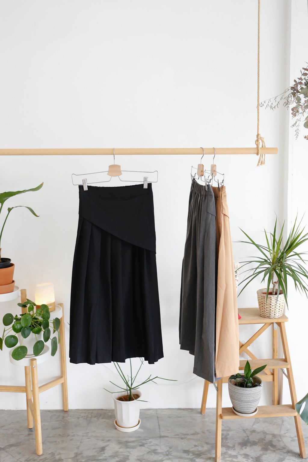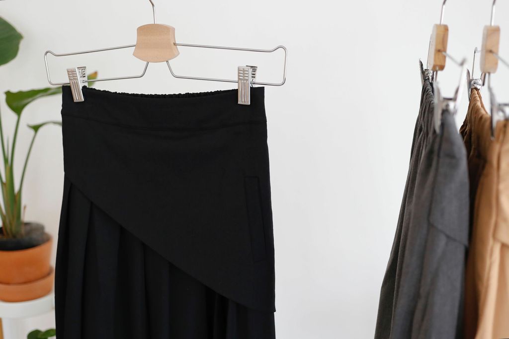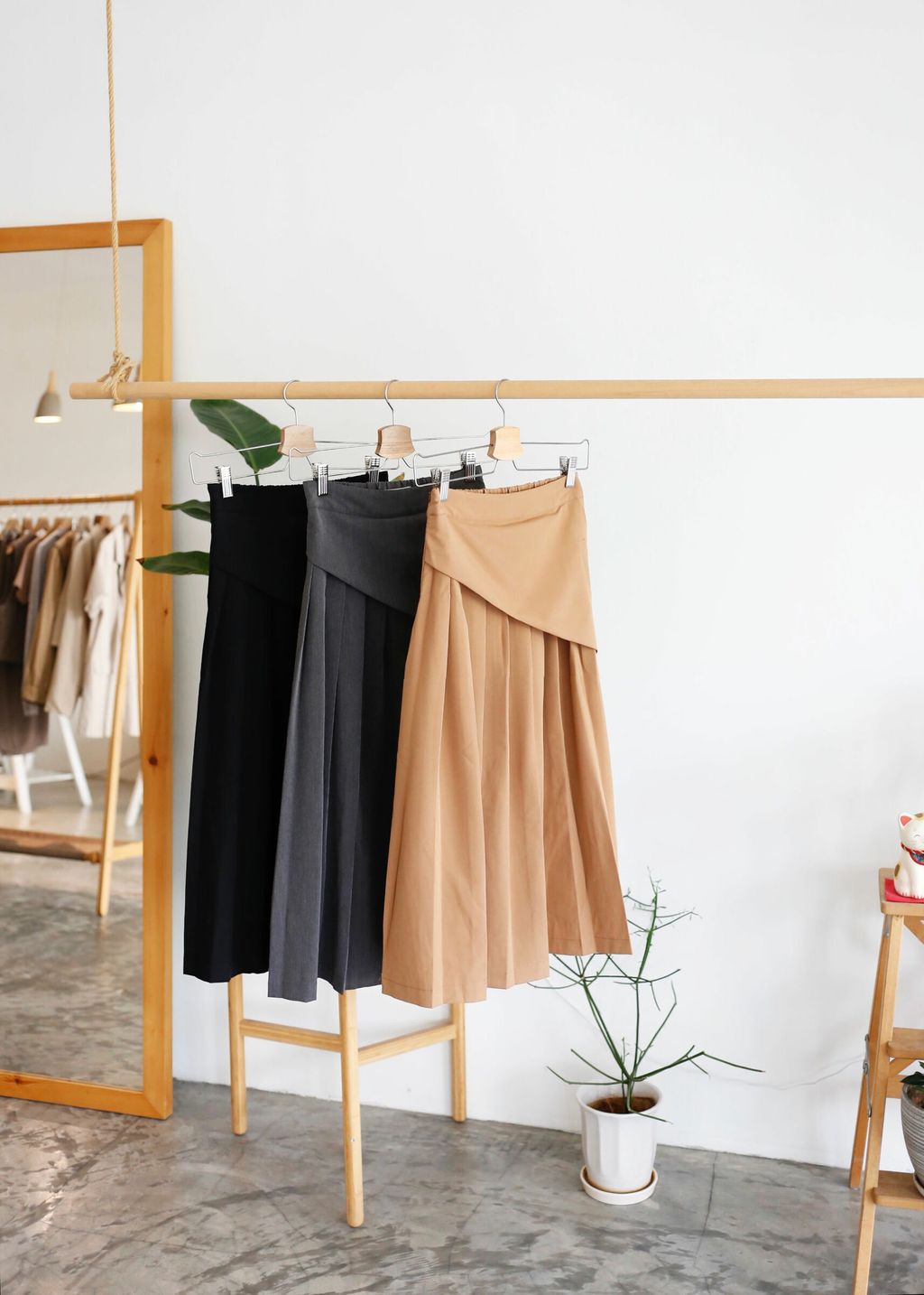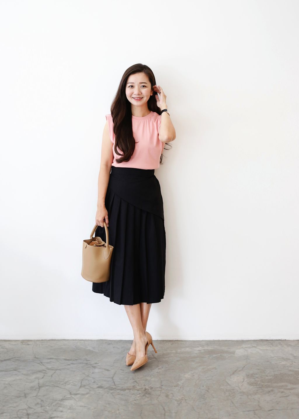 Type: Slant Cut Front Pleated Midi Skirt | Side Zipper | Stretchable Waistband | Suit Fabric