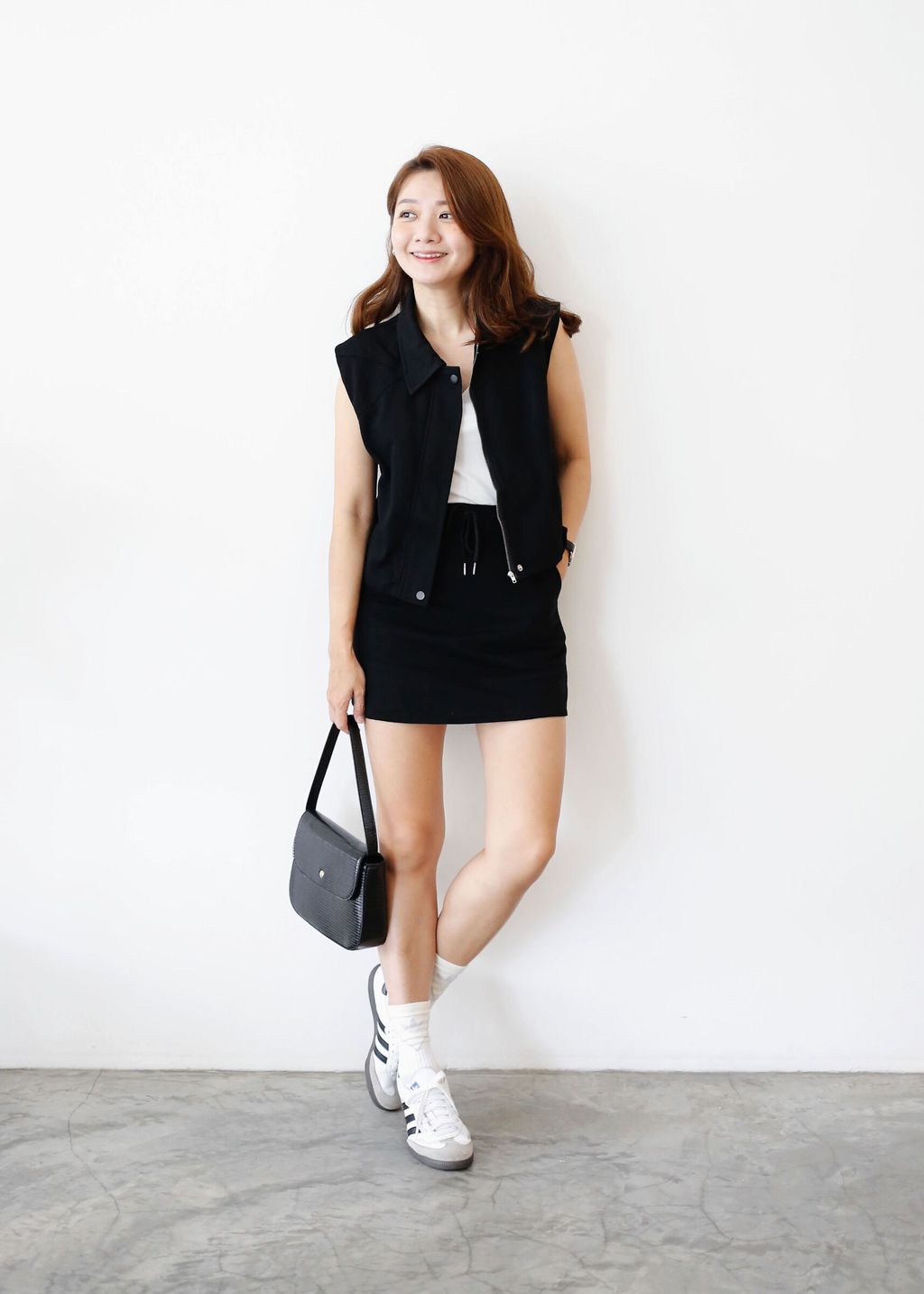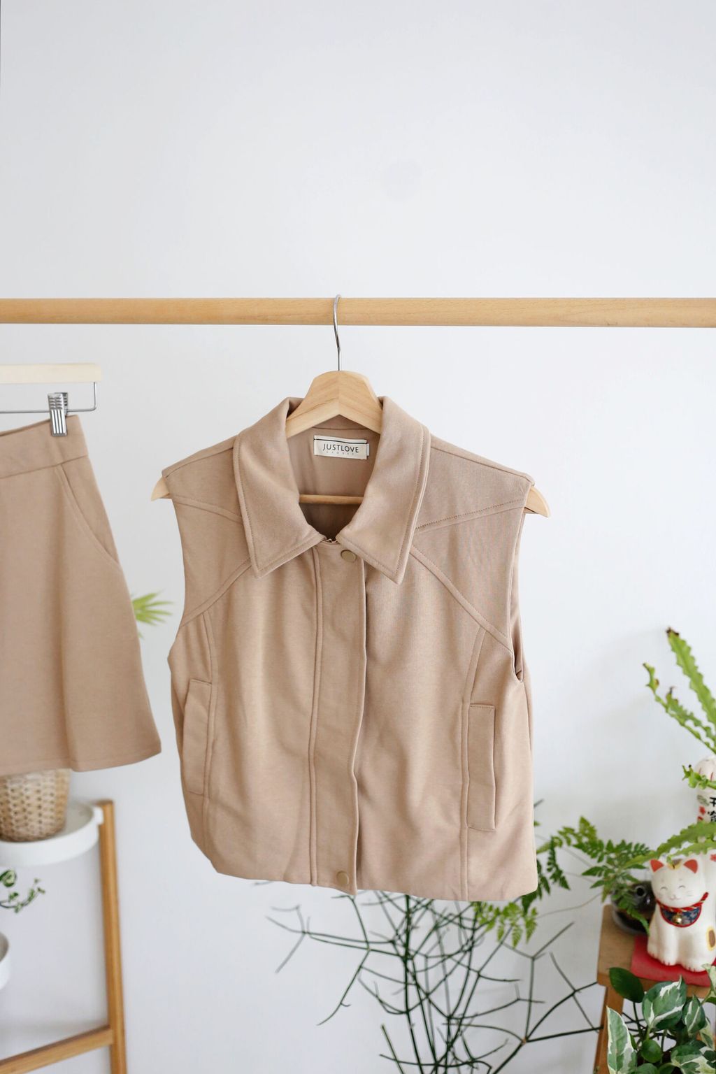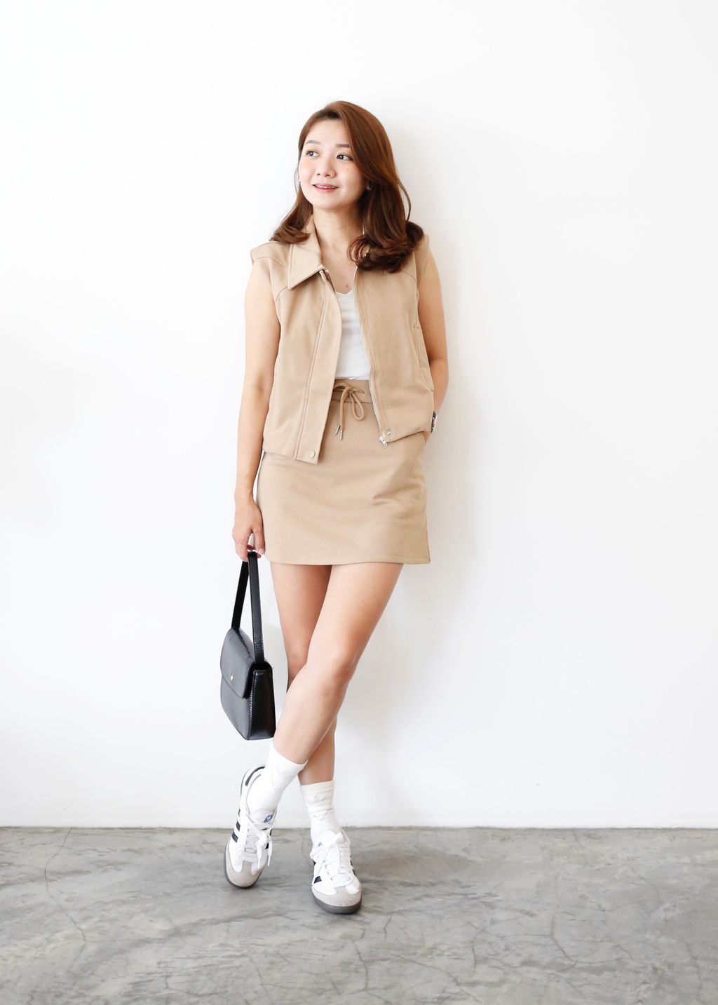 Type: 2PCS Collared Vest and Skirt Set | Stretchable Cotton Fabric | Front Zipper for Vest | Back Zipper with Drawstring for Skirt | Vest with Full Lining | Skirt with Pants Lining | Side Pockets