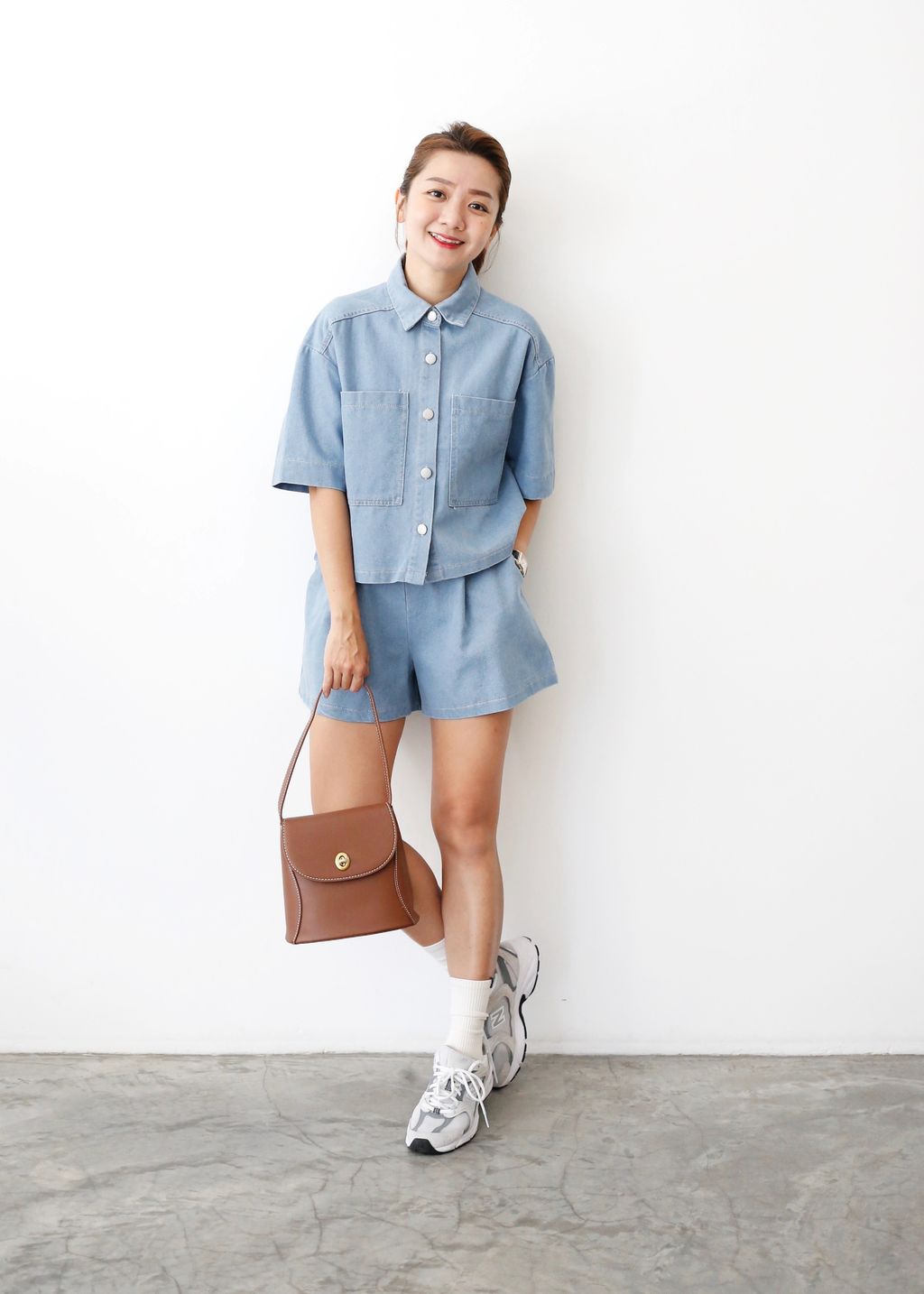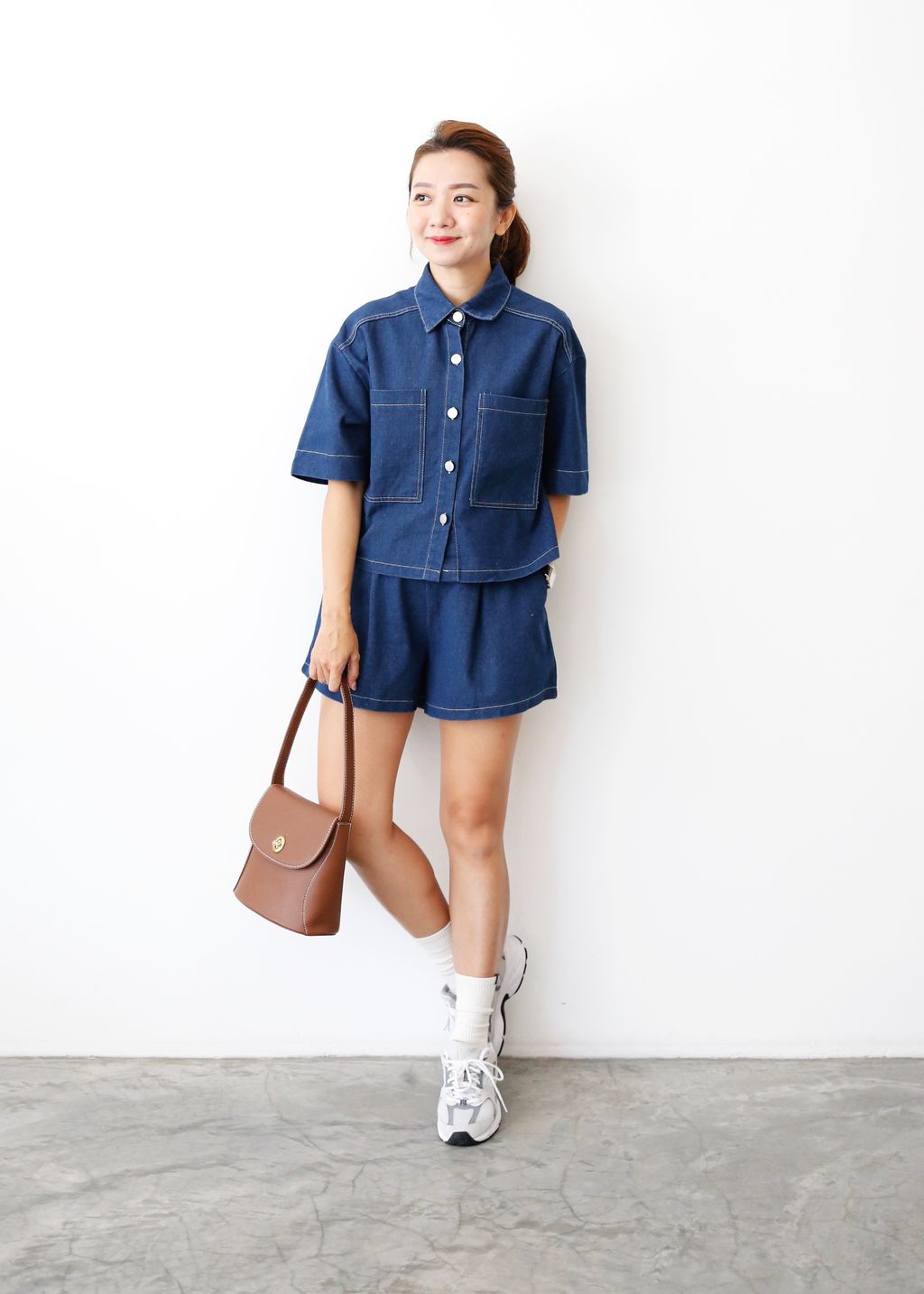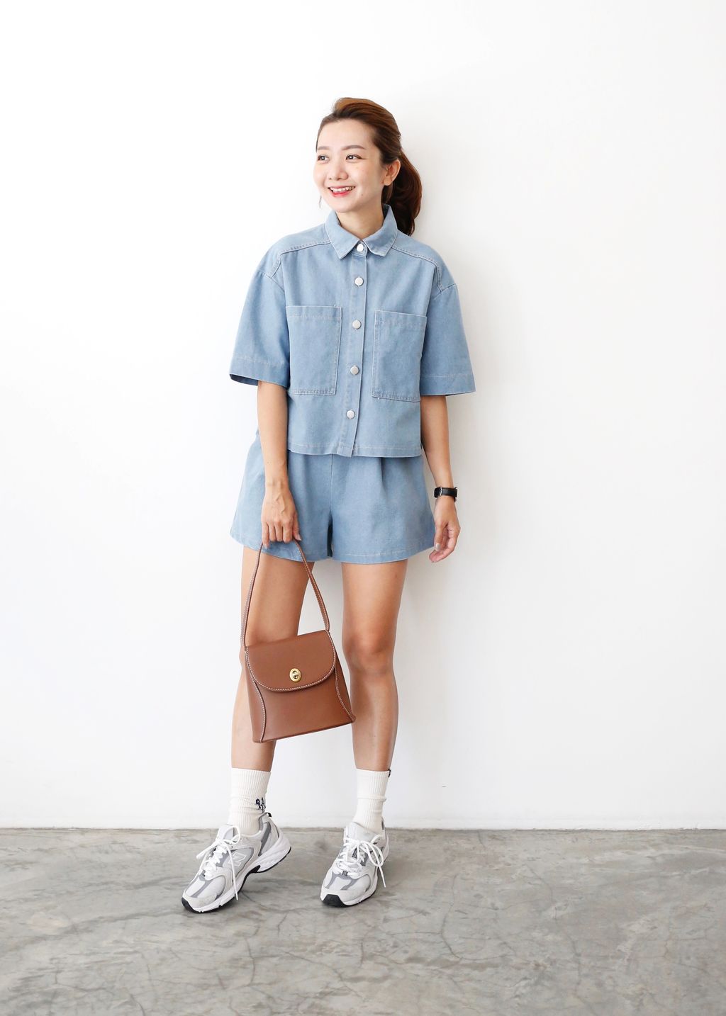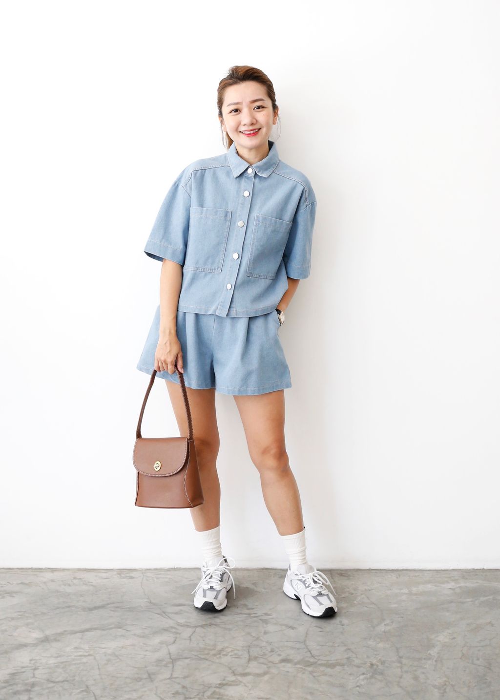 Type: 2PCS Denim Cropped Shirt with Shorts Set | Non Stretchable Denim | Stretchable Waistband for Pants | Side Pockets for Pants