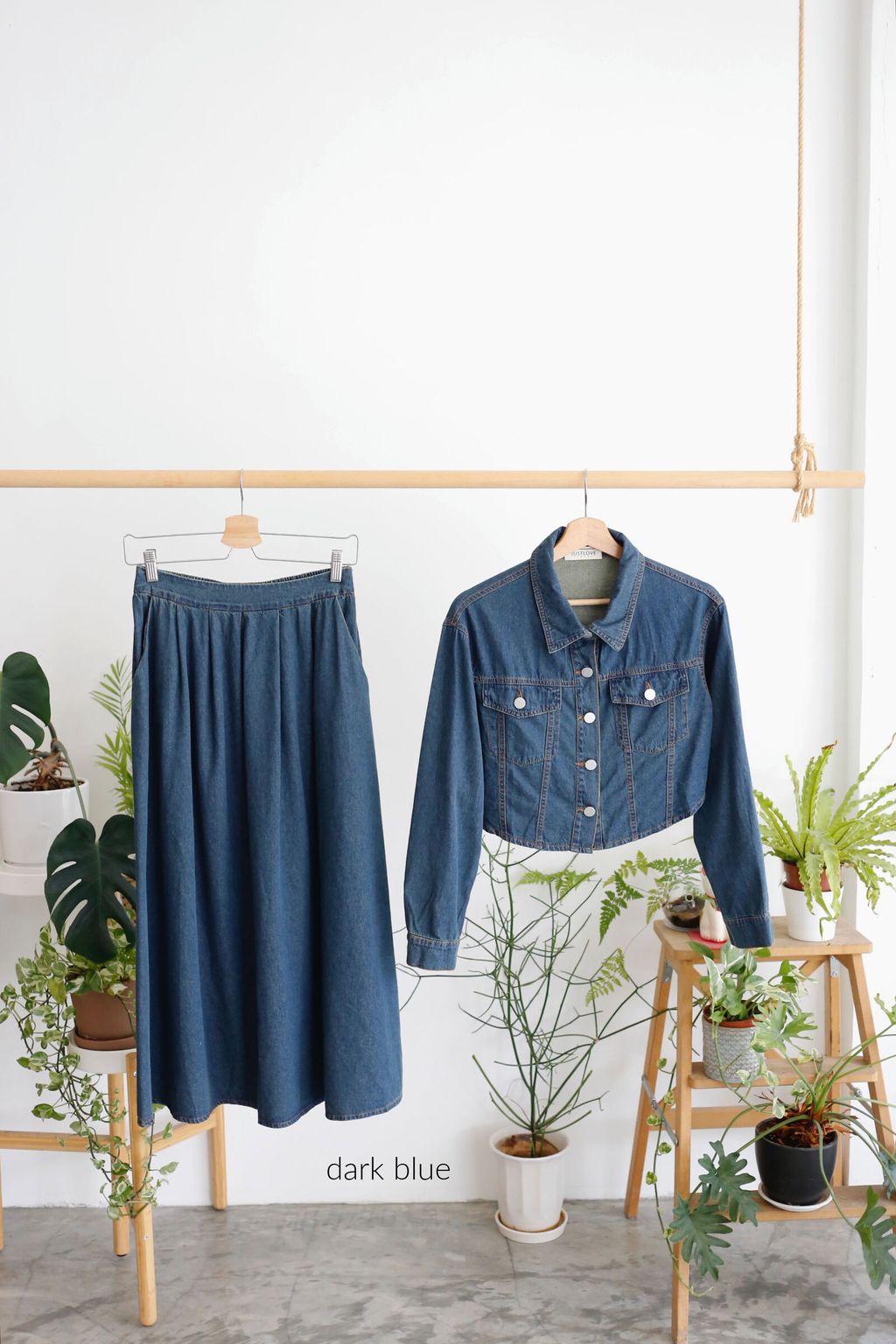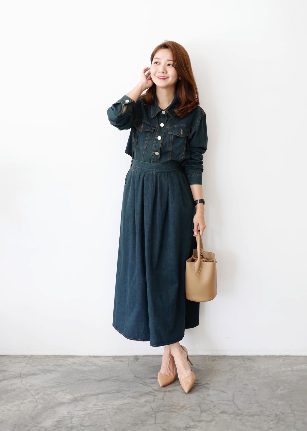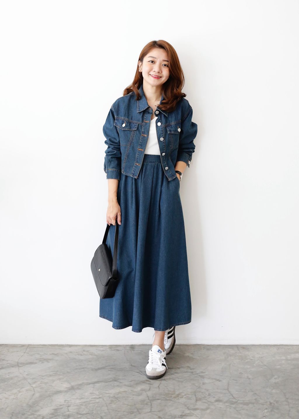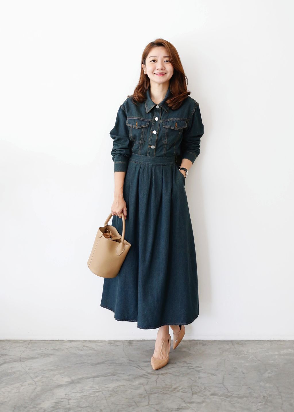 Type: 2PCS Denim Shirt and Midi Skirt Set | Soft Denim Fabric | Side Curved Up Design for Shirt | Stretchable Waistband for Skirt | Side Pockets