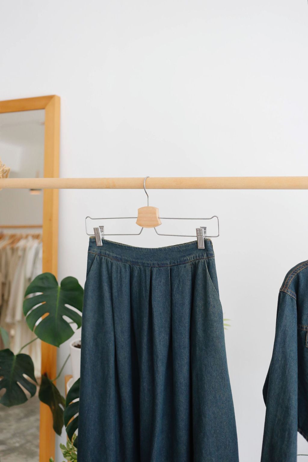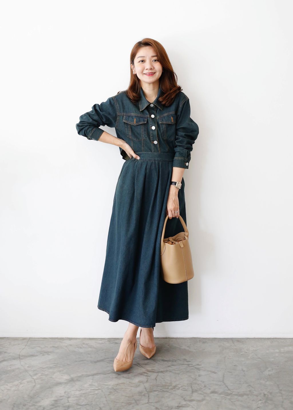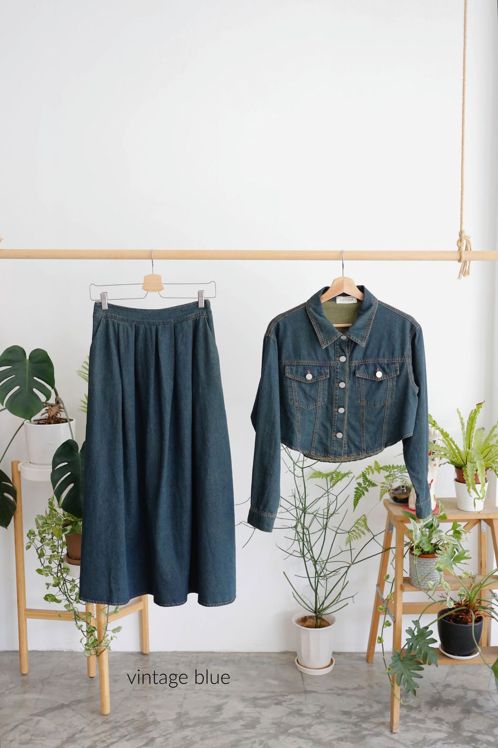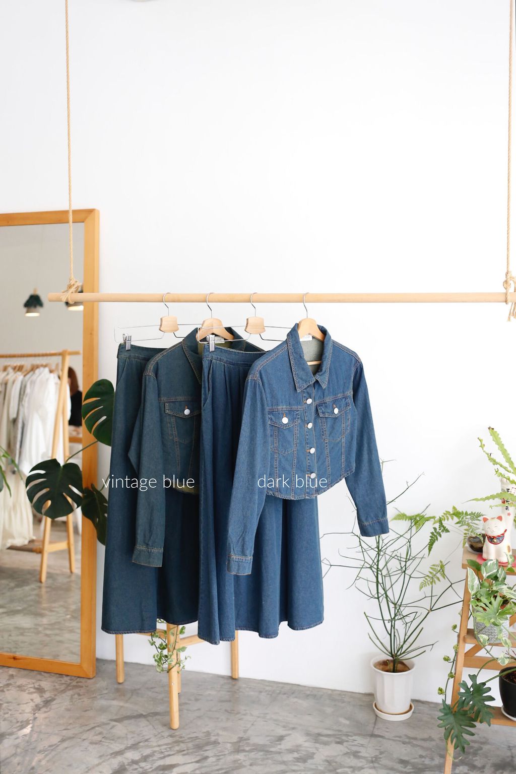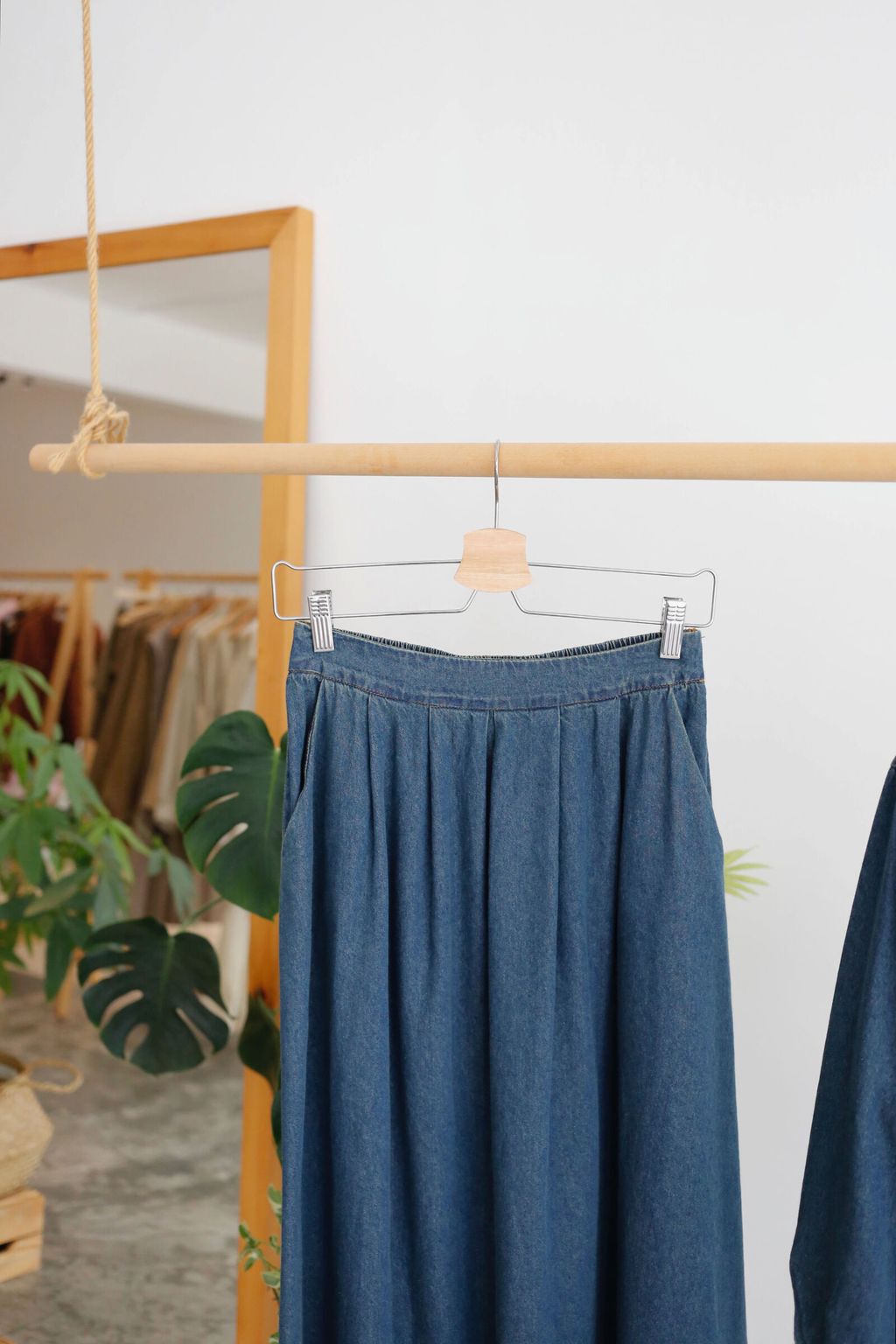 Type: 2PCS Denim Shirt and Midi Skirt Set | Soft Denim Fabric | Side Curved Up Design for Shirt | Stretchable Waistband for Skirt | Side Pockets