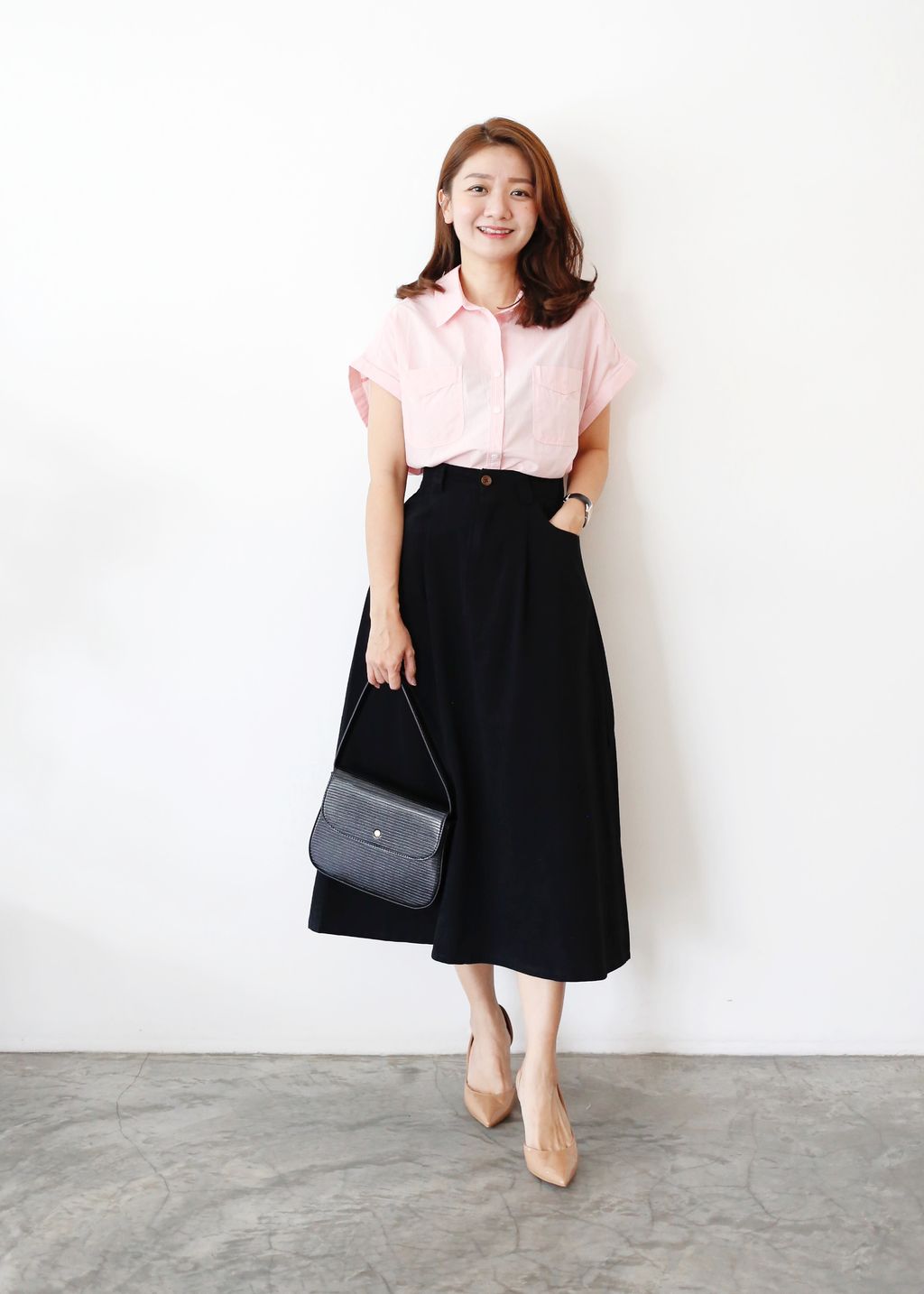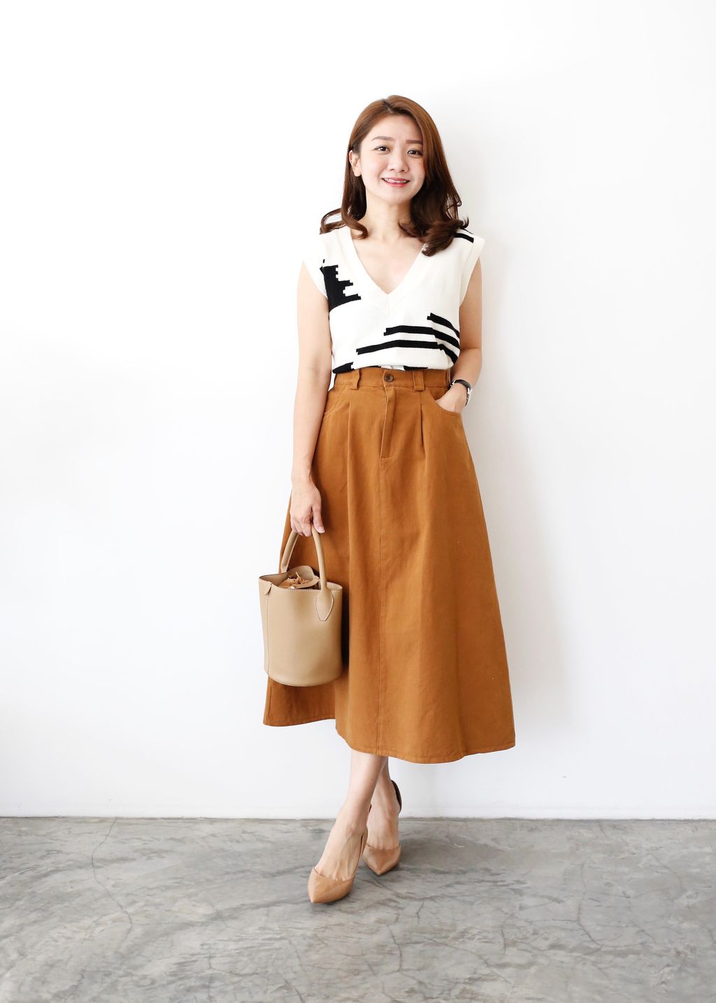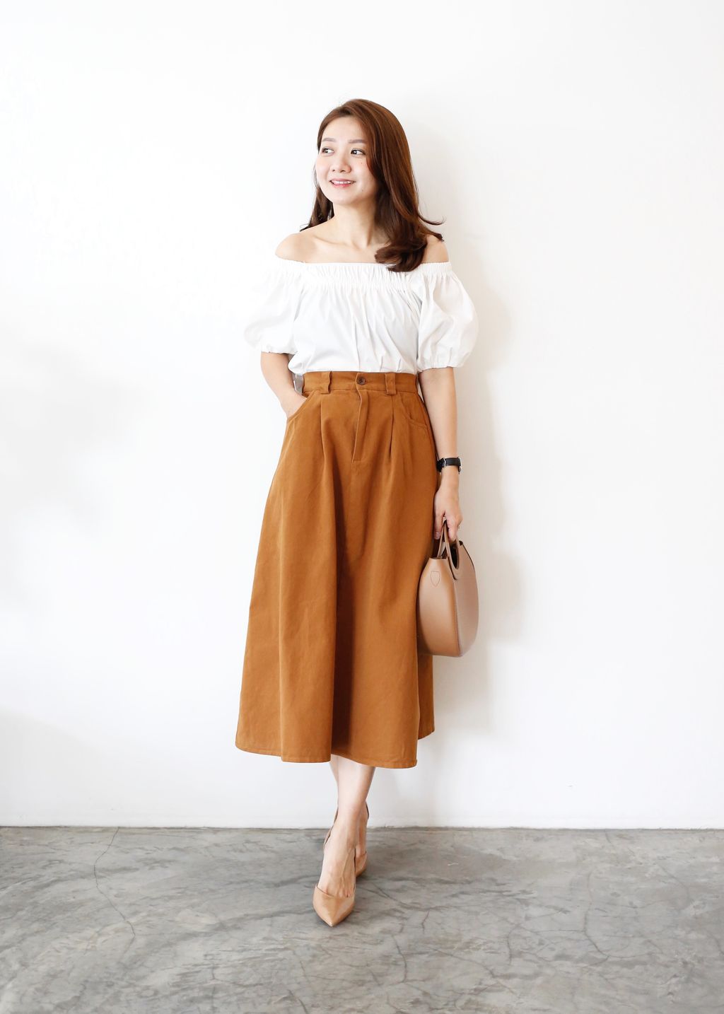 Type: Cotton Twill A-Line Midi Skirt | Non Stretchable Cotton Twill Fabric | Side Pockets | Front Zipper | Stretchable Waistband