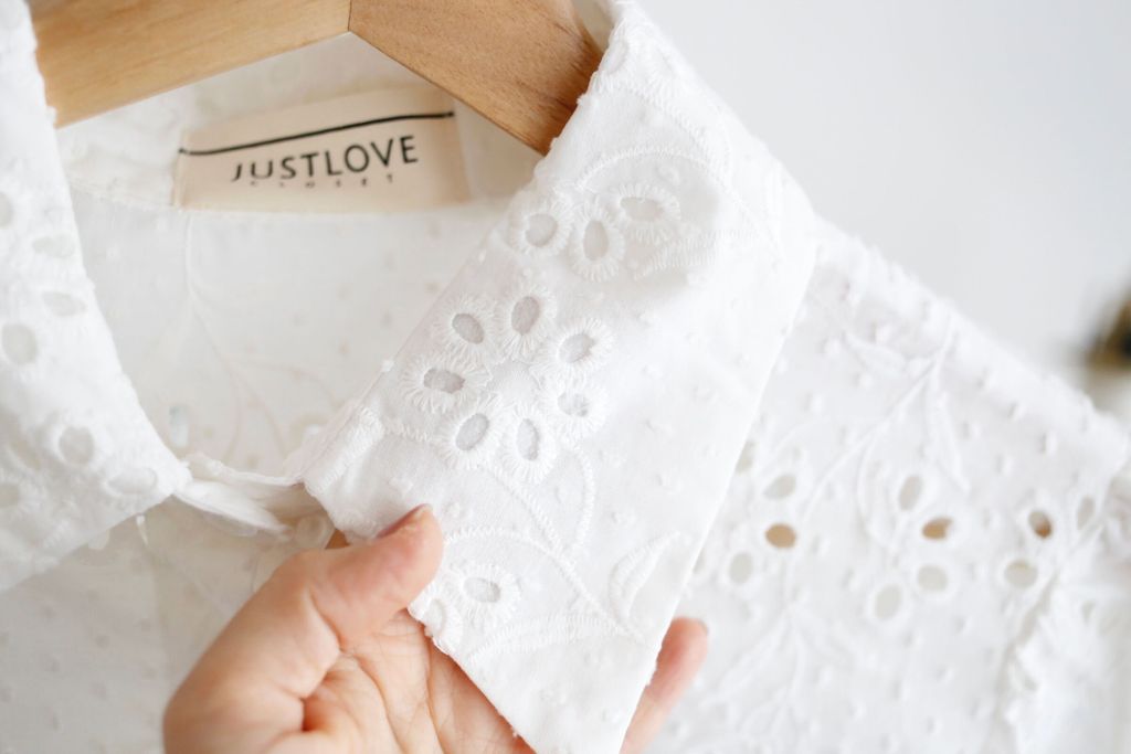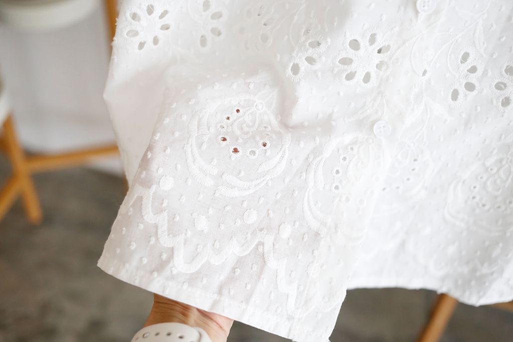 Type: Classic Eyelet Embroidery Shirt | Breathable Cotton Fabric with Delicate Embroidered Eyelet Detailing | Button Through Design