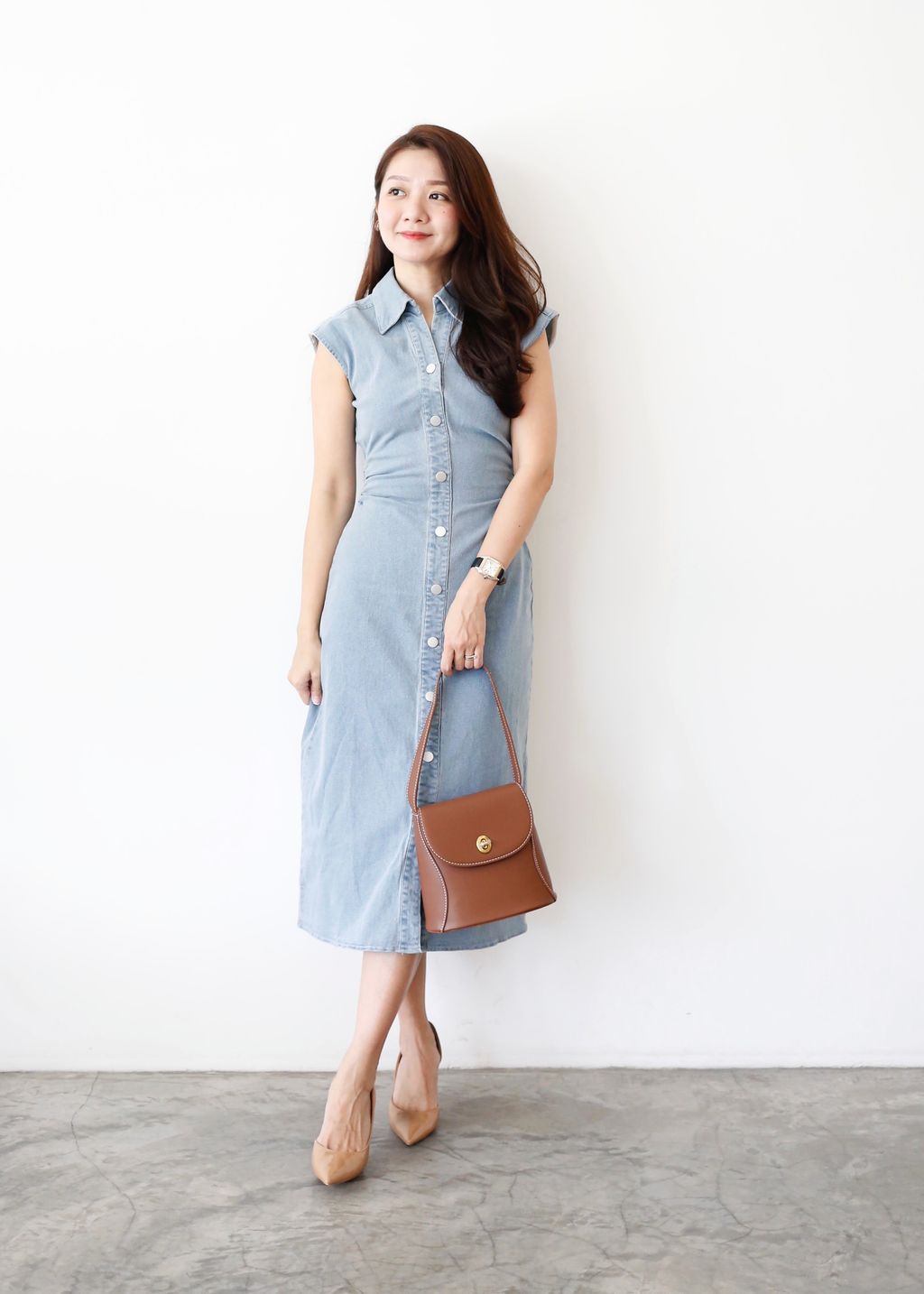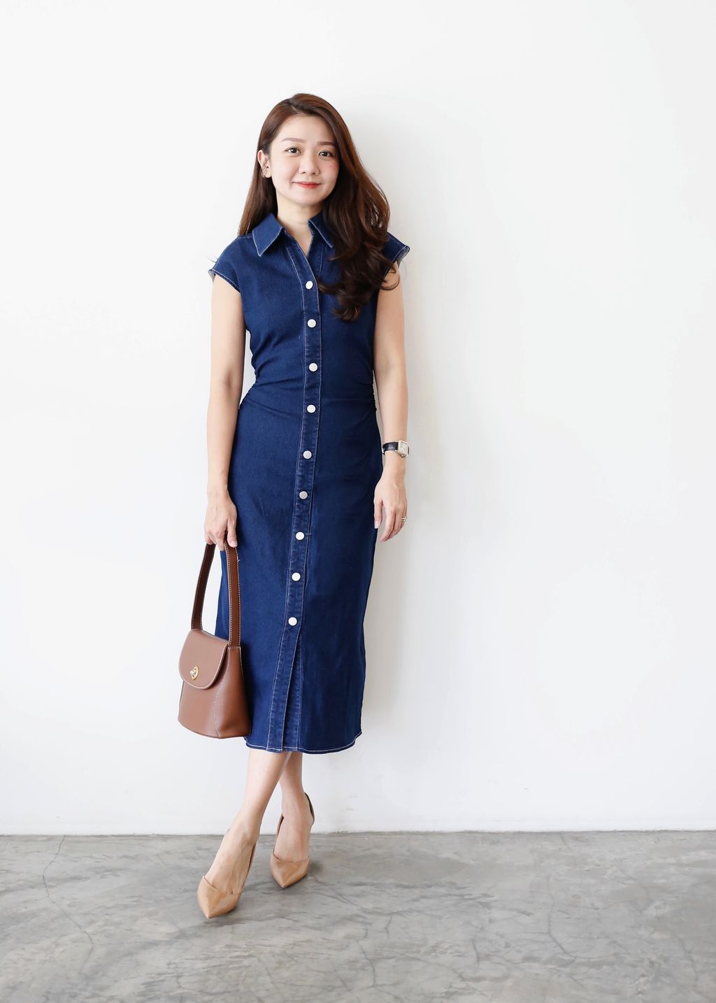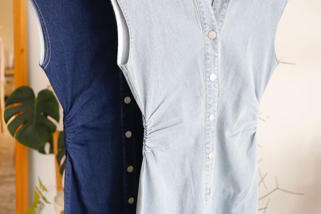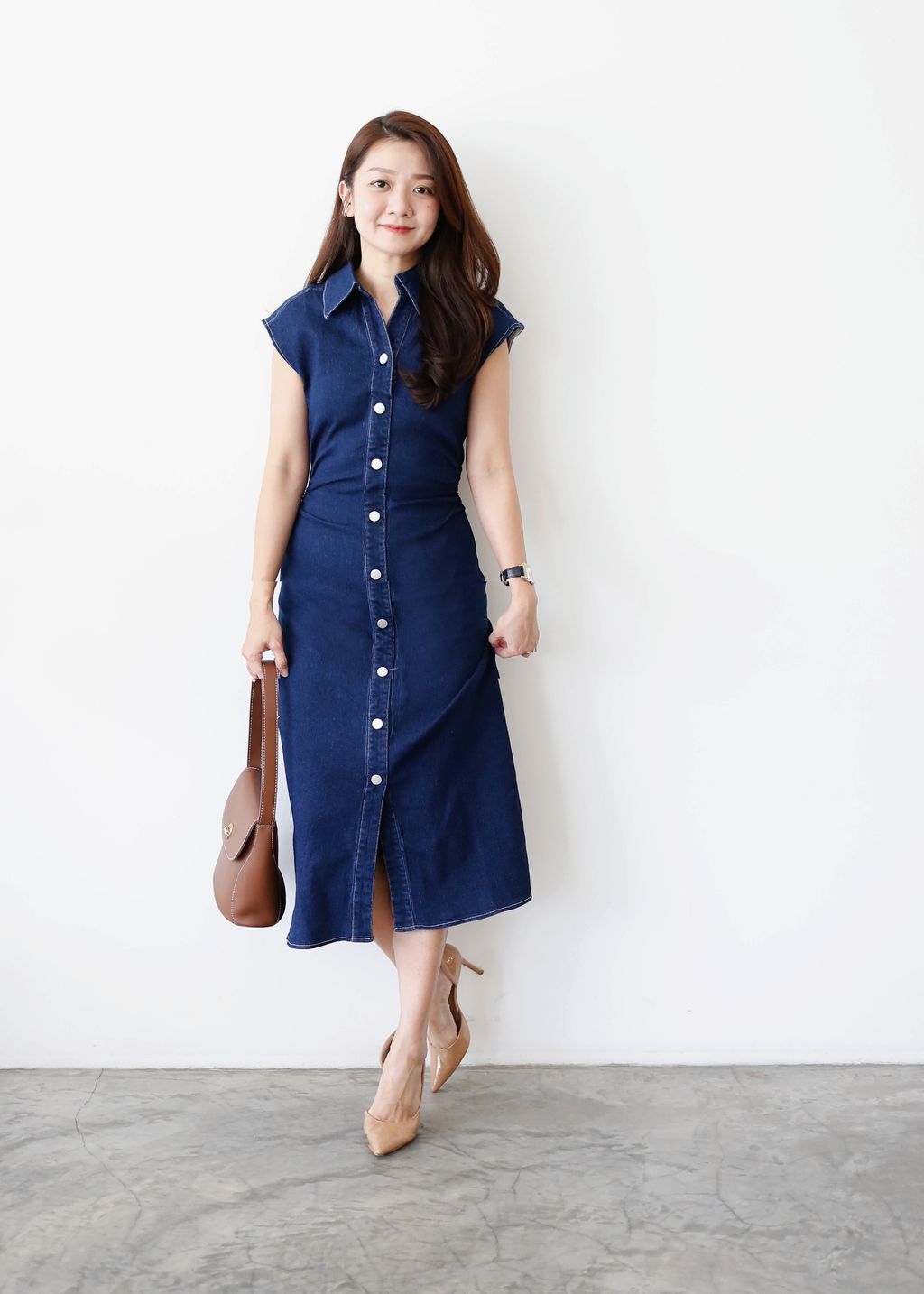 Type: V-Neck Button Denim Dress | PREMIUM SERIES | Stretchable Denim Fabric | Cinched Waist Design | Only First Button is Functional | Back Zipper | Cap Sleeves Design