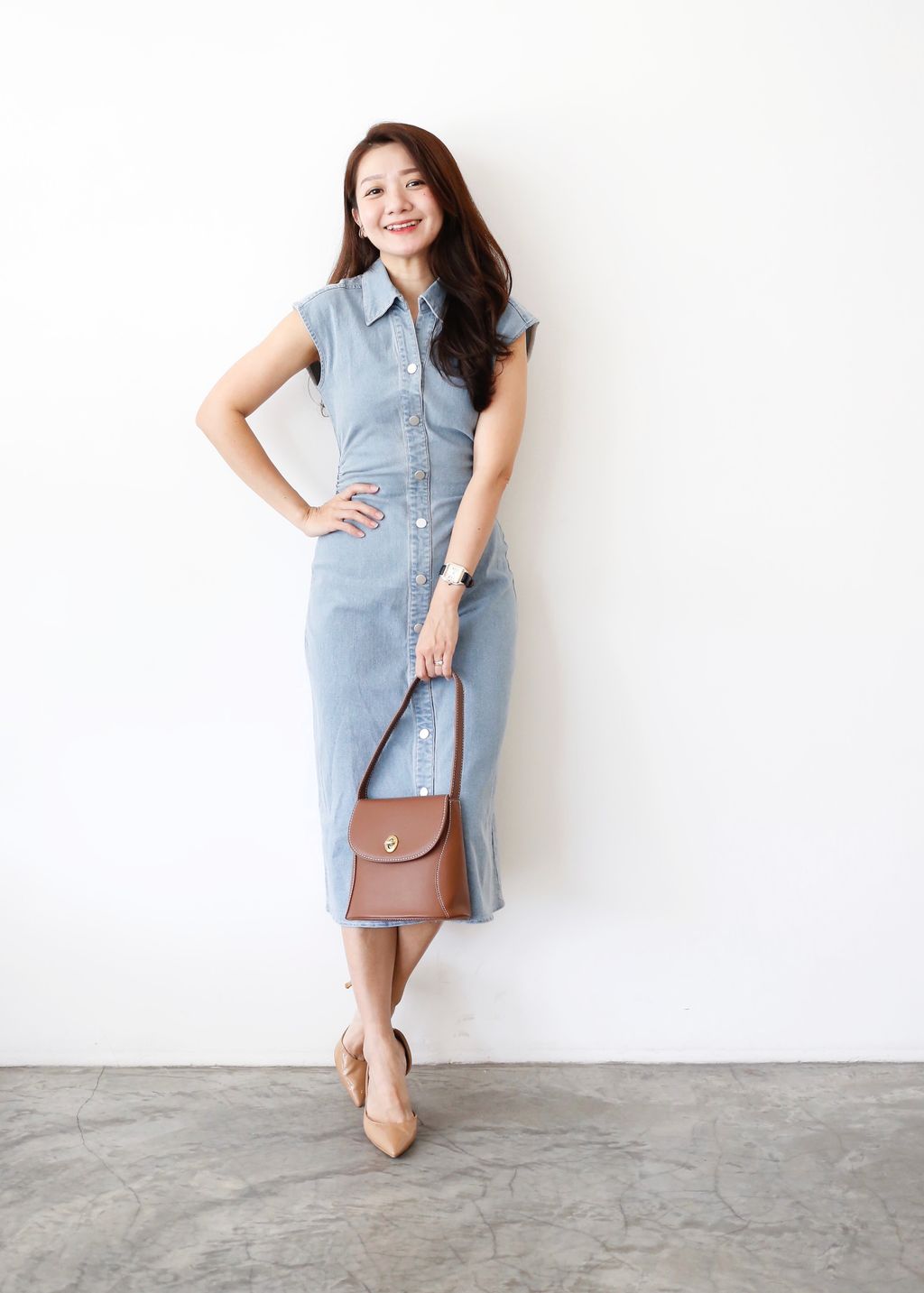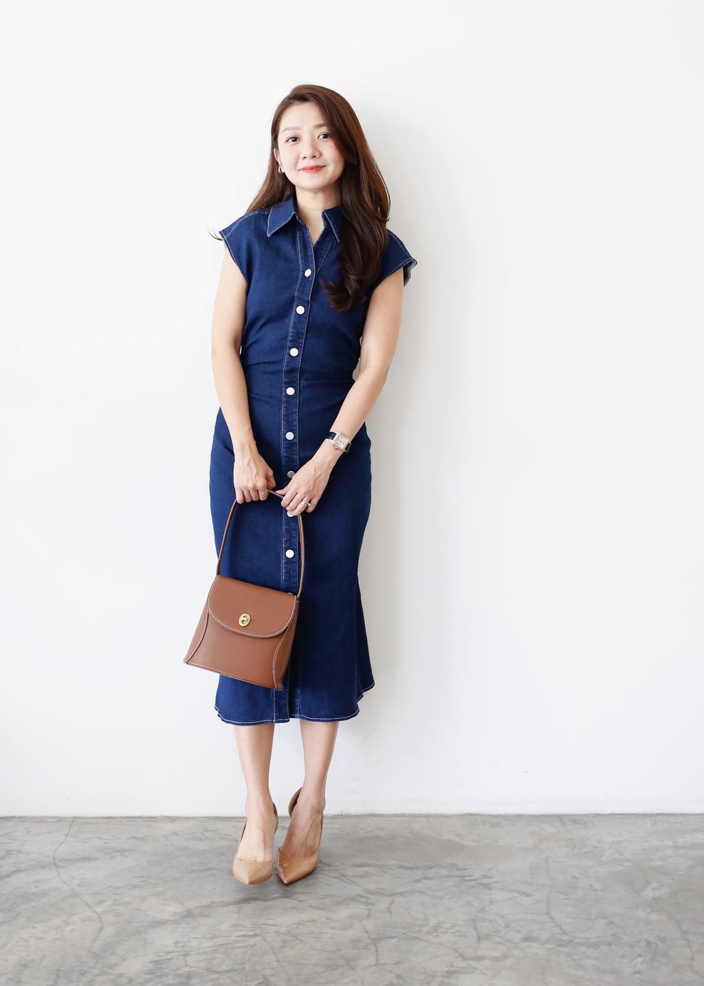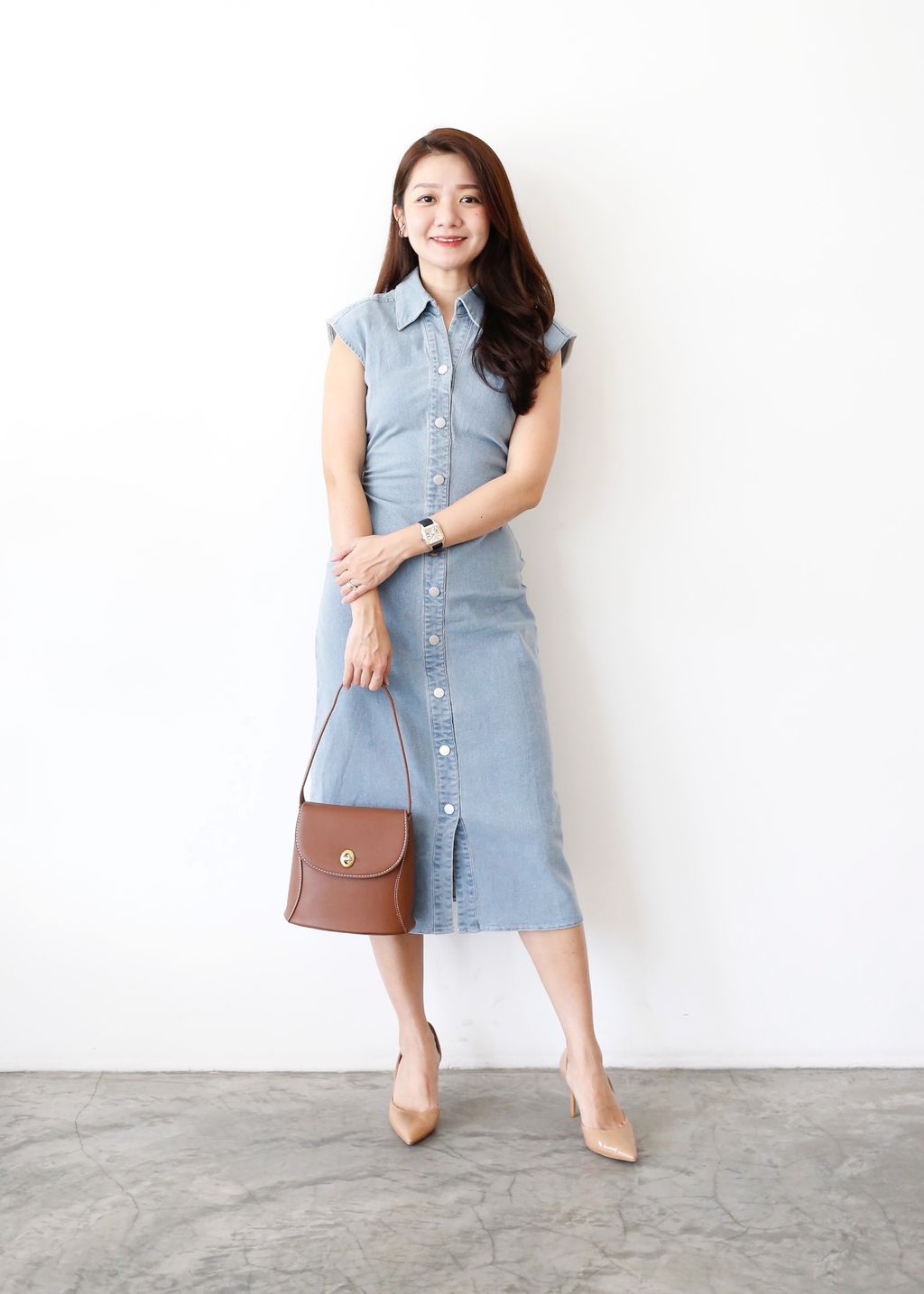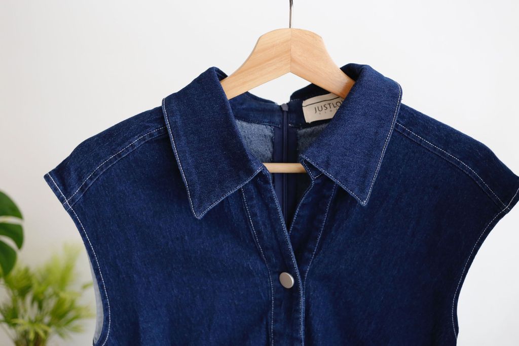 Type: V-Neck Button Denim Dress | PREMIUM SERIES | Stretchable Denim Fabric | Cinched Waist Design | Only First Button is Functional | Back Zipper | Cap Sleeves Design