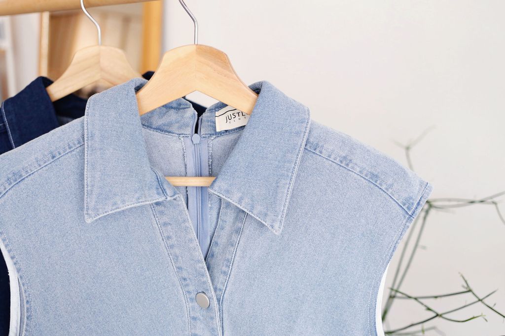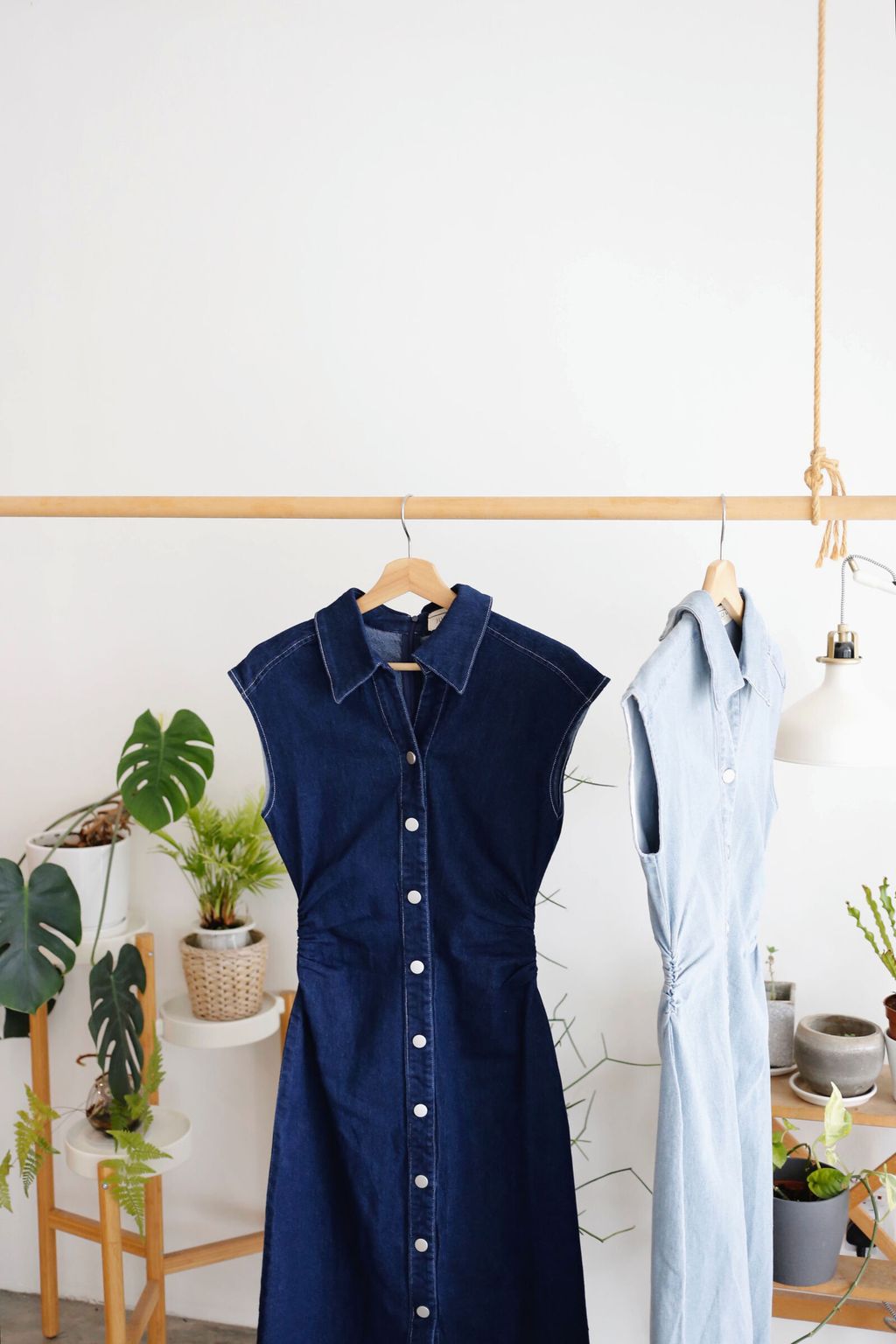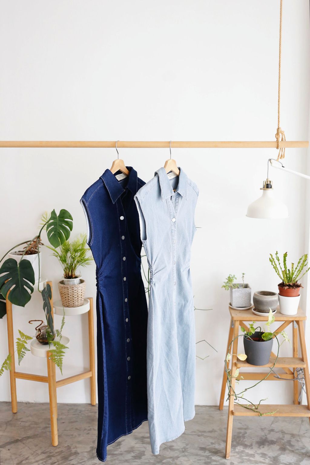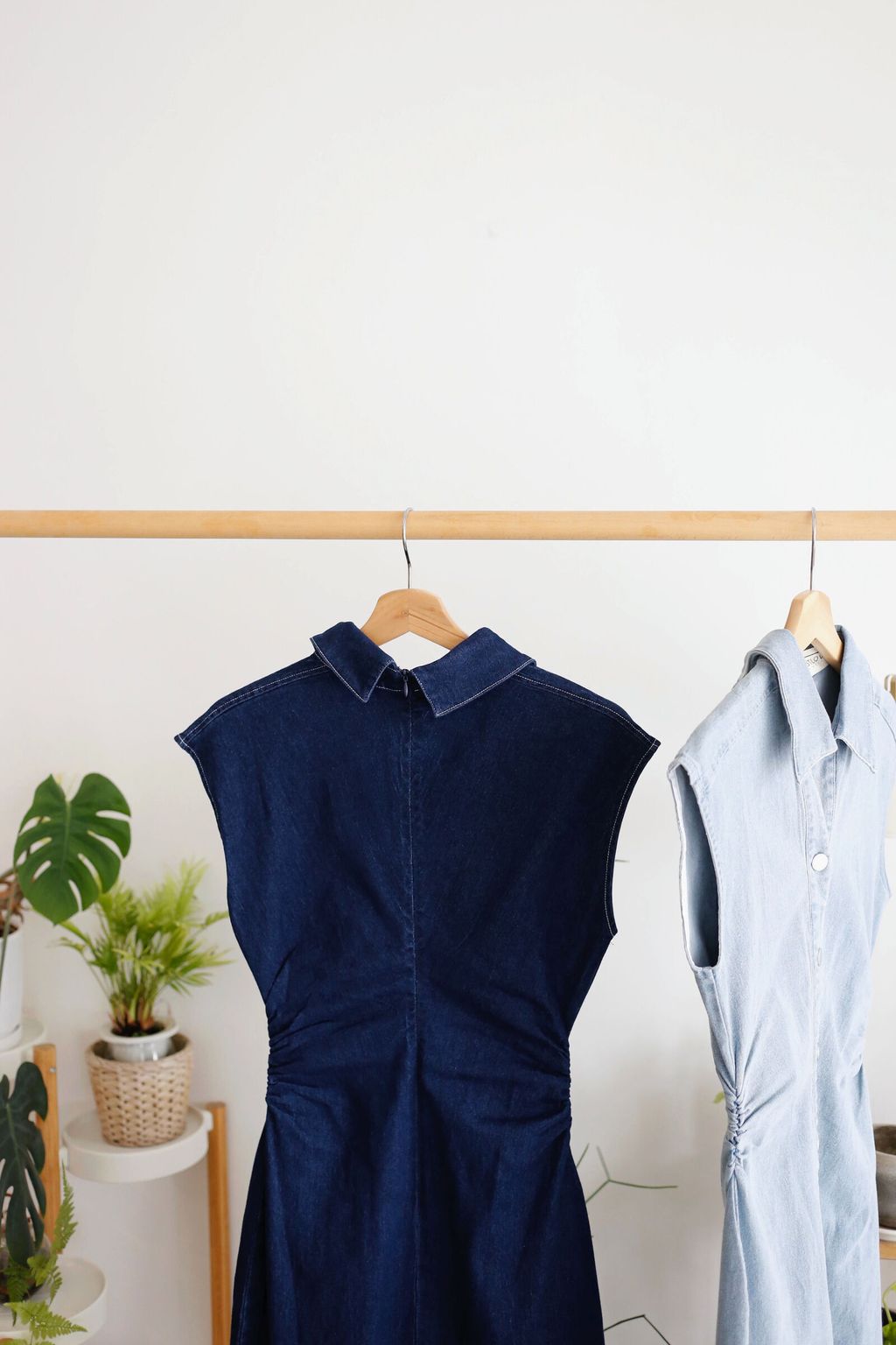 Type: V-Neck Button Denim Dress | PREMIUM SERIES | Stretchable Denim Fabric | Cinched Waist Design | Only First Button is Functional | Back Zipper | Cap Sleeves Design