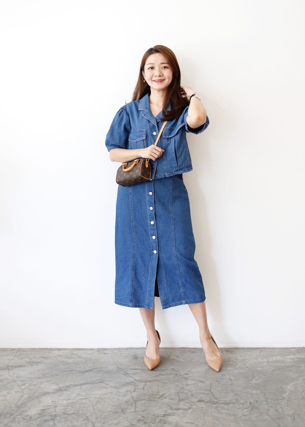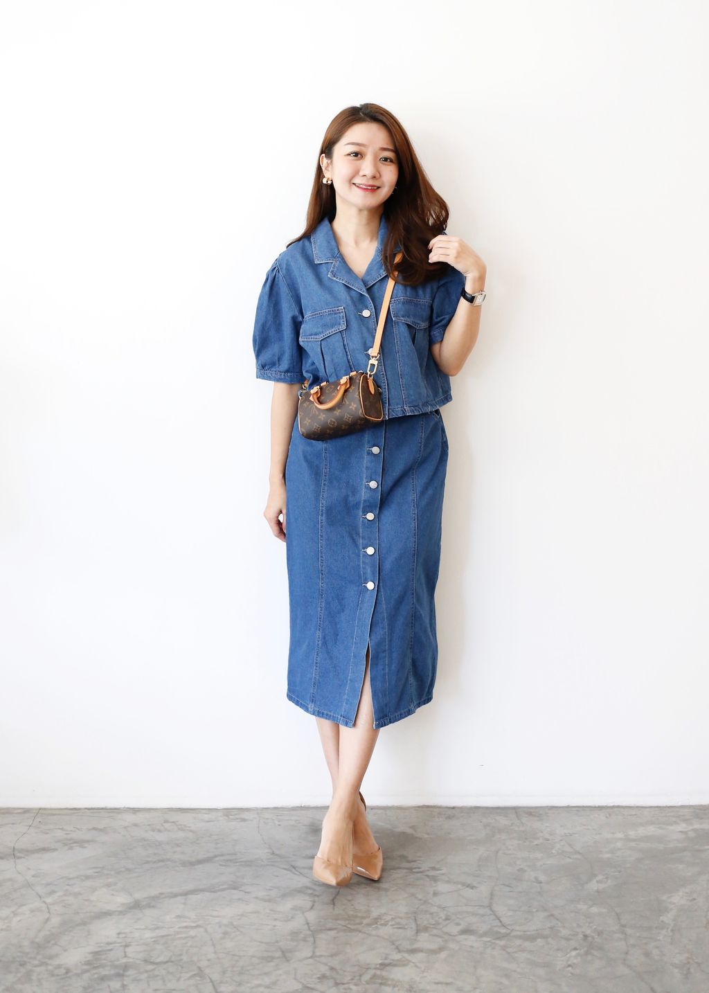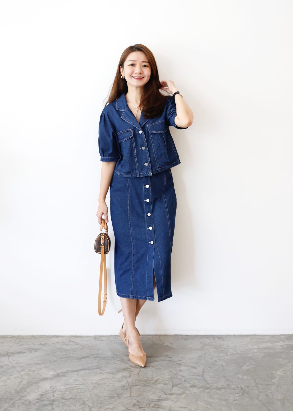 Type: 2PCS Denim Lapel Neck Shirt And Midi Skirt Set | Non Stretchable Denim | Button Through for Top and Bottom | Stretchable Waistband for Bottom