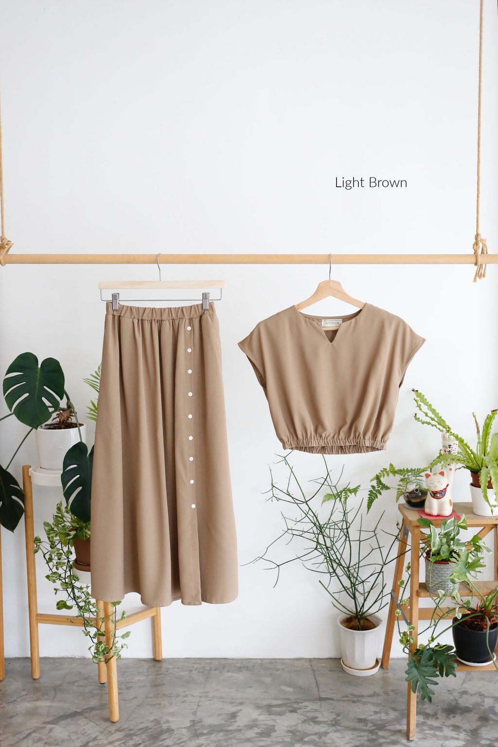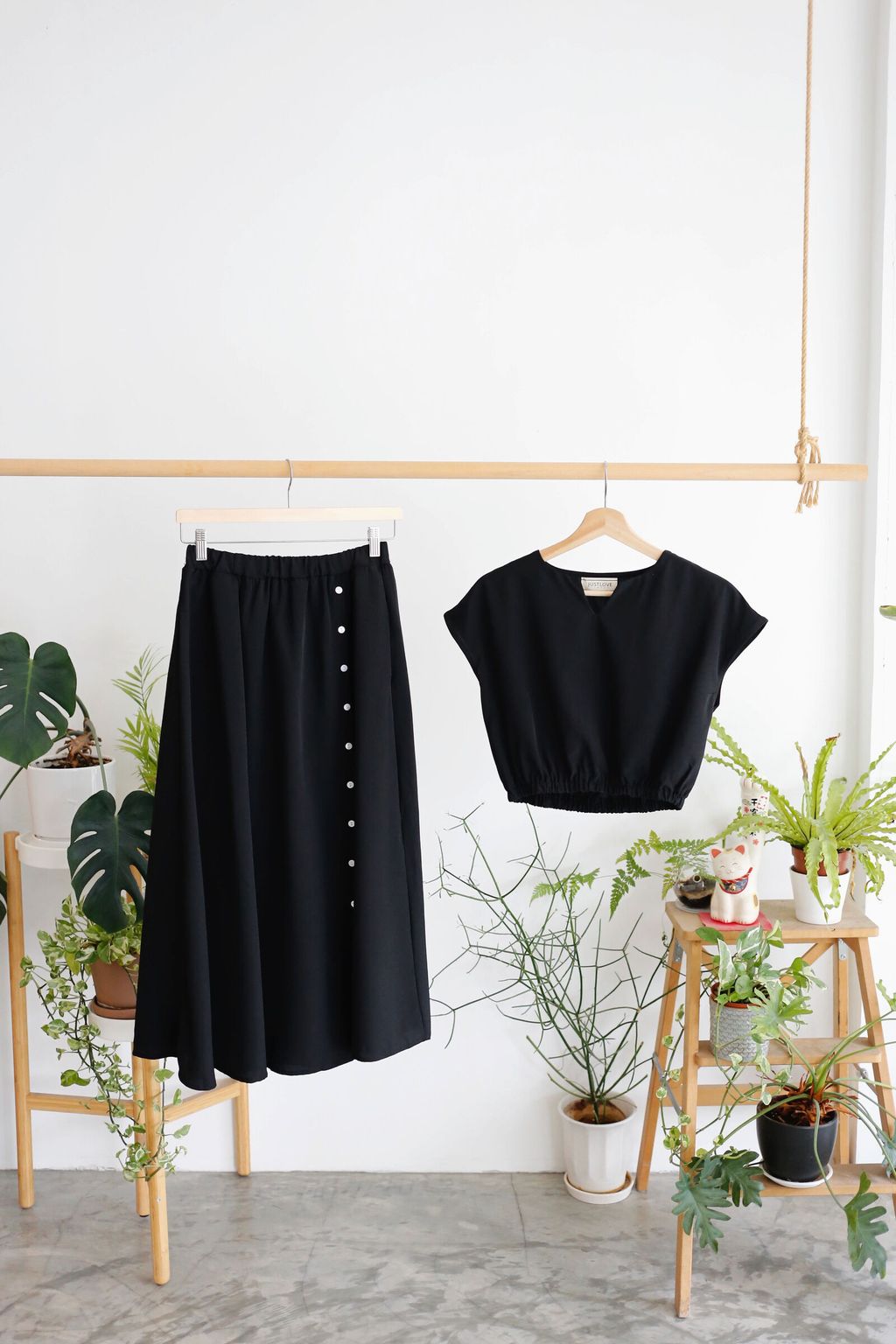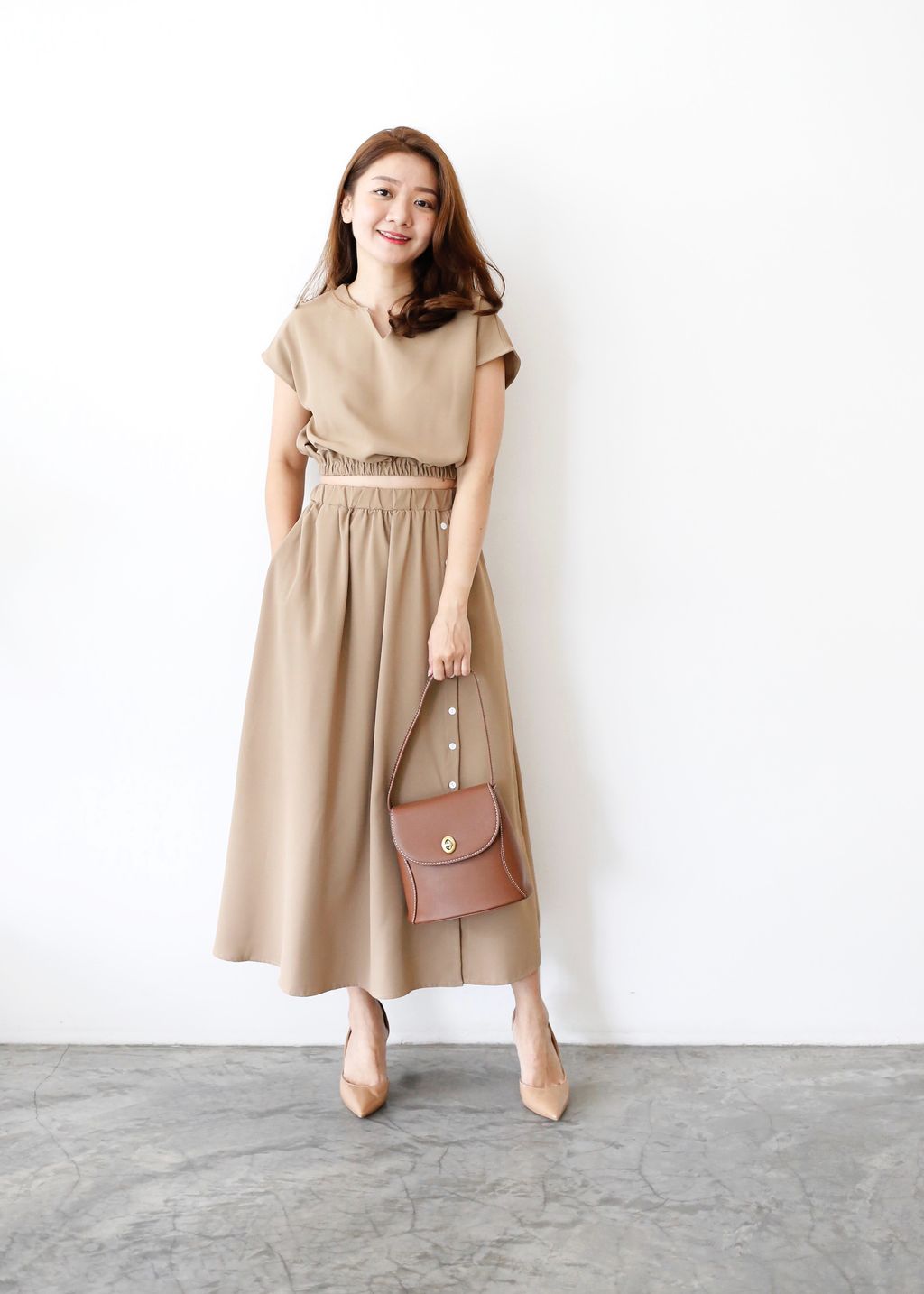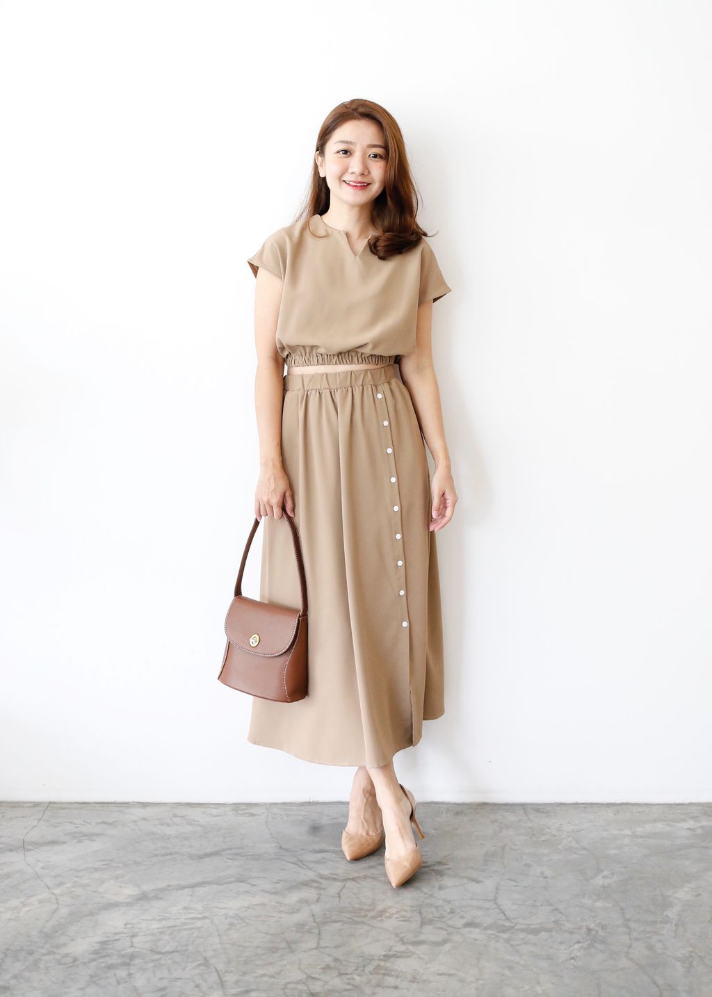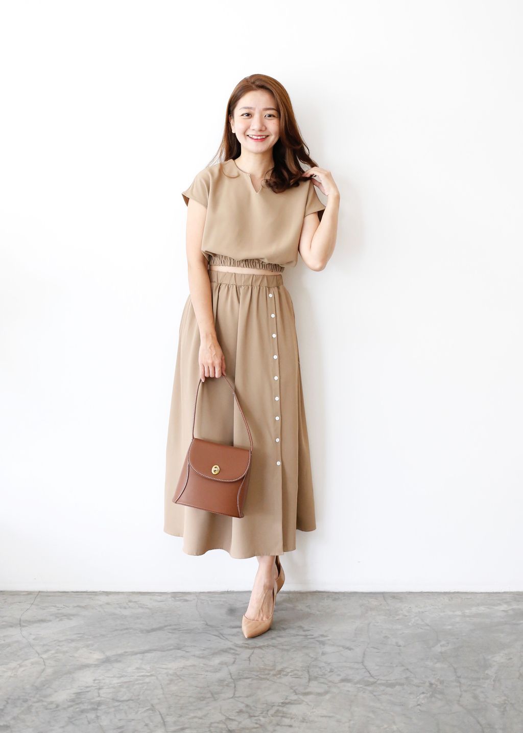 Type: 2PCS Gather Waist Blouse and Front Slit Skirt Set | Soft Polyester Fabric | Stretchable Waistband for Blouse and Skirt | Function Buttons | Side Pockets | Kindly Take Note on Smaller Hips Measurement