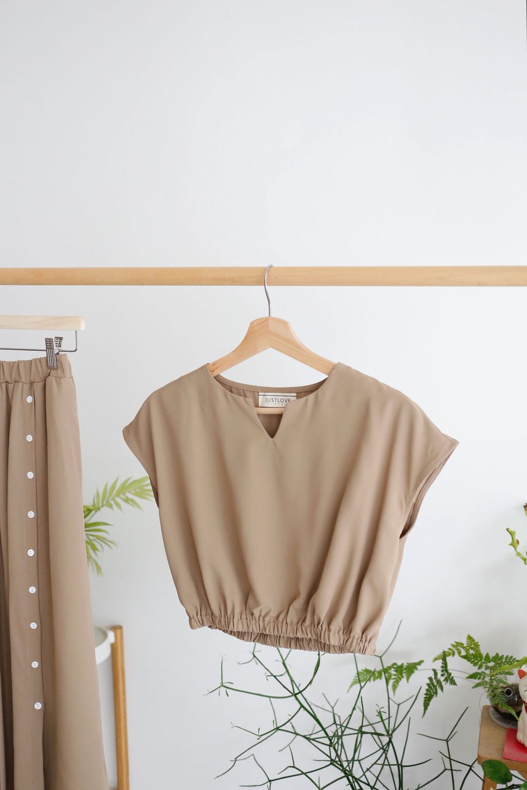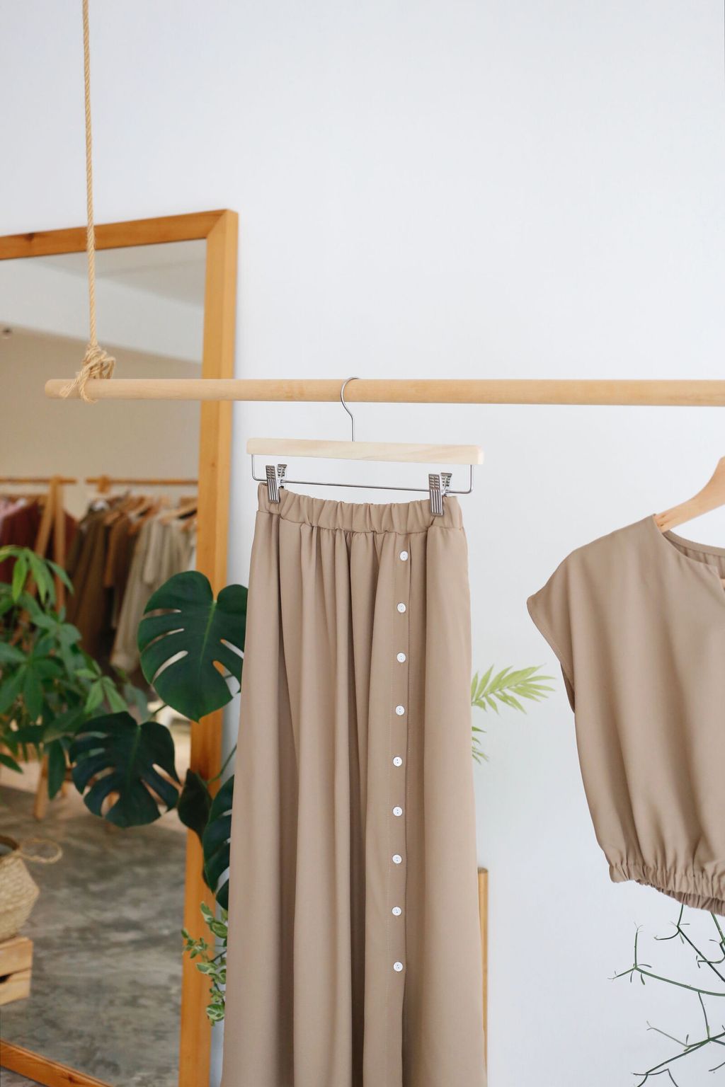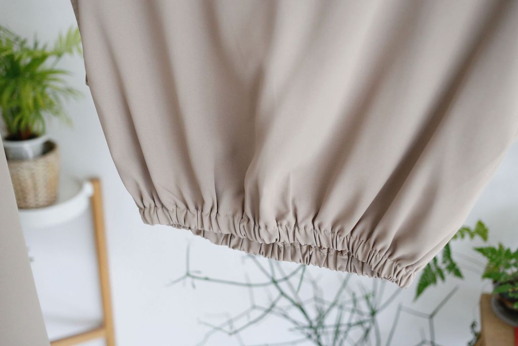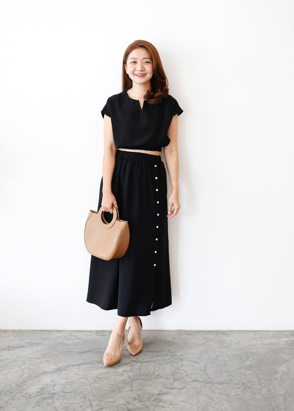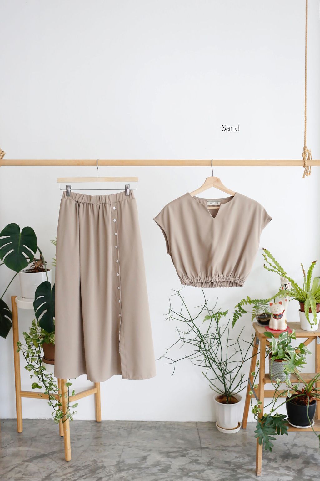 Type: 2PCS Gather Waist Blouse and Front Slit Skirt Set | Soft Polyester Fabric | Stretchable Waistband for Blouse and Skirt | Function Buttons | Side Pockets | Kindly Take Note on Smaller Hips Measurement