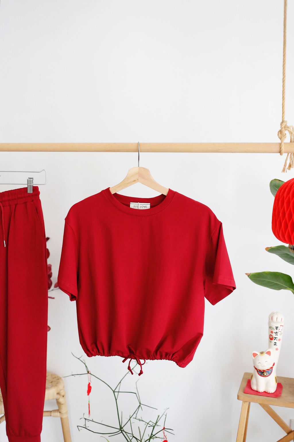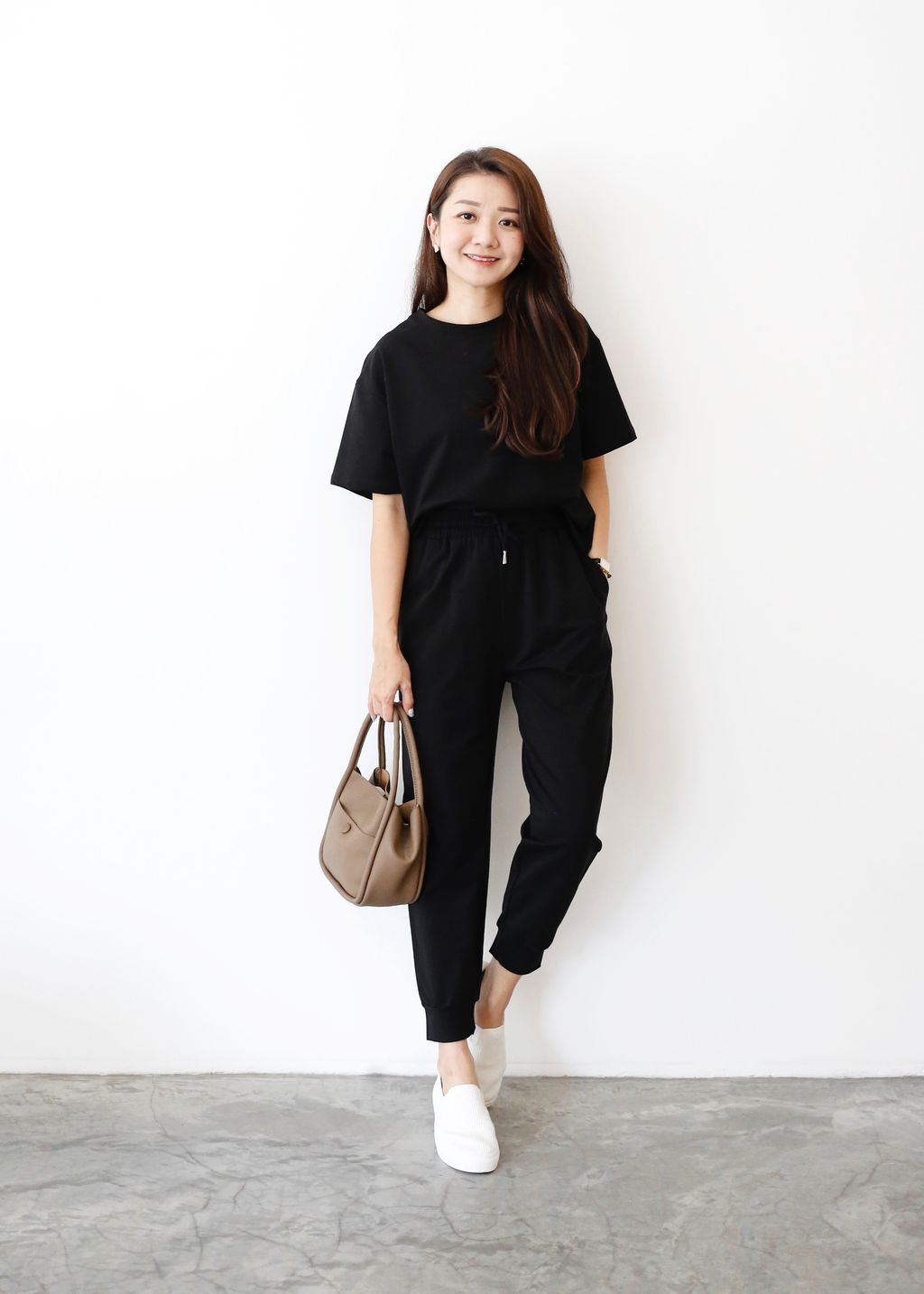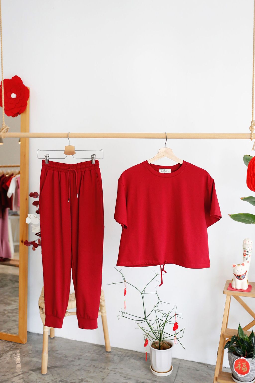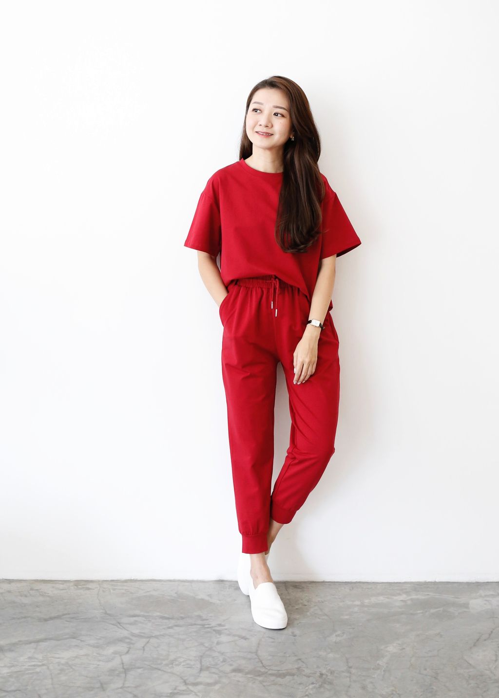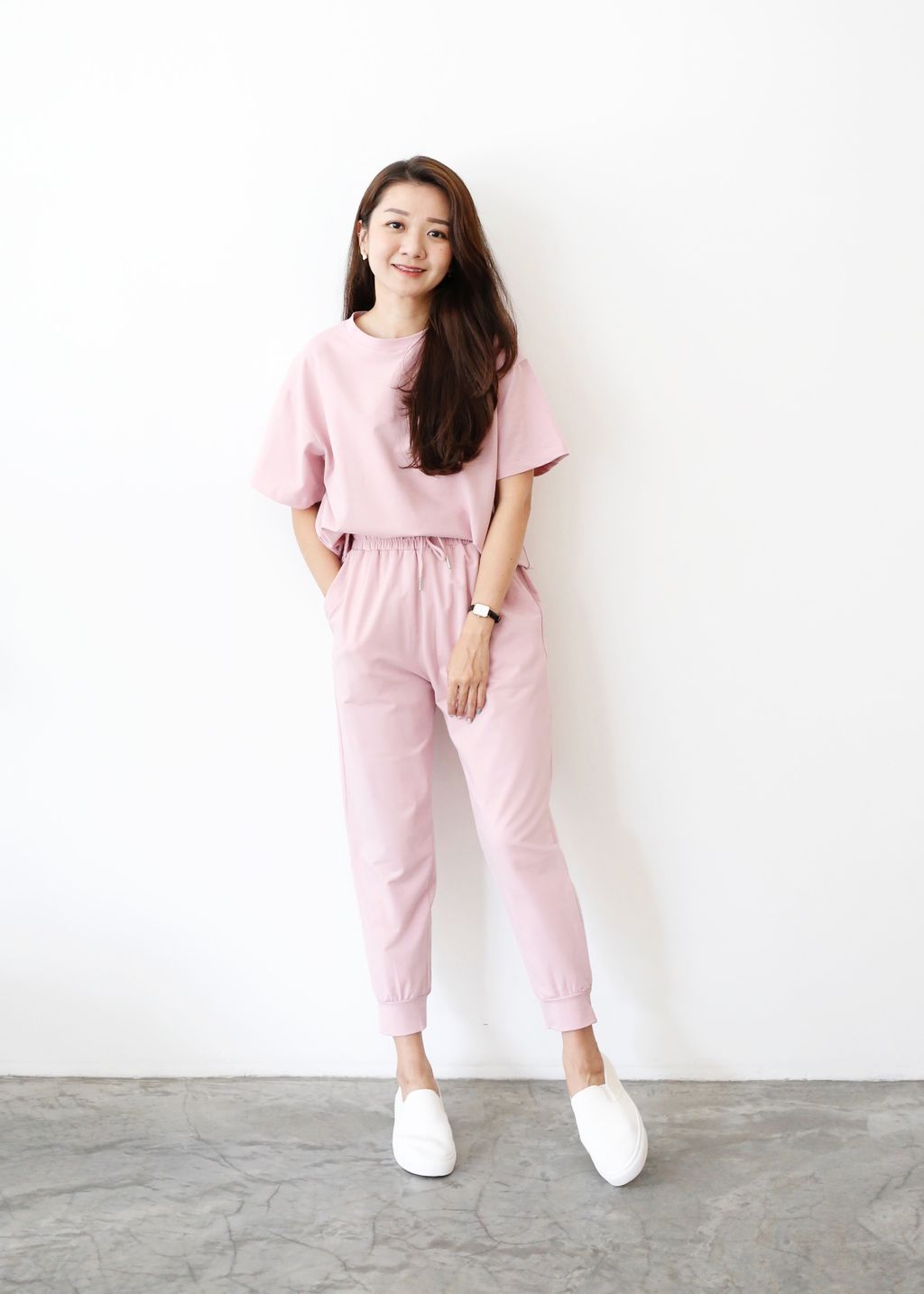 Type: 2PCS Waist Drawstring Tee and Jogger Pants Set | Stretchable Cotton Fabric | Waist Drawstring For Top | Stretchable Waistband and Drawstring for Pants | Side Pockets