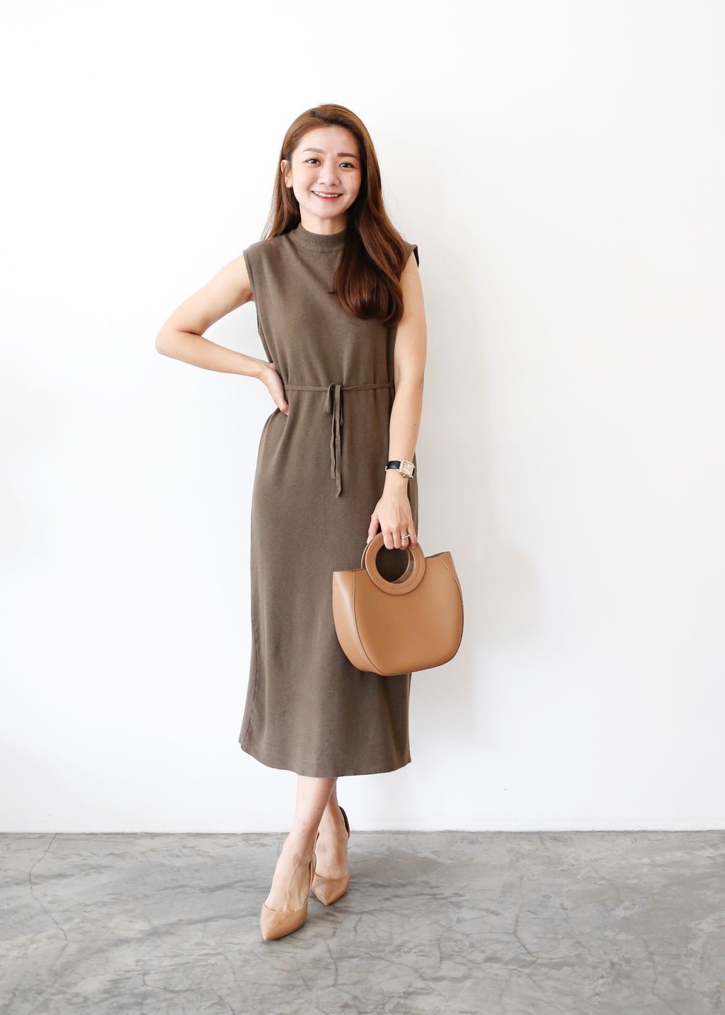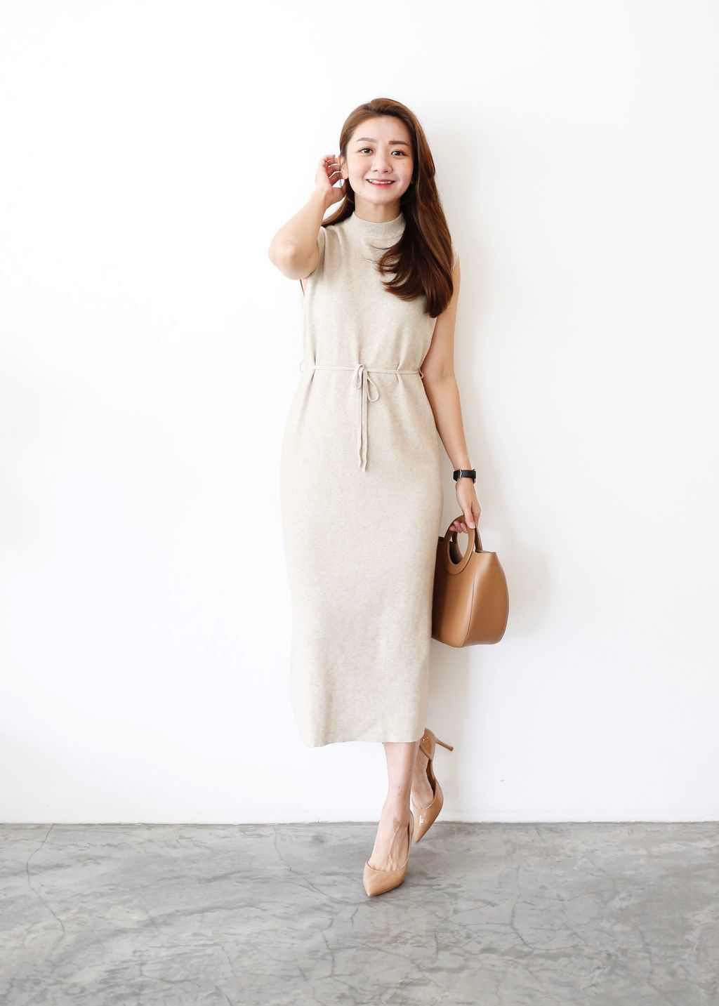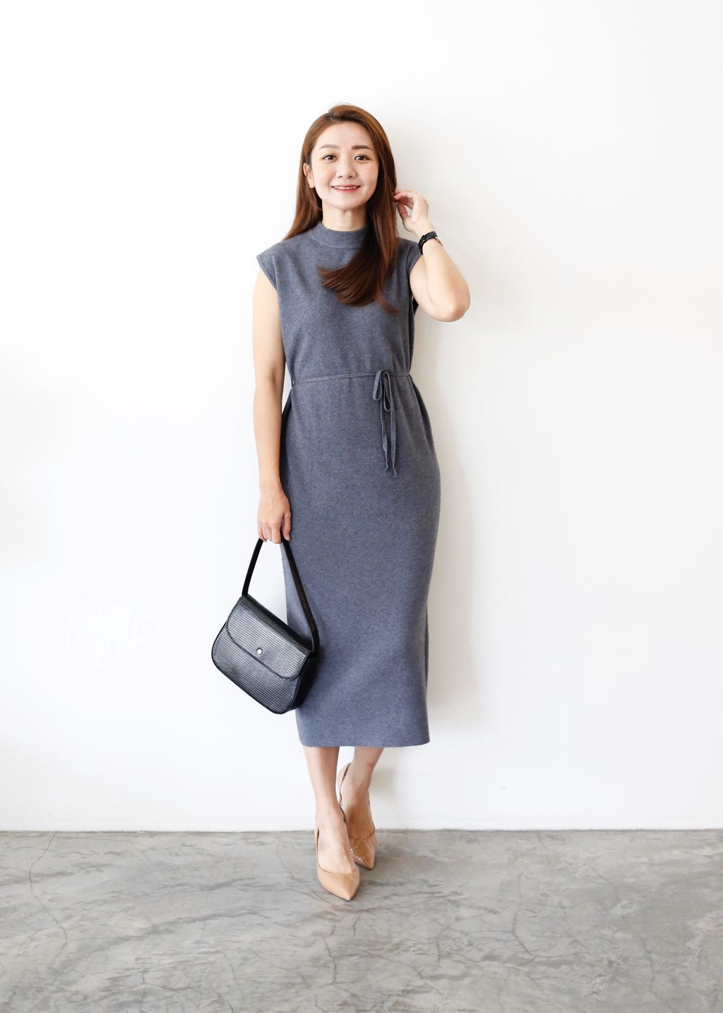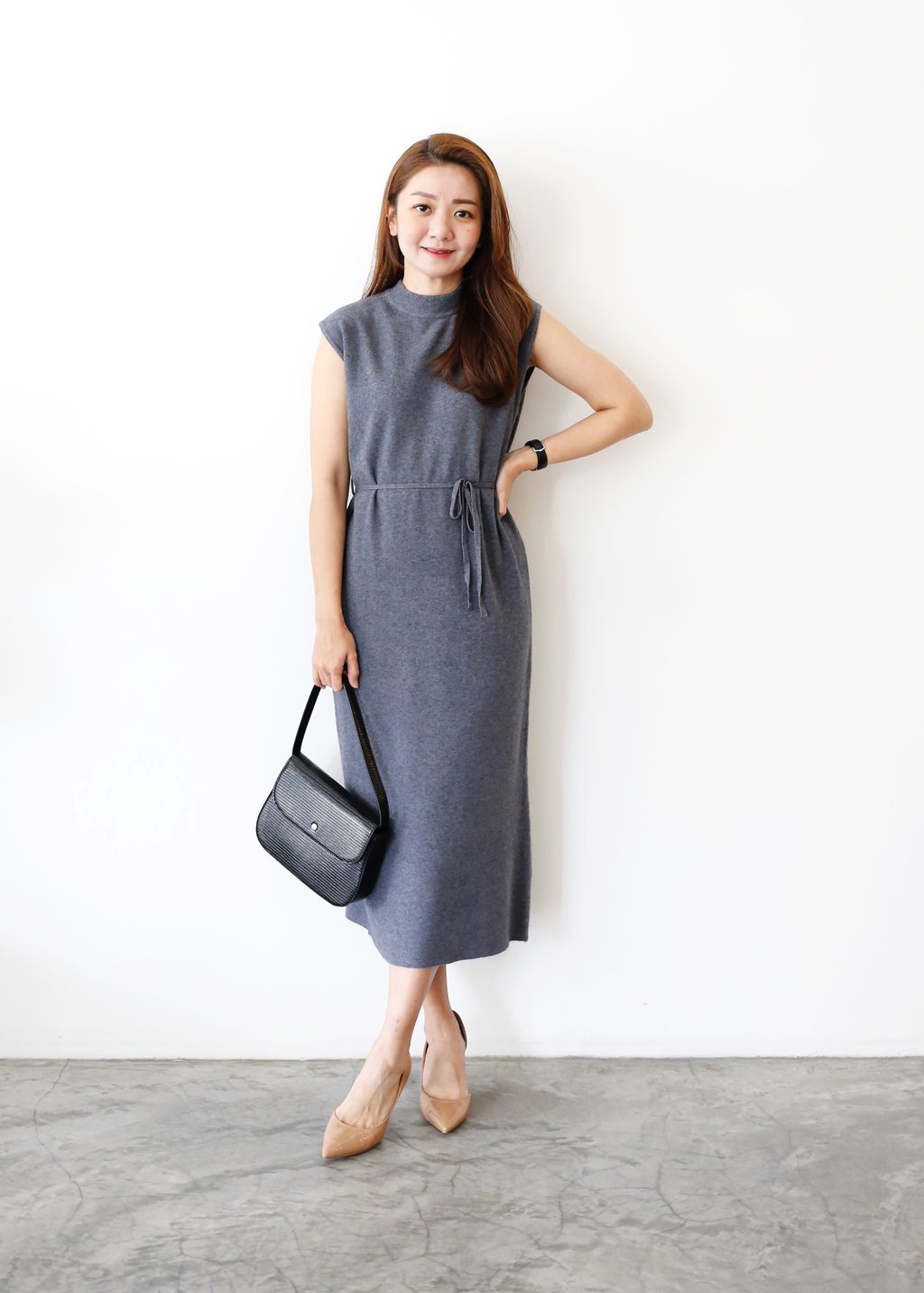 Type: Cap Sleeves Knitted Midi Dress | Stretchable Knit | Crew Neck Design | Comes with String Belt