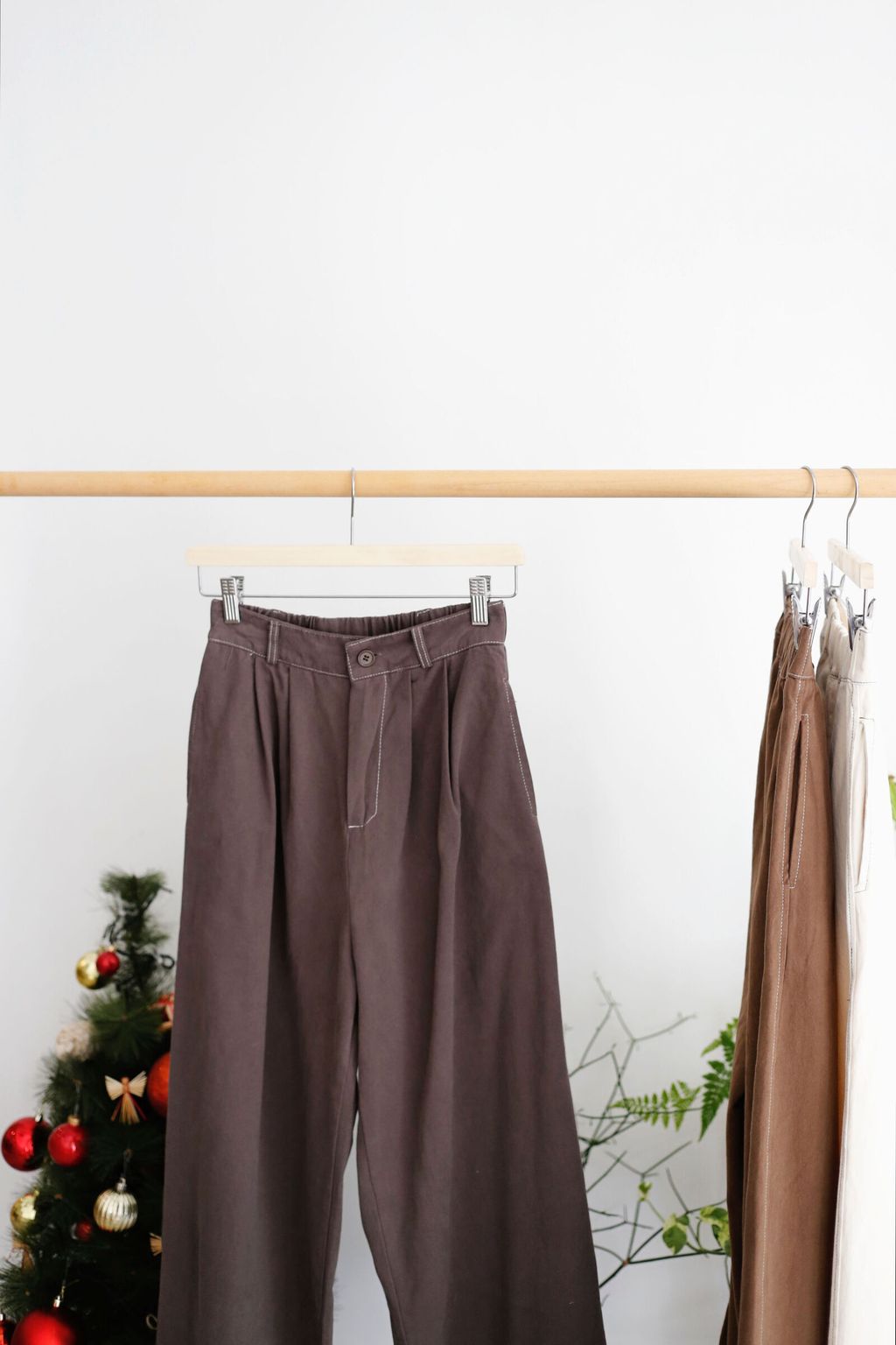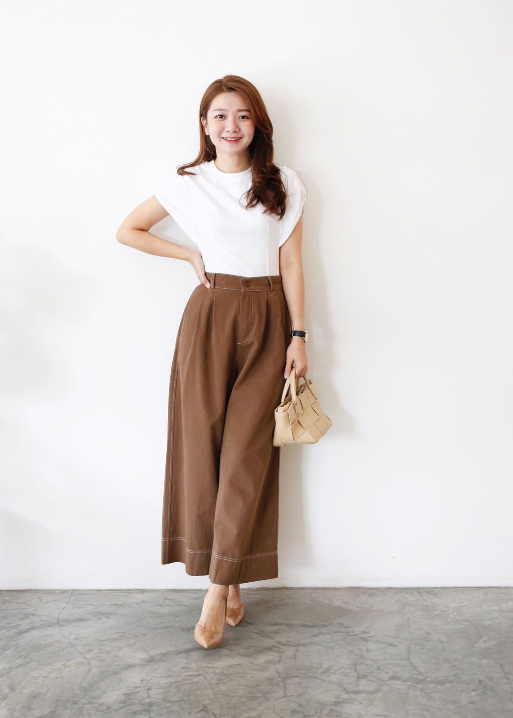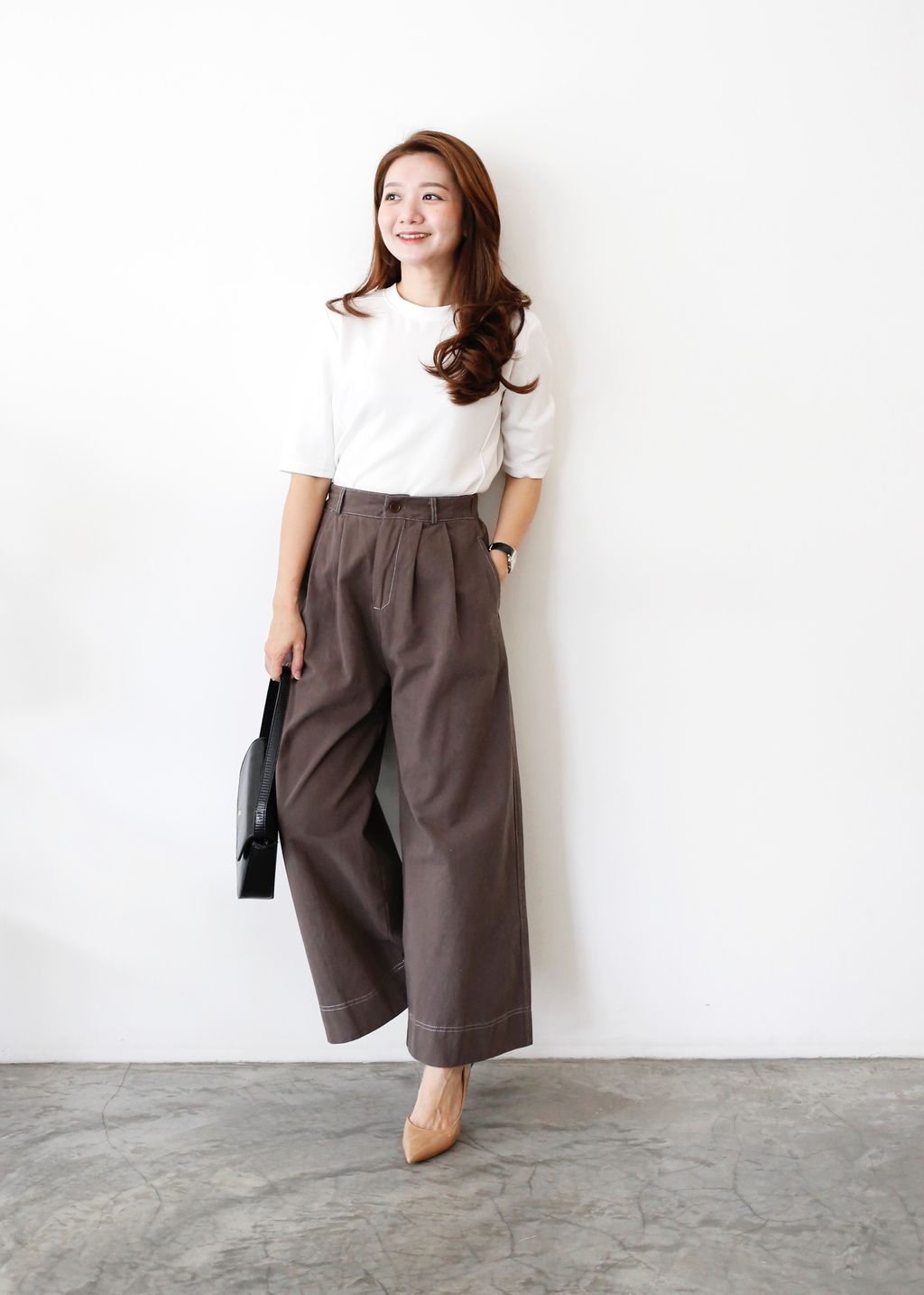 Type: Contrast Stitch Wide Leg Pants | Cotton Fabric | Stretchable Waistband | Side Pockets | Front Zipper