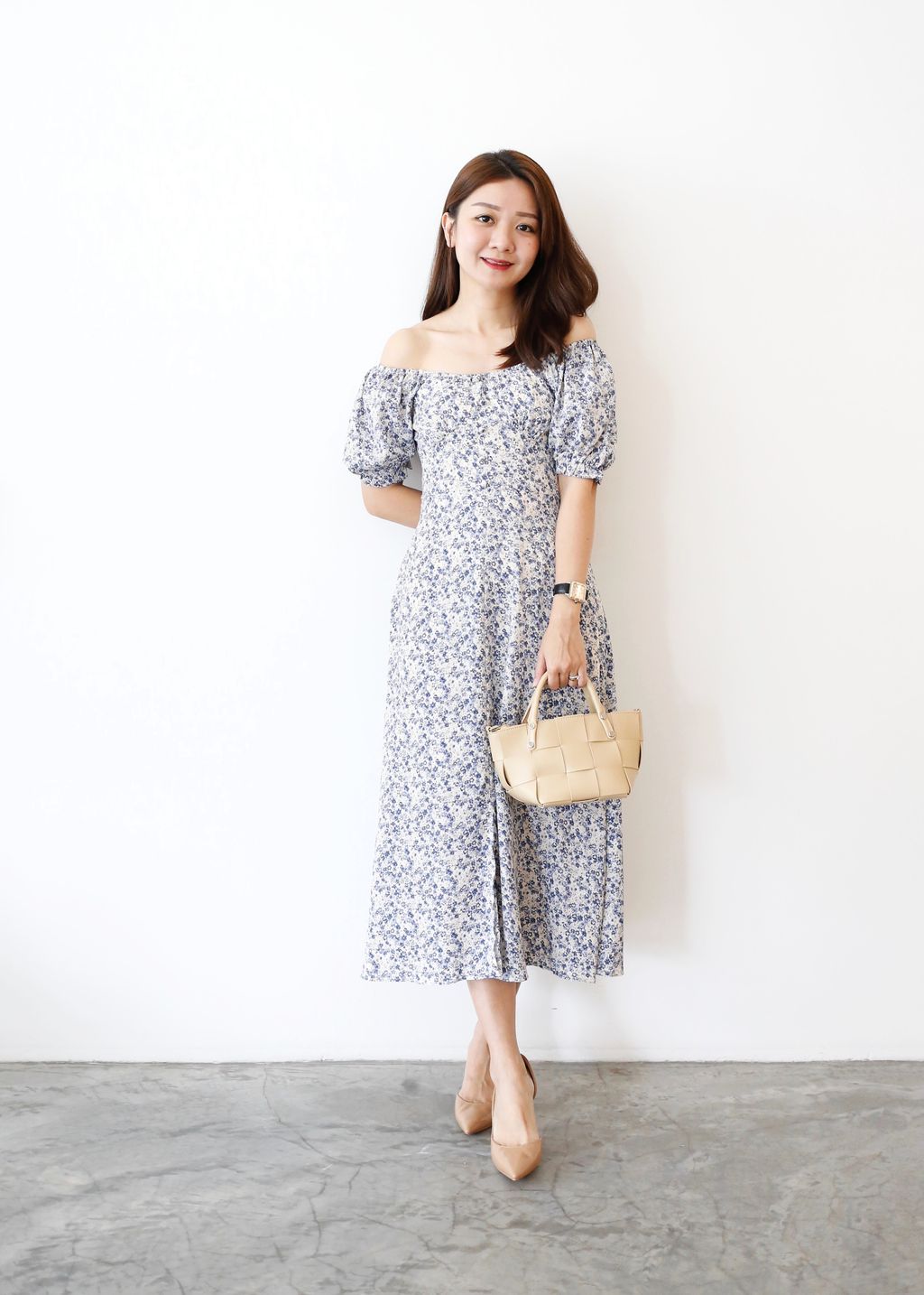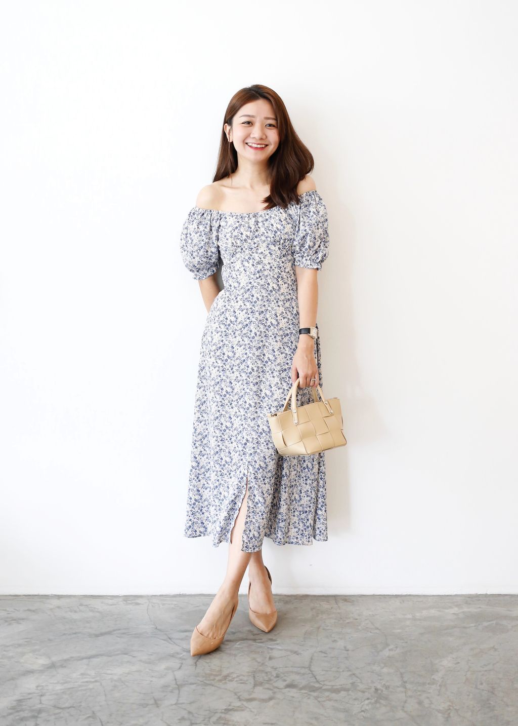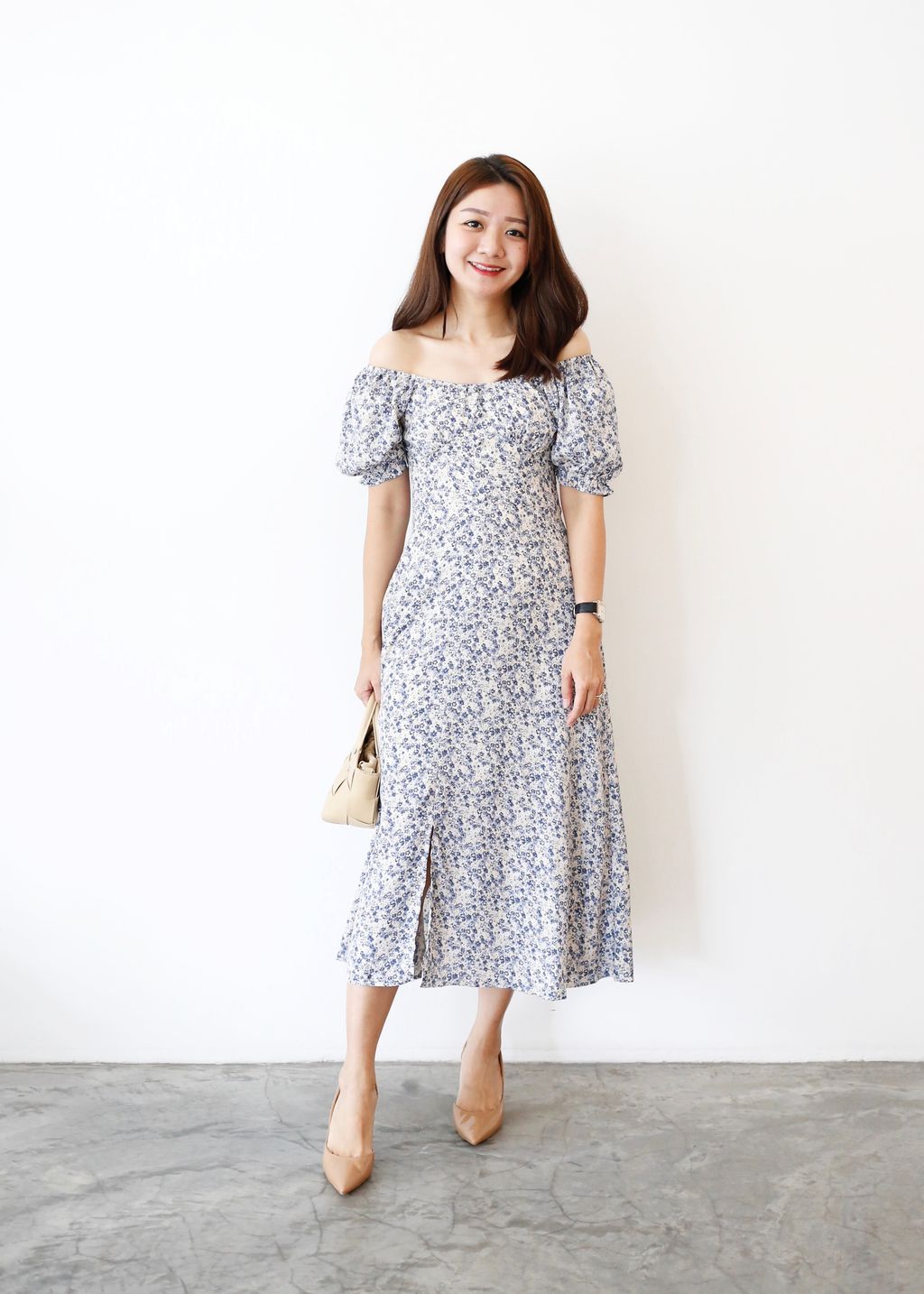 Type: Drop Shoulder Floral Midi Dress | Chiffon Fabric with Lining | Side Zipper | Front Slit Hem Design