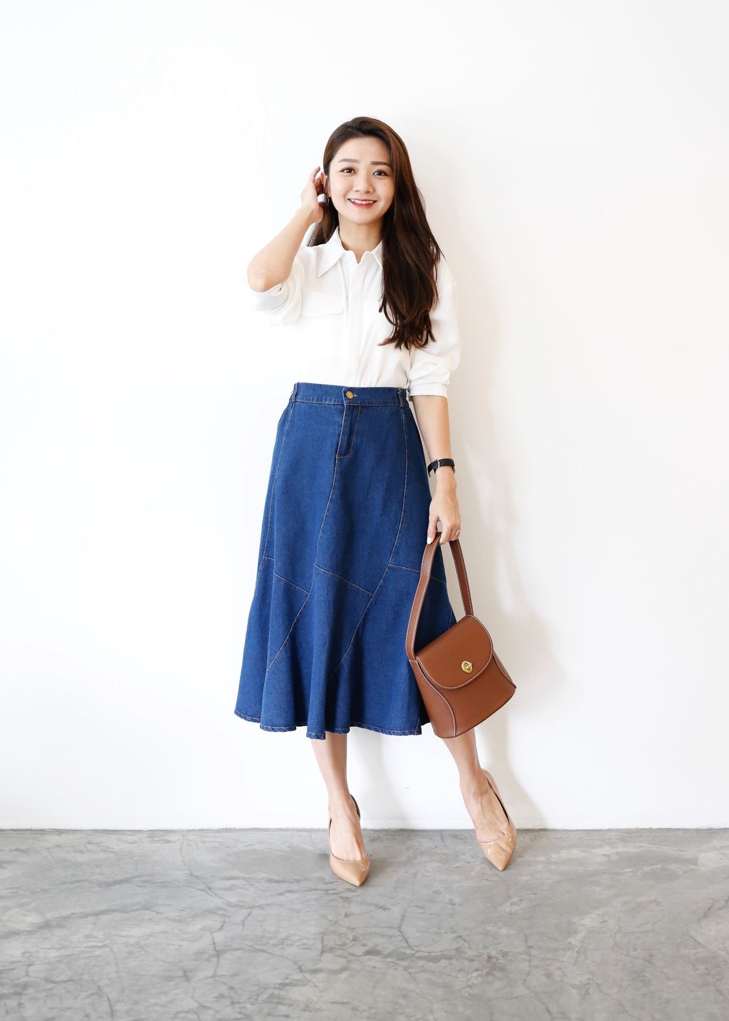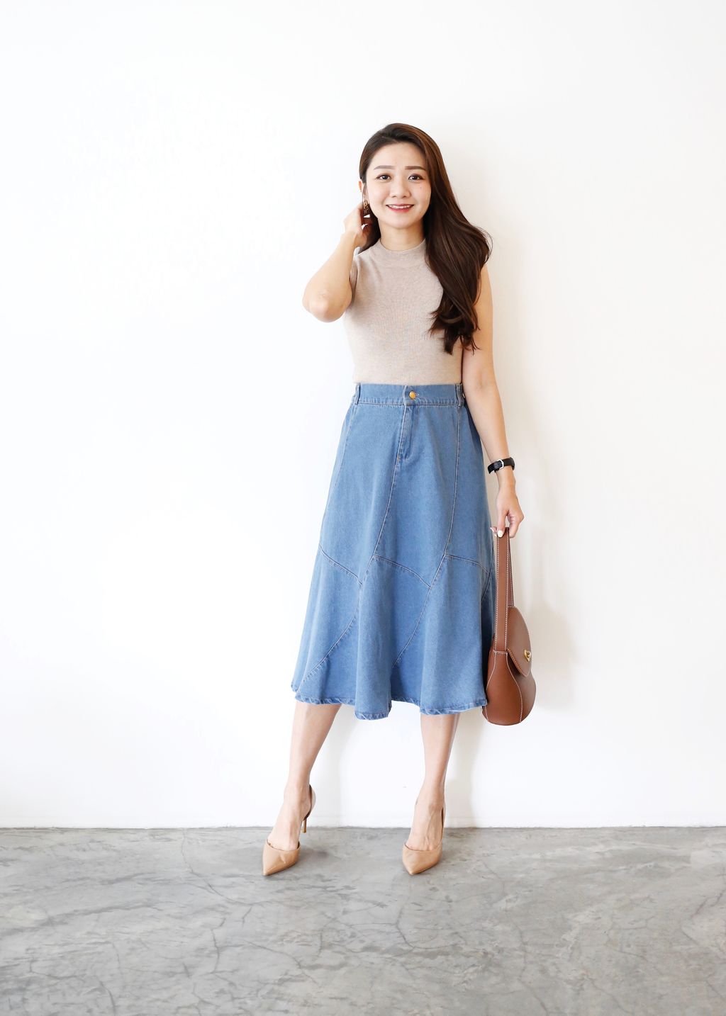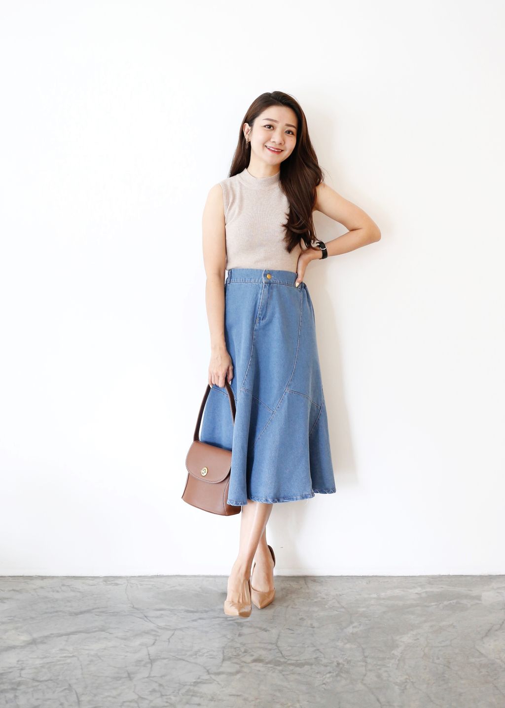 Type: Flared Hem Denim Midi Skirt | Stretchable Waistband | Non-Stretchable Denim | Front Zipper