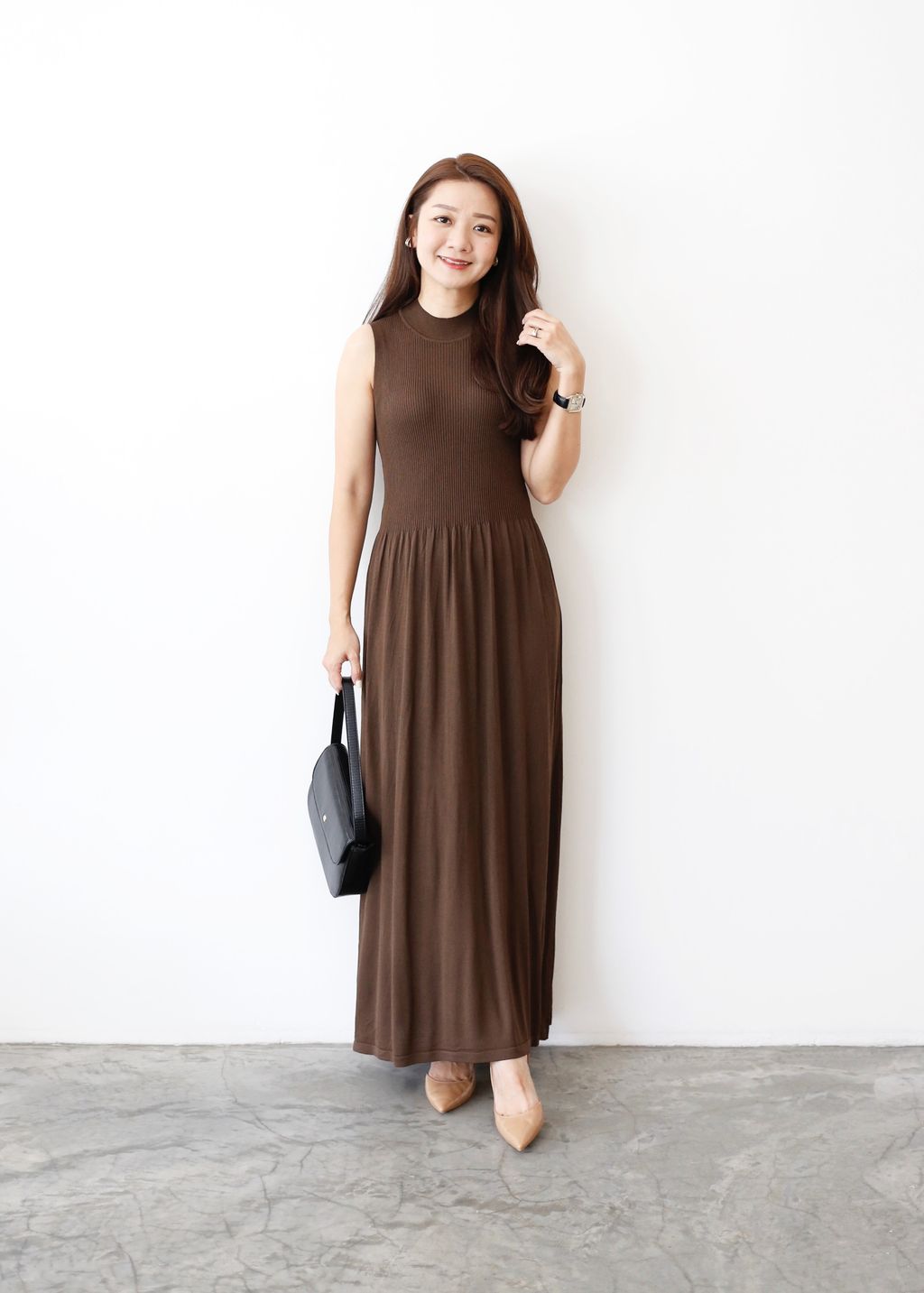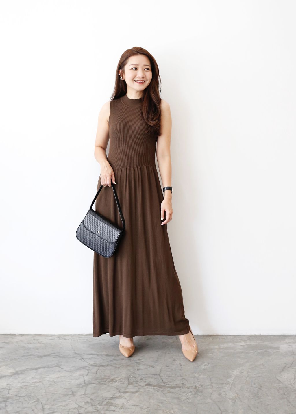 Type: Mock Neck Ribbed Maxi Dress | Stretchable Rib Knit | Kindly Hand-Wash and Lay Flat to Dry | Brown Slightly Longer
