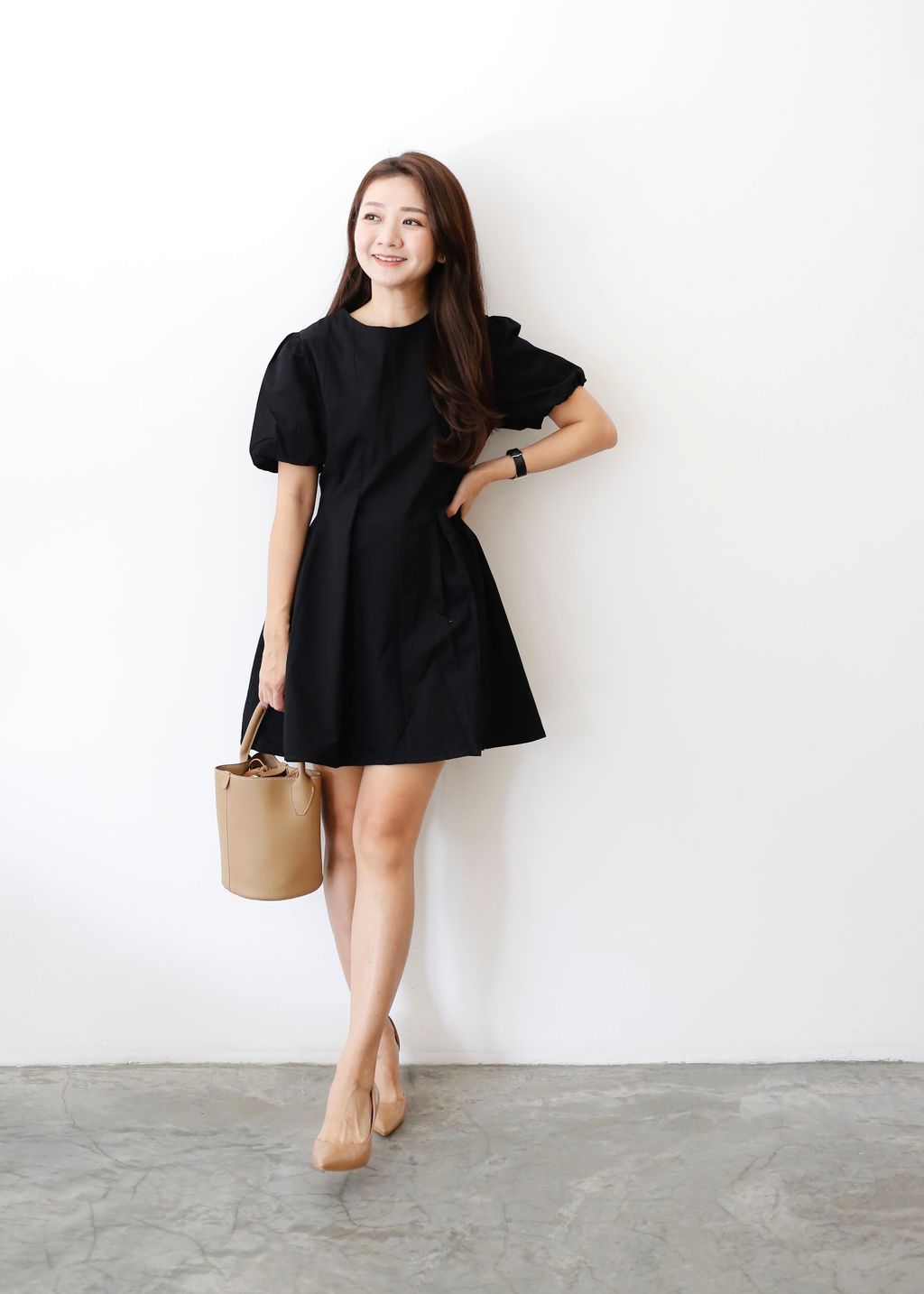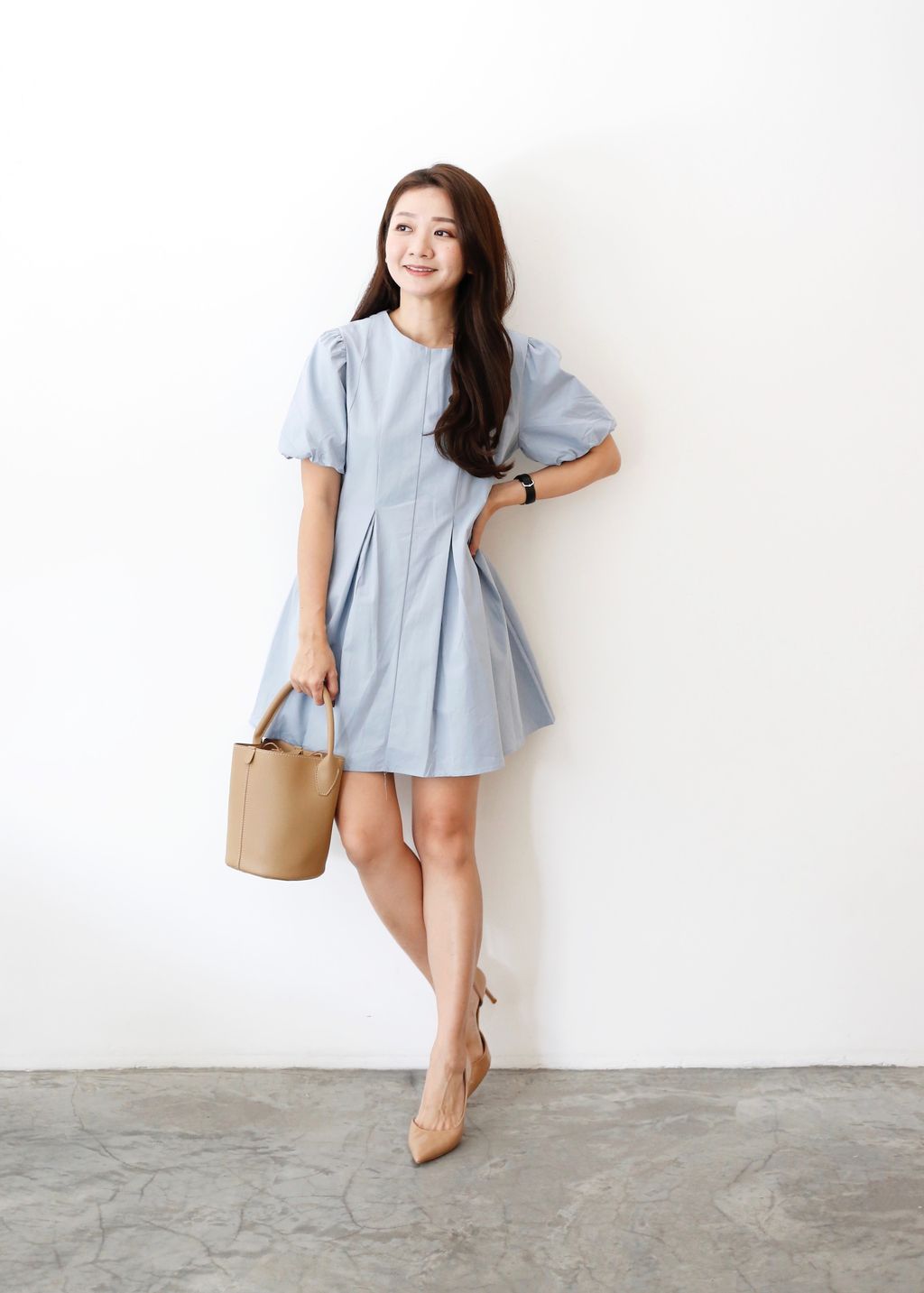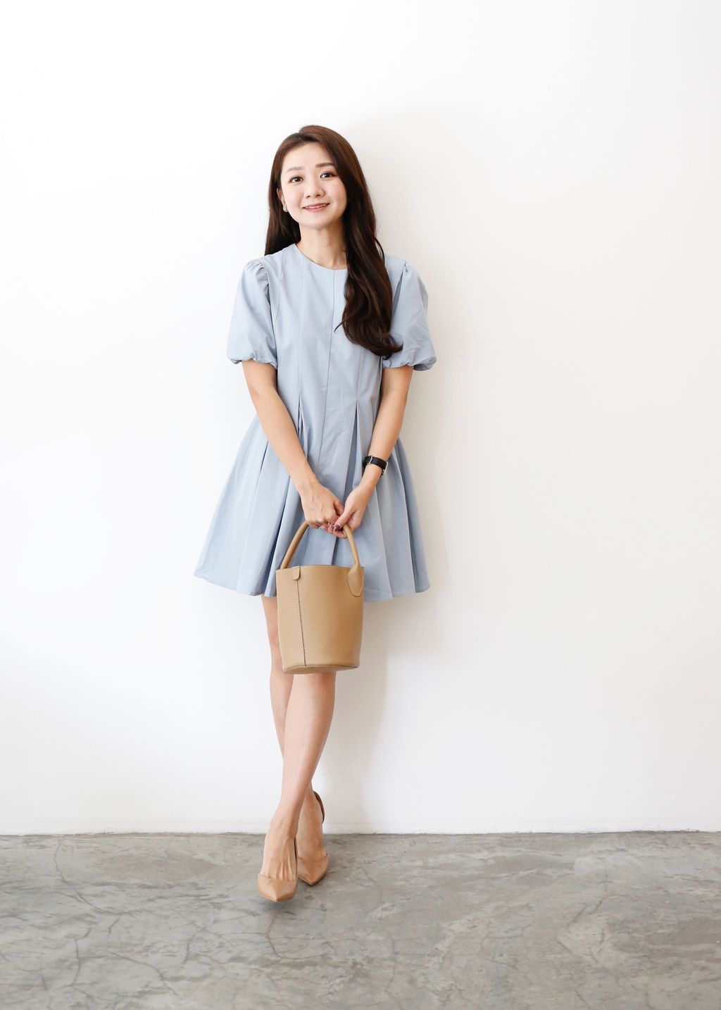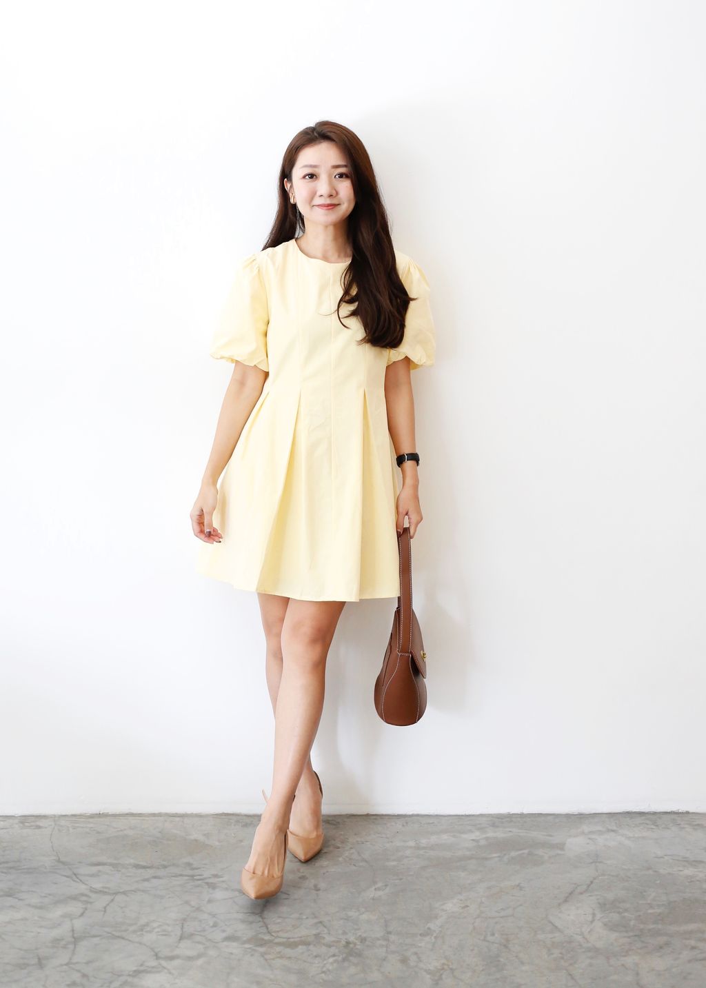 Puffy Sleeves Pleated Flared Hem Dress