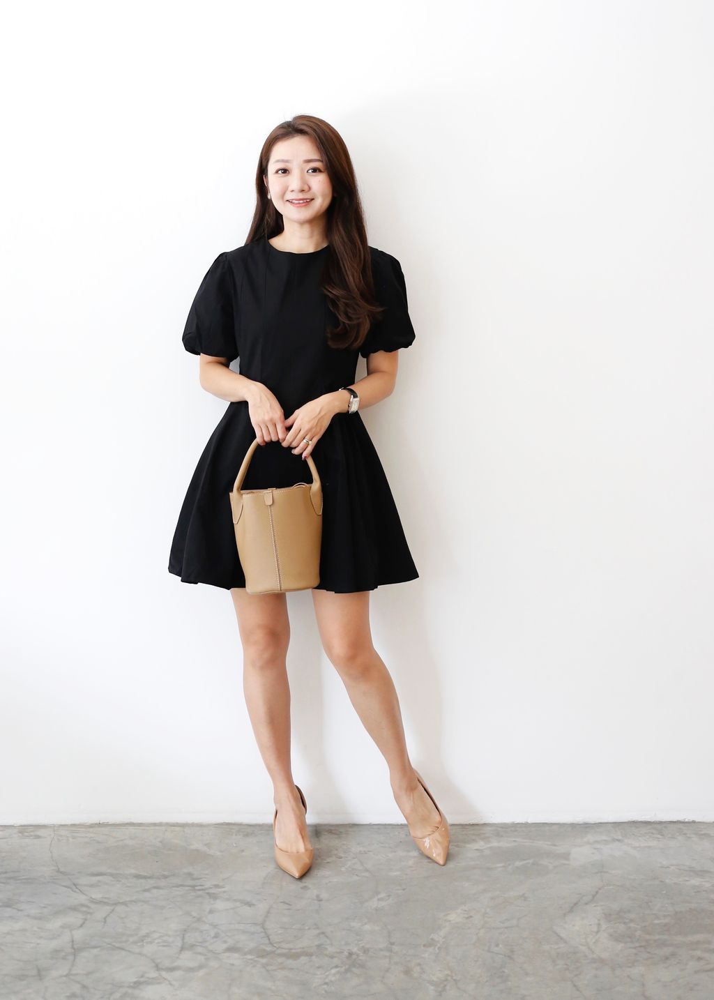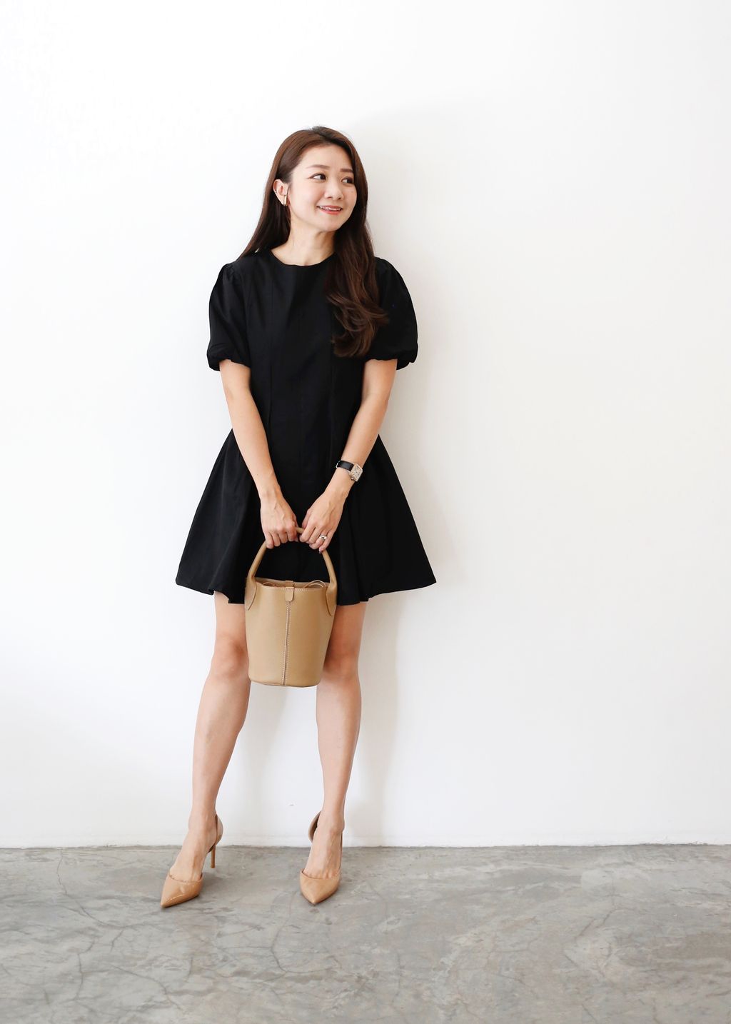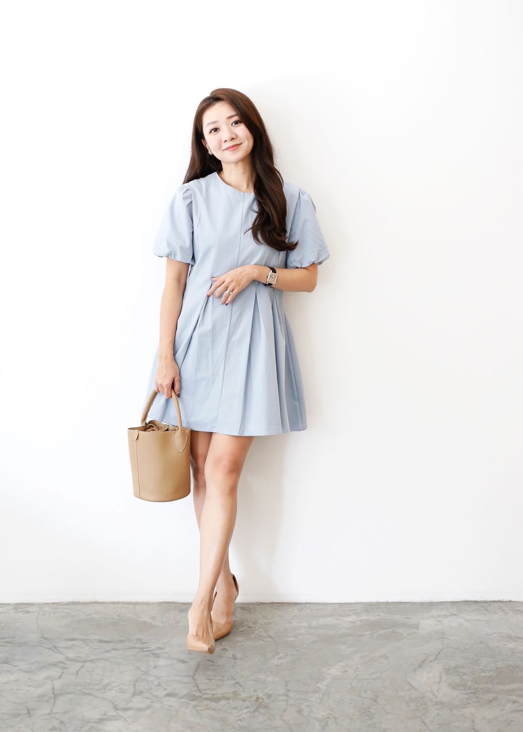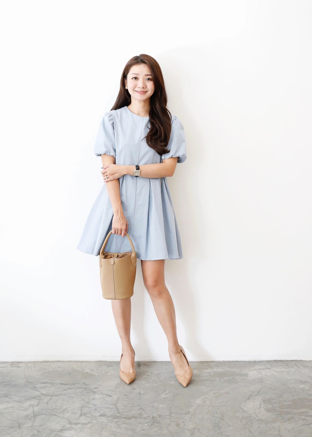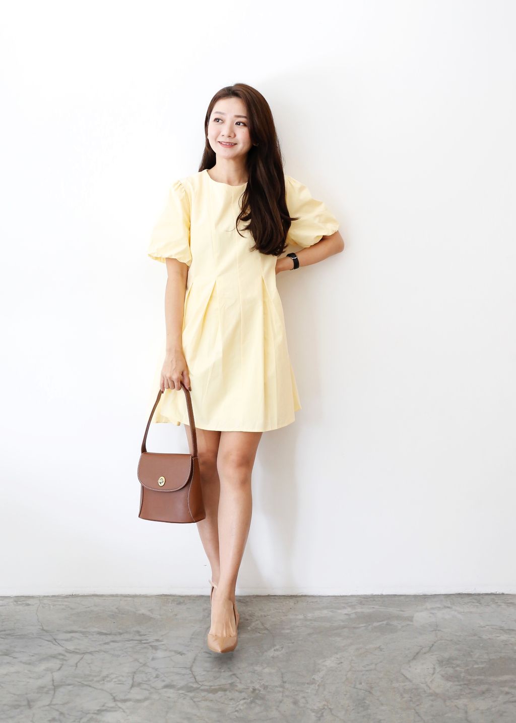 Puffy Sleeves Pleated Flared Hem Dress