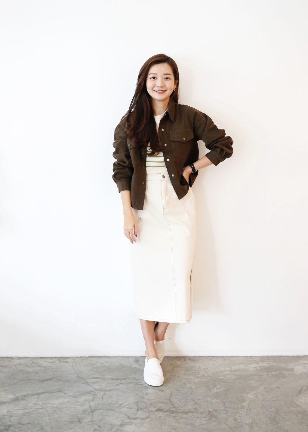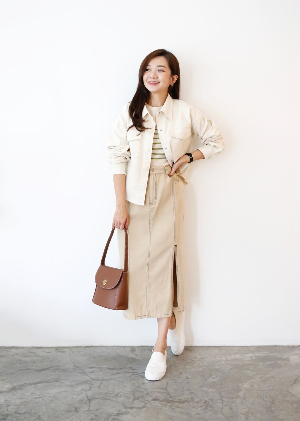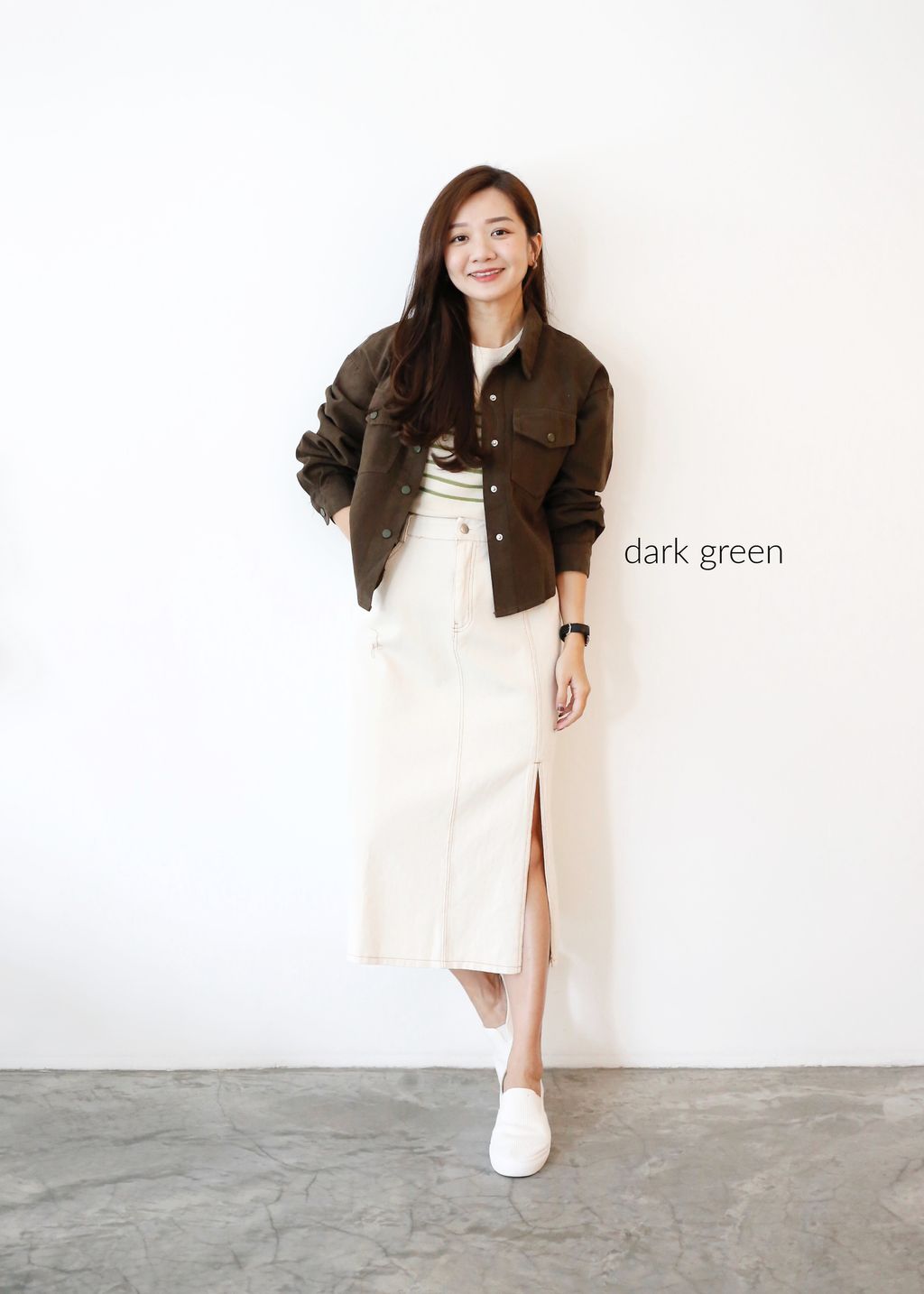 Type: Side Slit Denim Midi Skirt | Soft Denim Fabric | Stretchable Waistband | Front Zipper | Side Pockets | Waist Slightly Loose for S Body Size