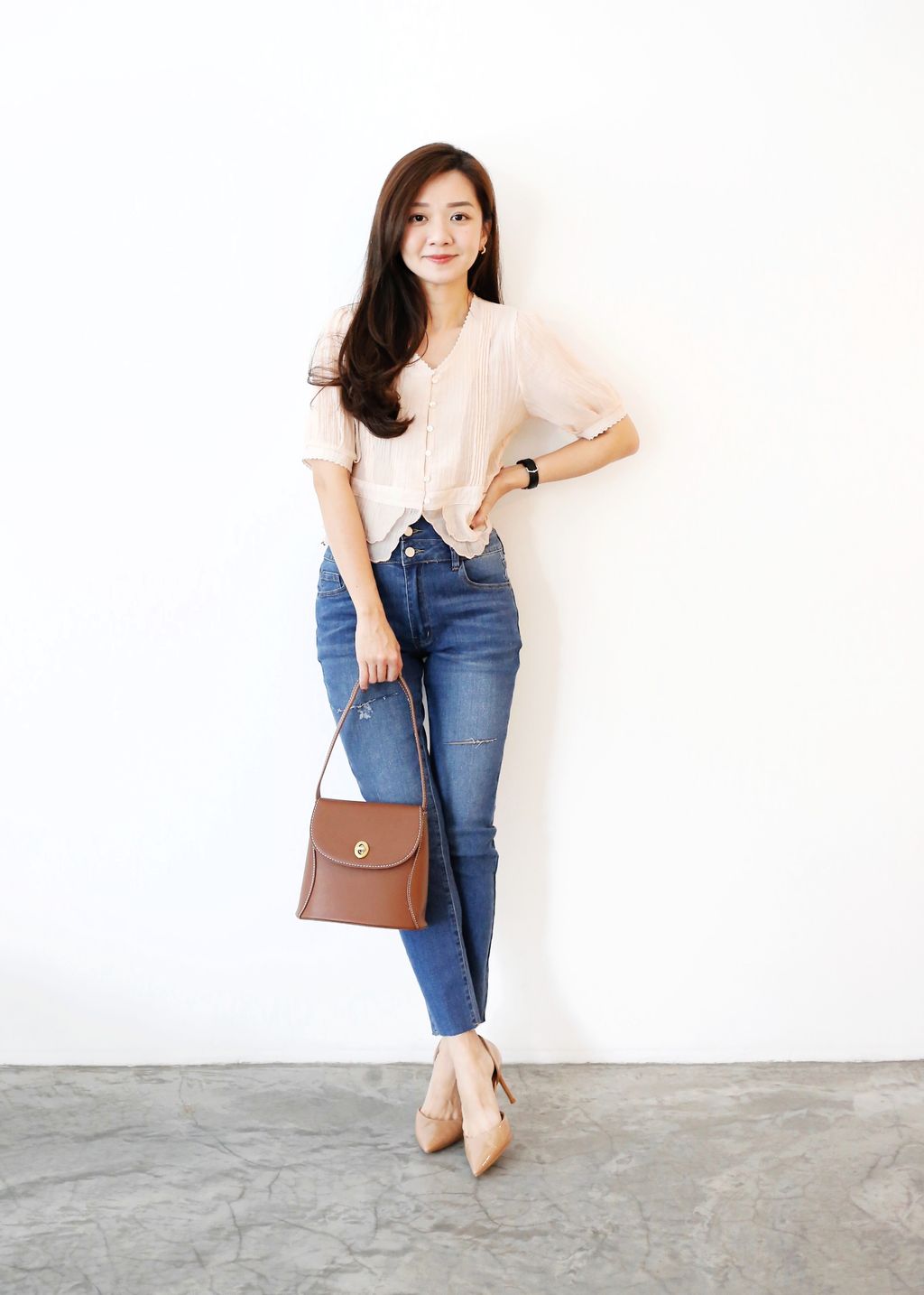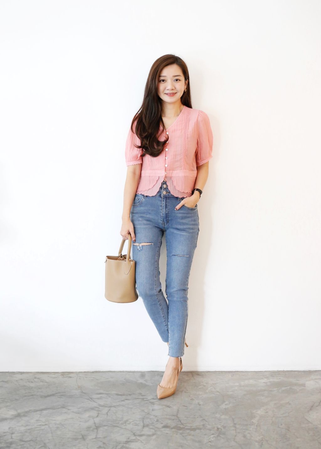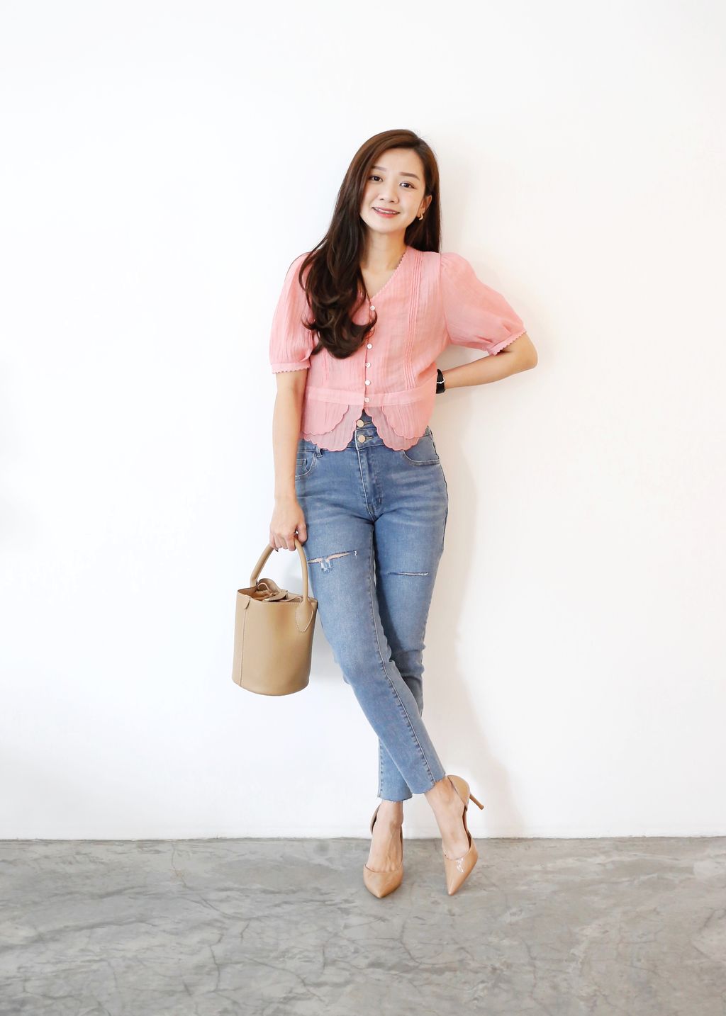Type: Tiered Scallop Hem Soft Blouse | Button Throught | Crepe Chiffon | Front Pleated Design | Comes with Separate Inner Top | Hand-Wash