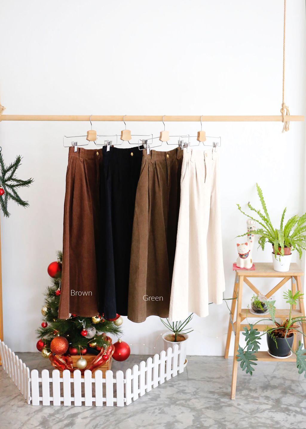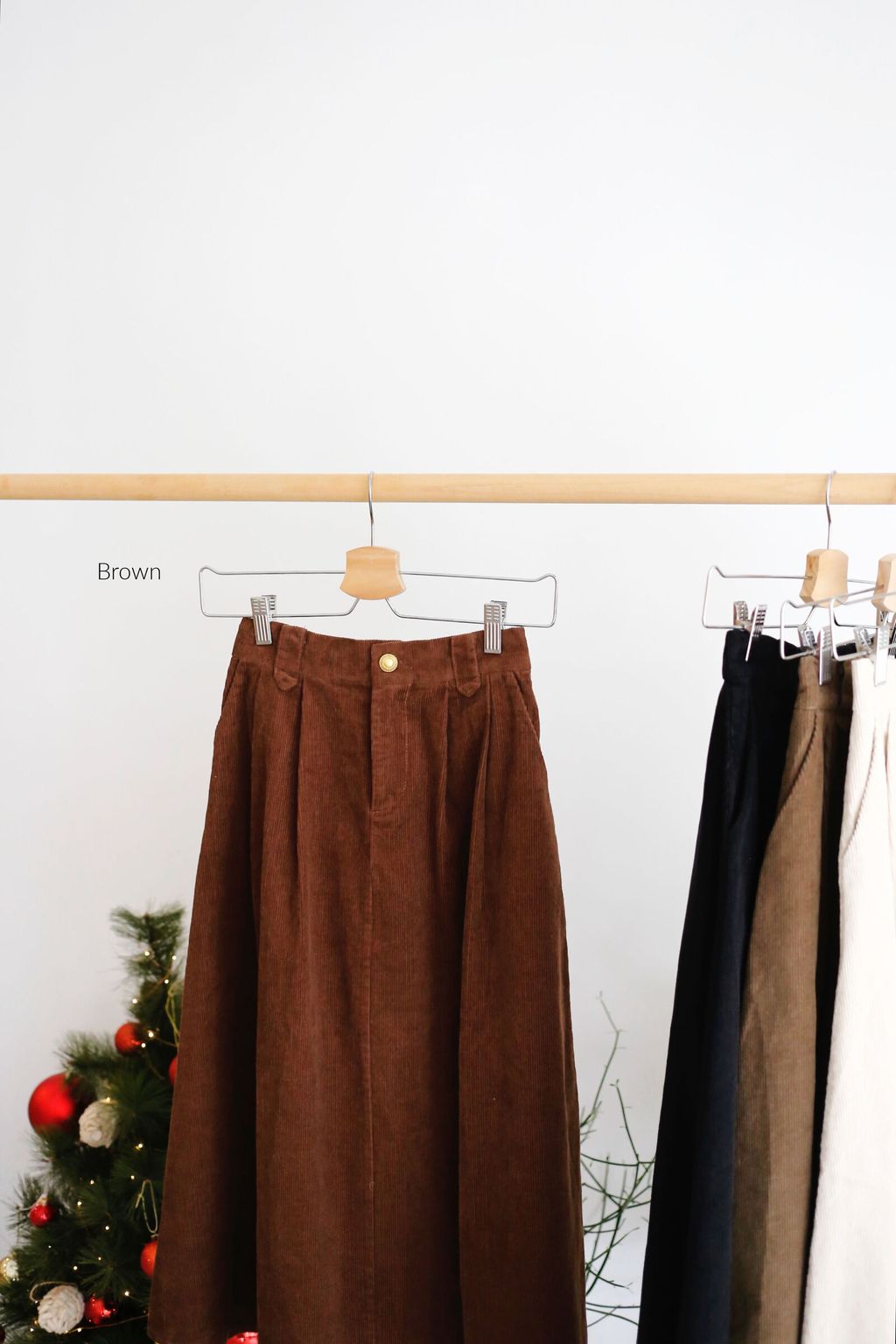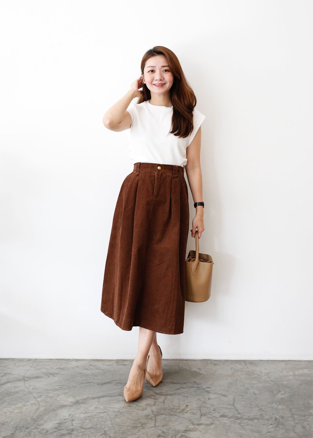 Type: Waist Pleated Corduroy Midi Skirt | Corduroy Fabric | Stretchable Waistband | Front Zipper | Side Pockets