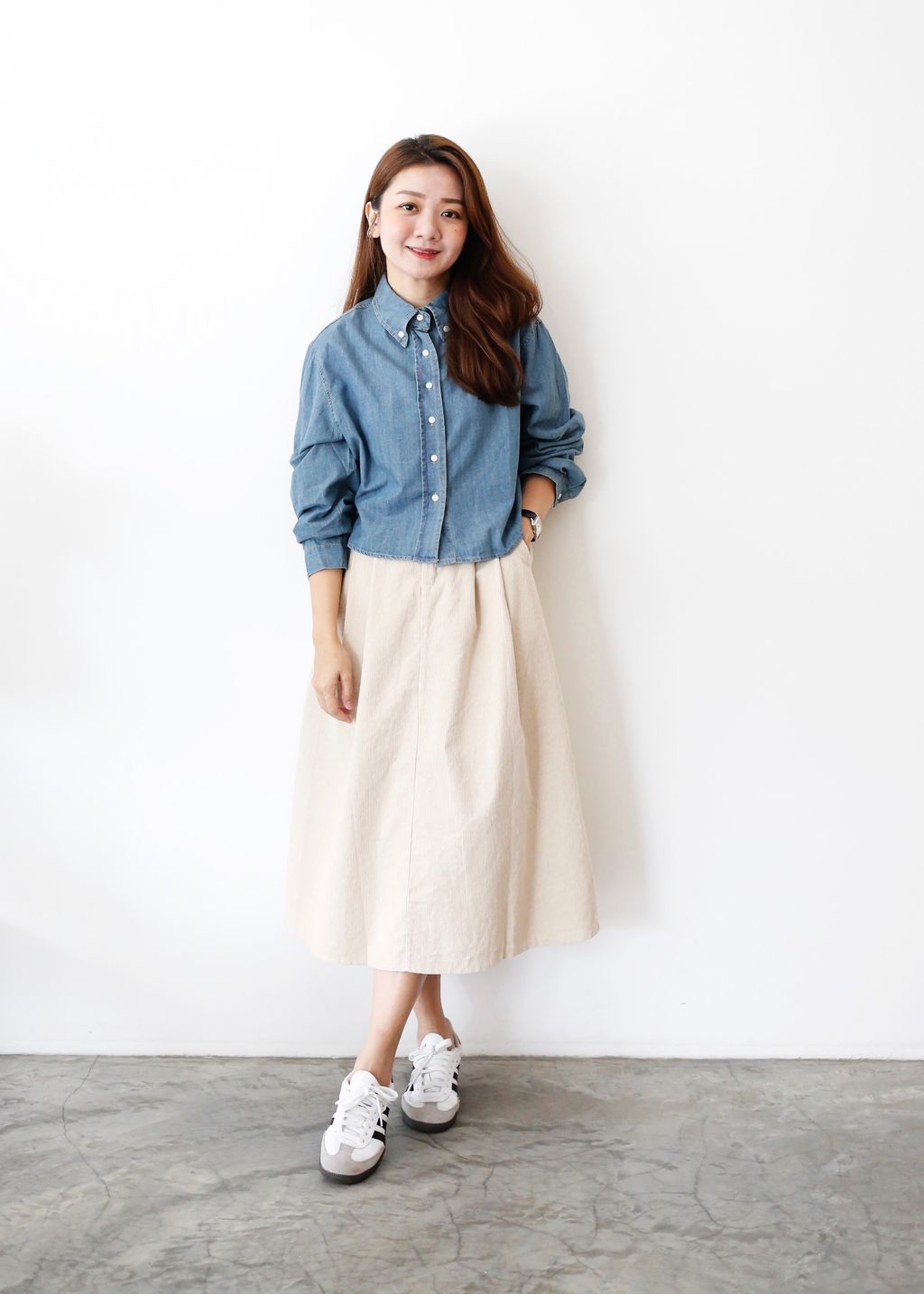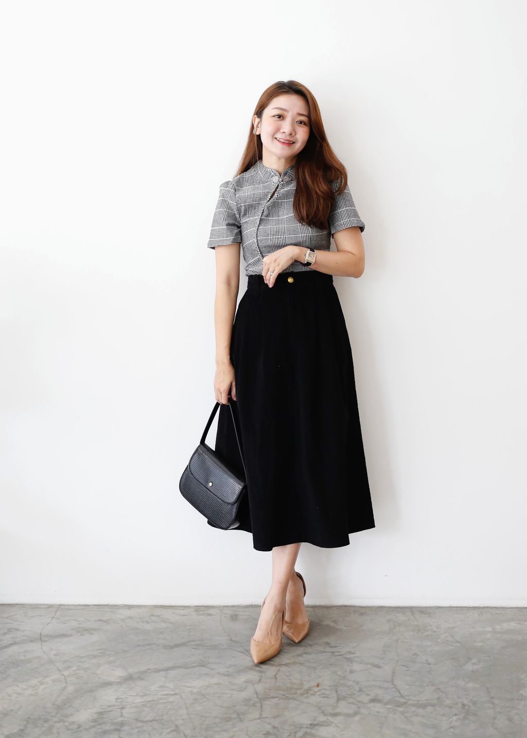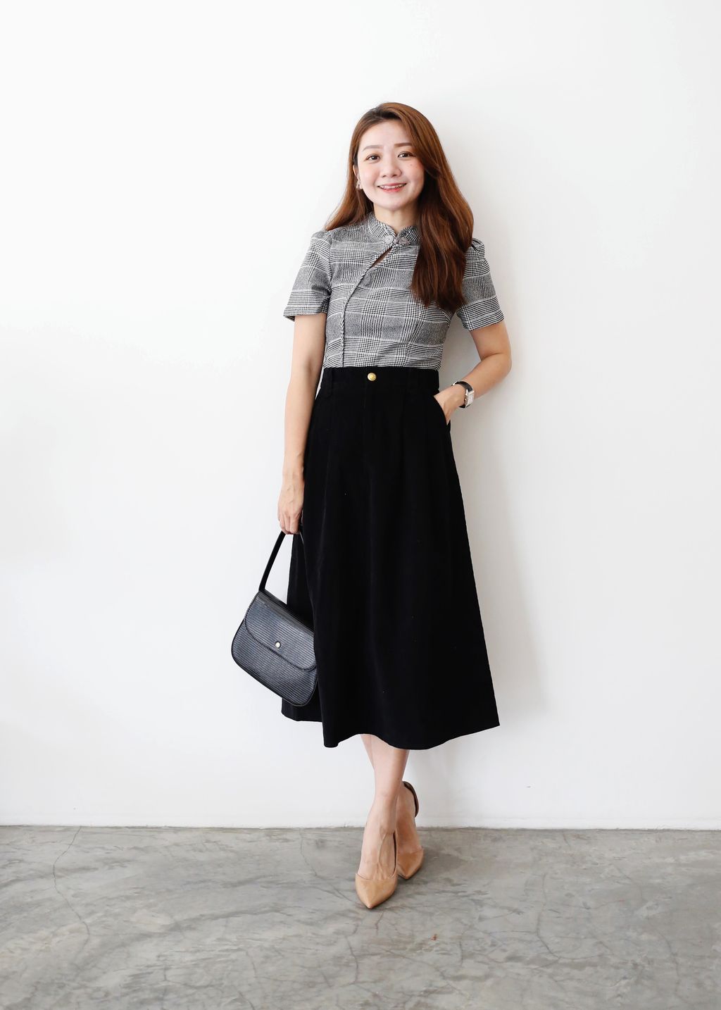 Type: Waist Pleated Corduroy Midi Skirt | Corduroy Fabric | Stretchable Waistband | Front Zipper | Side Pockets