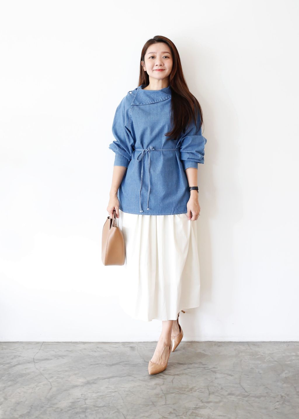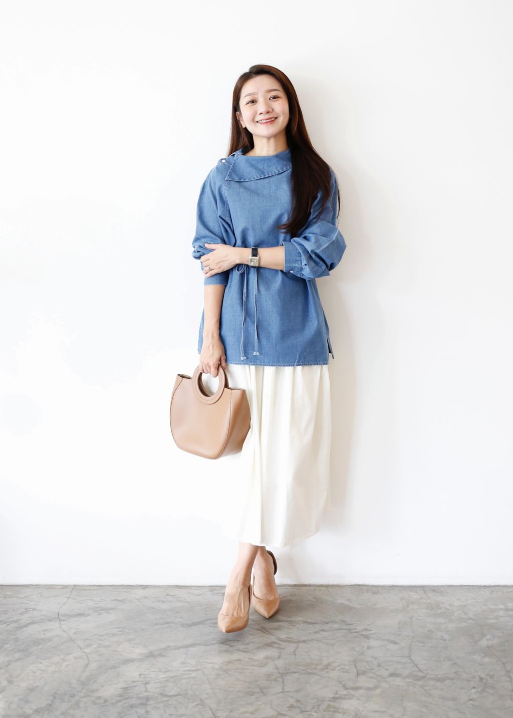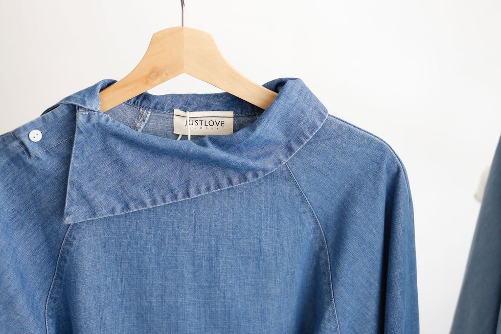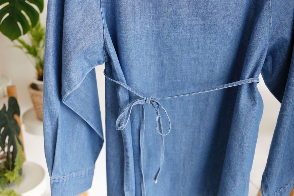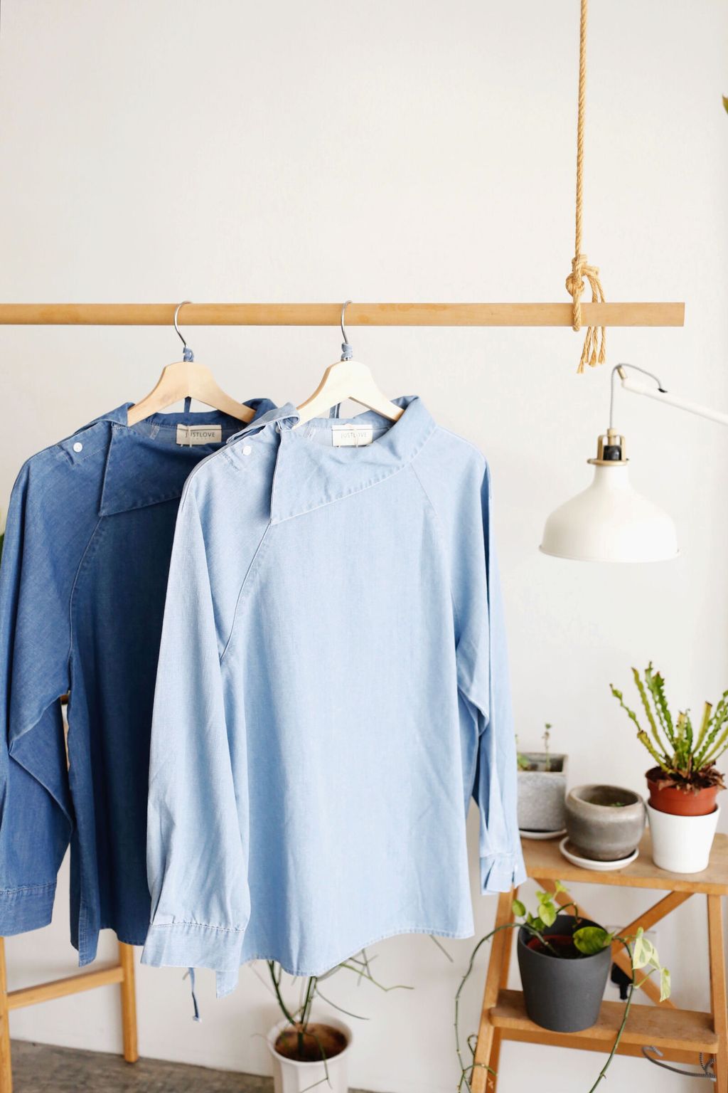 Type: Slanted Collar Cotton Denim Shirt | Soft Cotton Denim Fabric | Comes with Separate Belt | Buttons on Right Shoulder