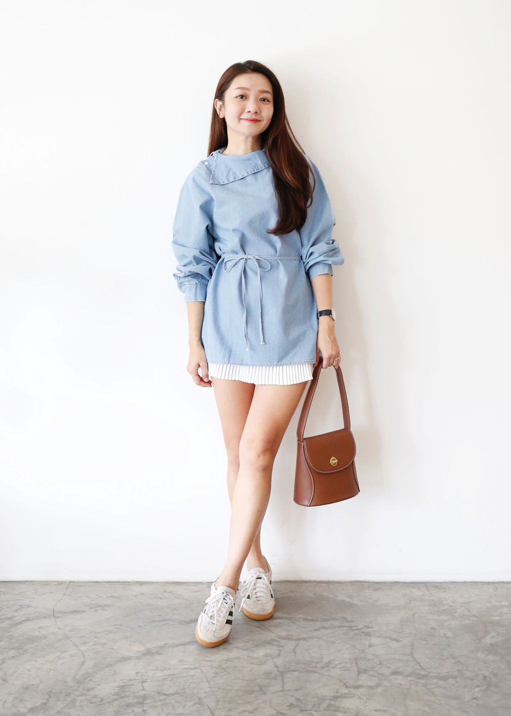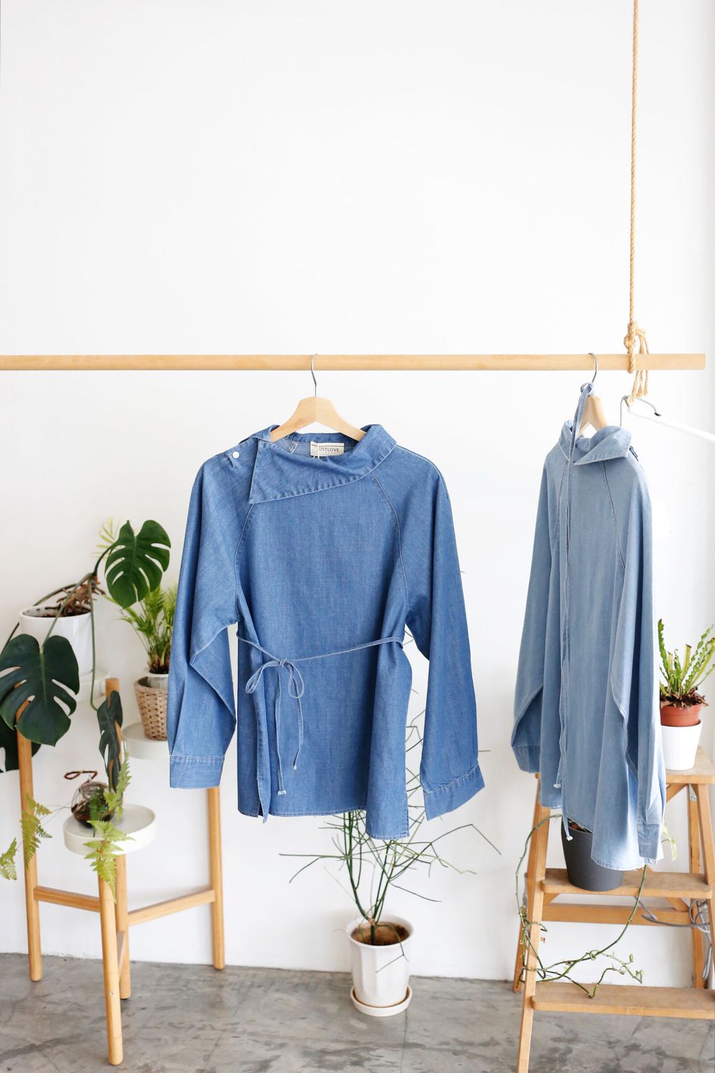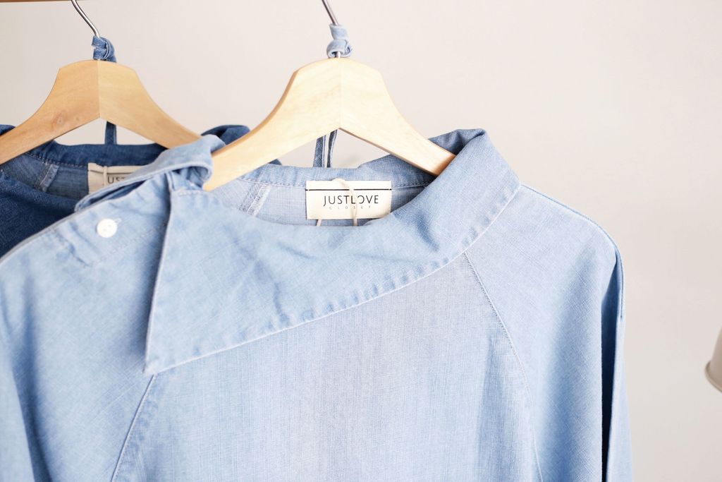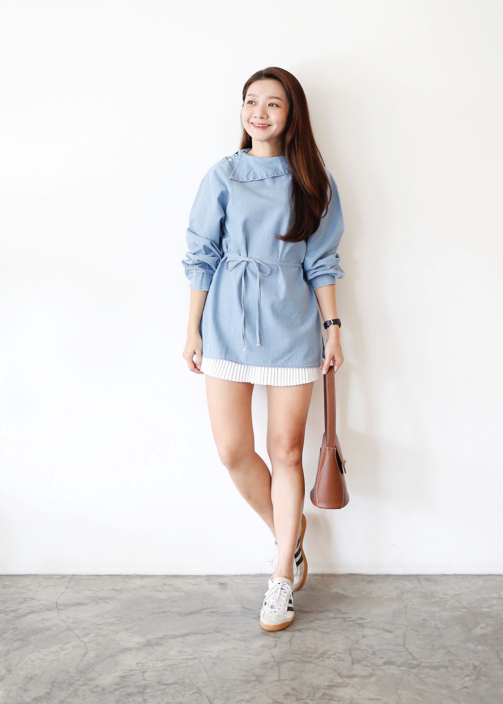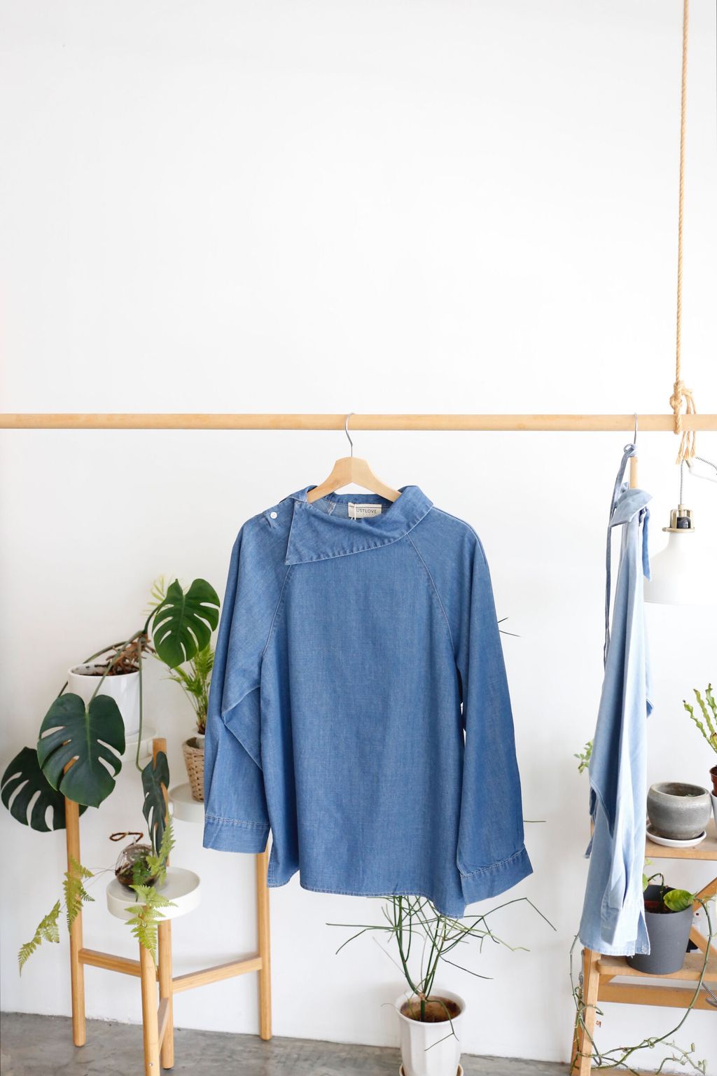 Type: Slanted Collar Cotton Denim Shirt | Soft Cotton Denim Fabric | Comes with Separate Belt | Buttons on Right Shoulder