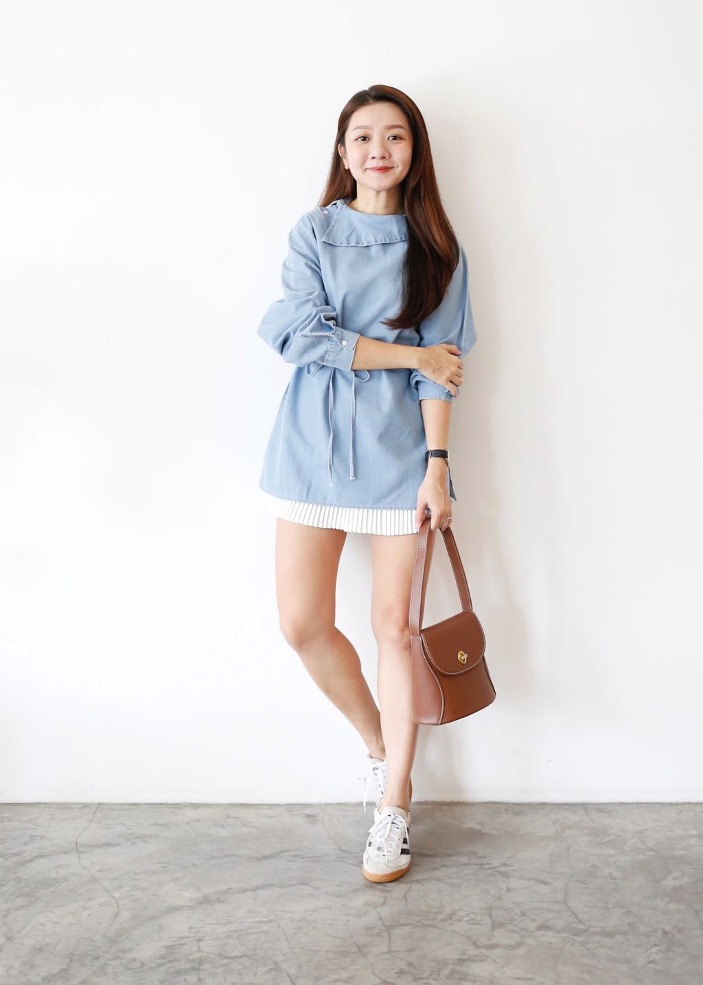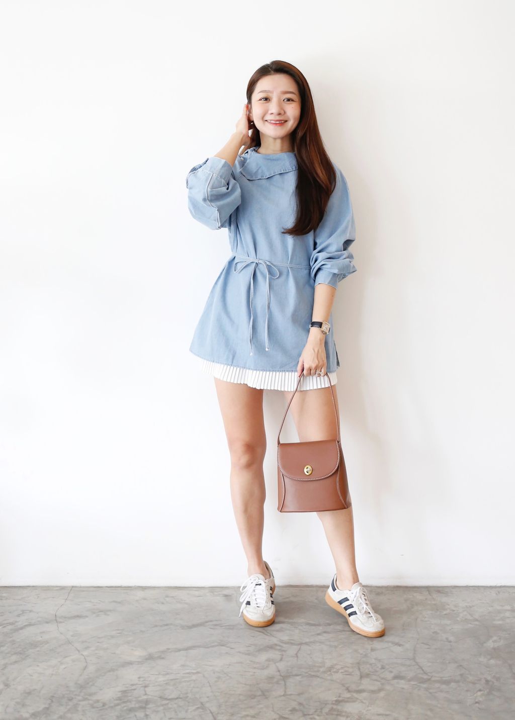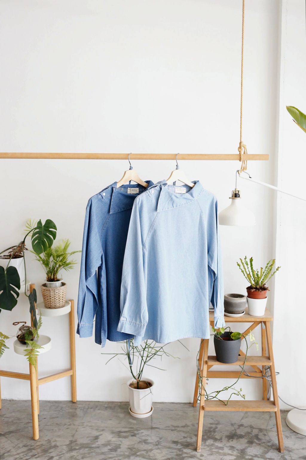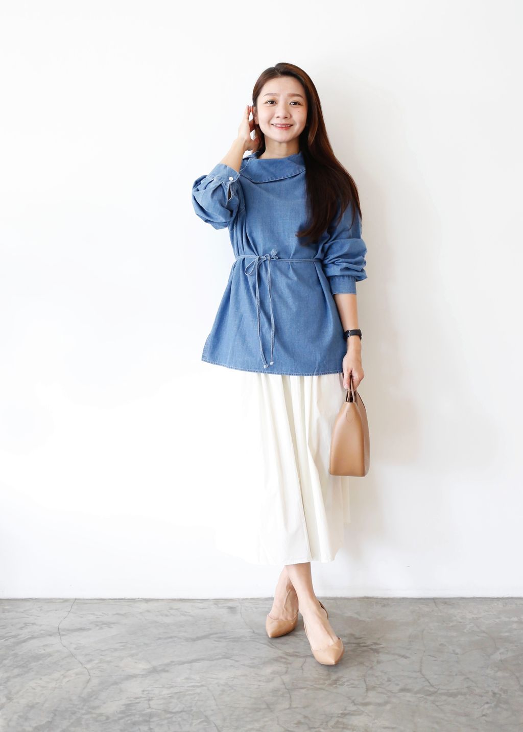 Type: Slanted Collar Cotton Denim Shirt | Soft Cotton Denim Fabric | Comes with Separate Belt | Buttons on Right Shoulder