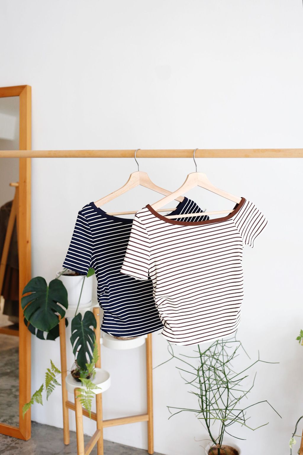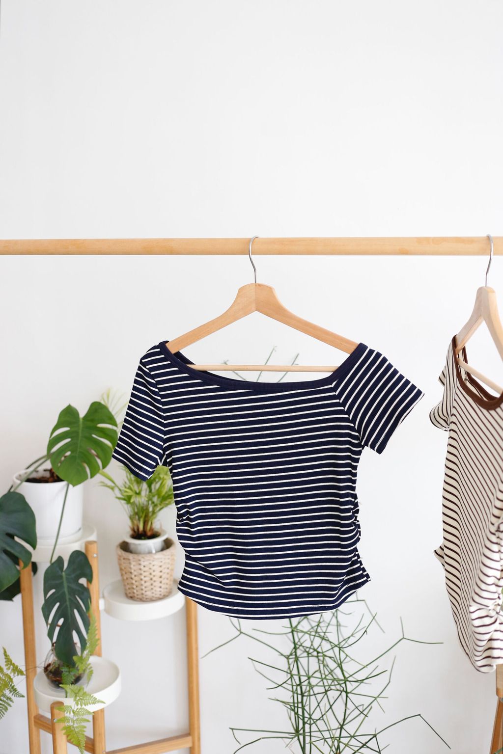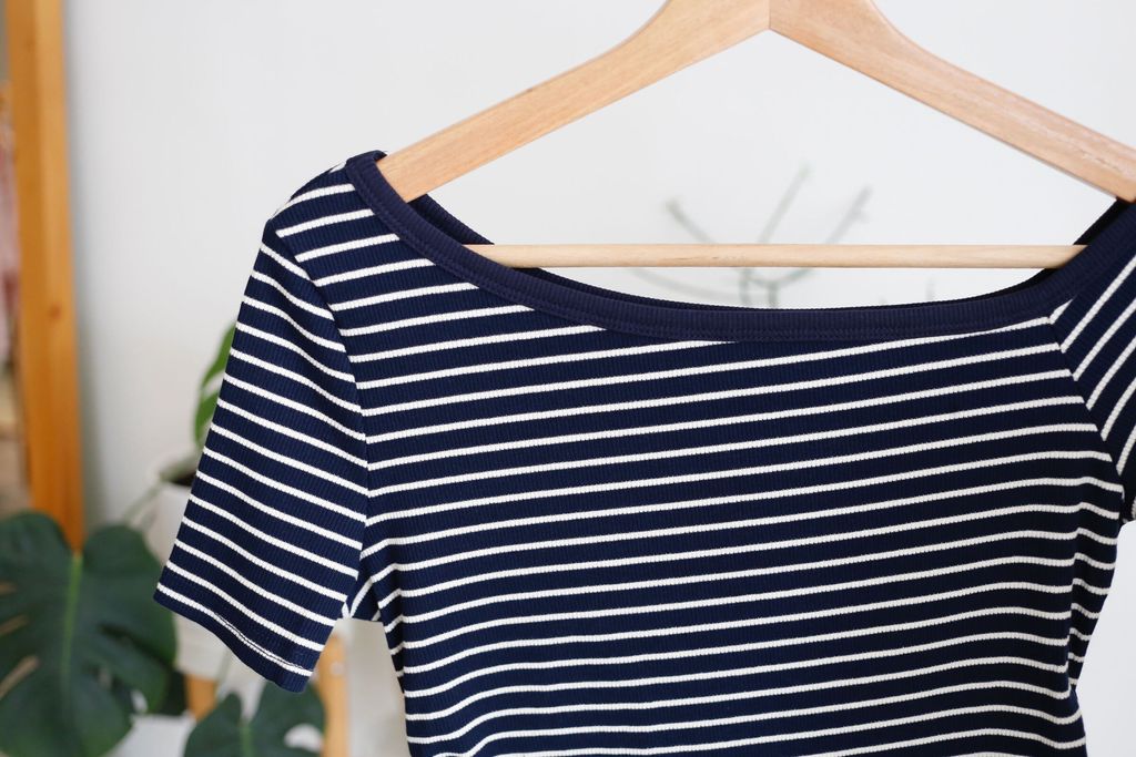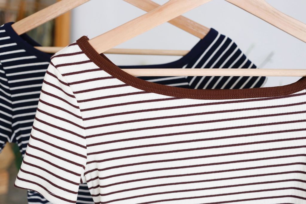 Type: Stripey Slant Collar Blouse | Stretchable Ribbed Knit Fabric | Side Cinched Design