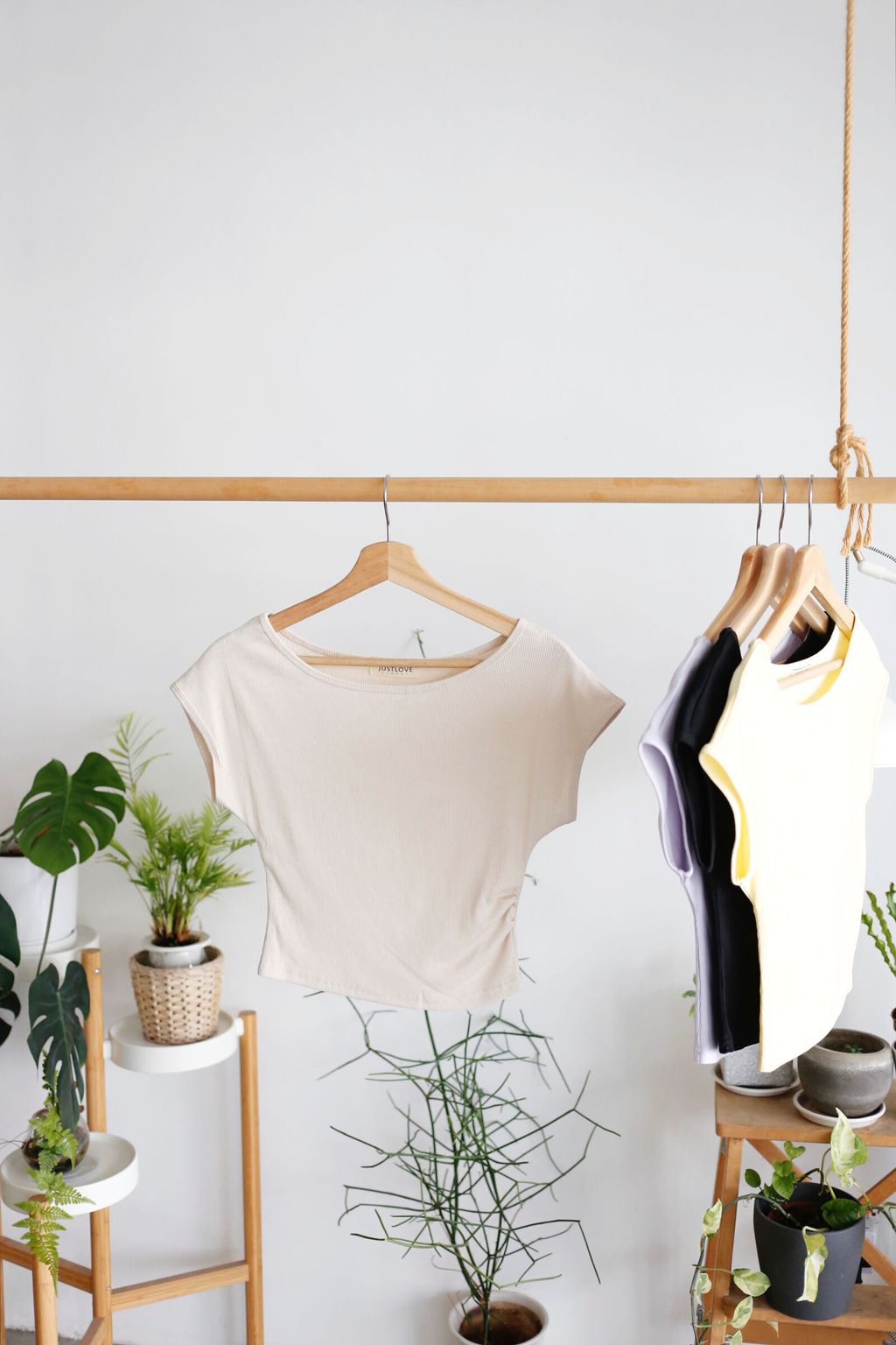 Type: Boat Neck Ribbed Tee | Stretchable Ribbed Fabric | Left Side Cinched Design