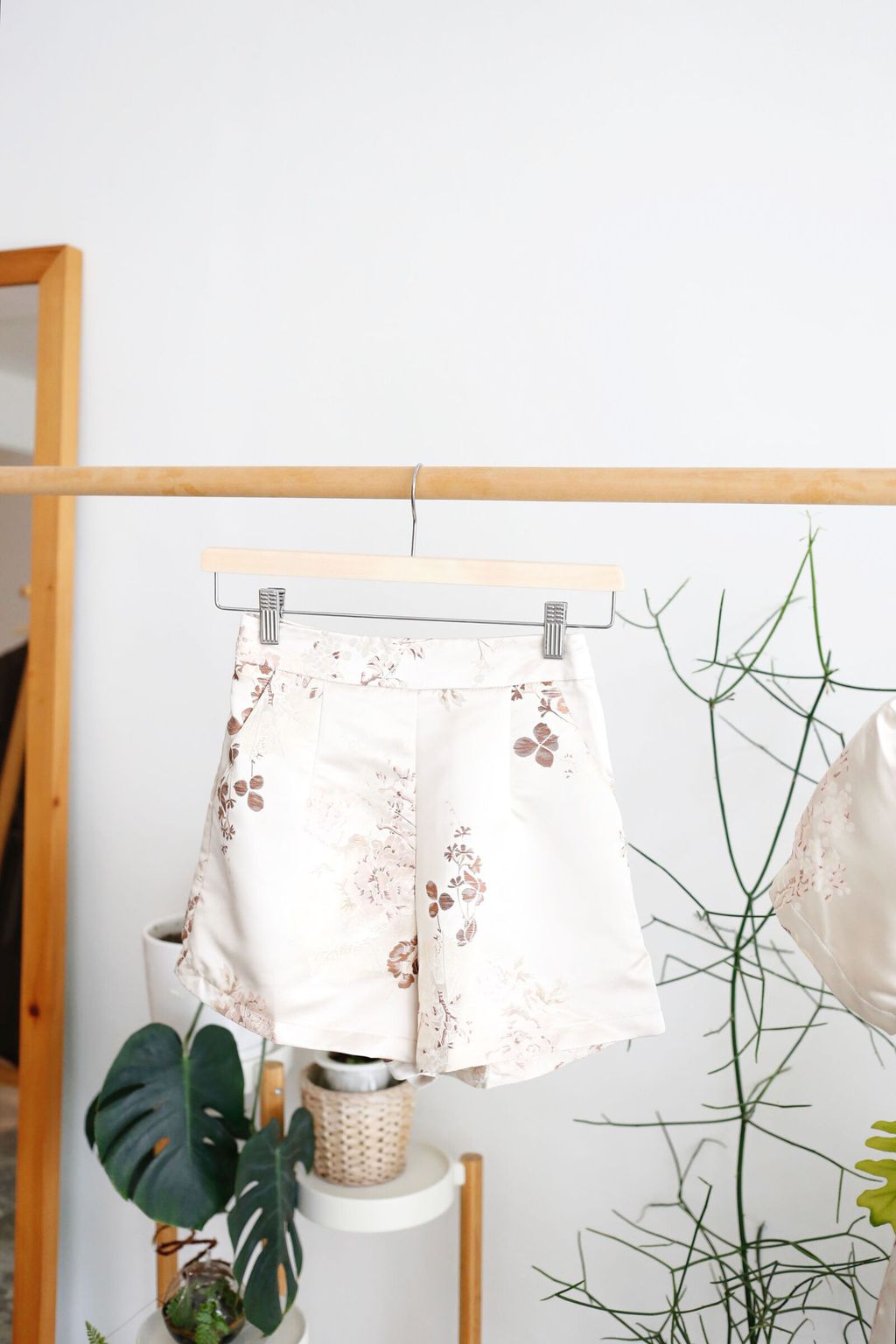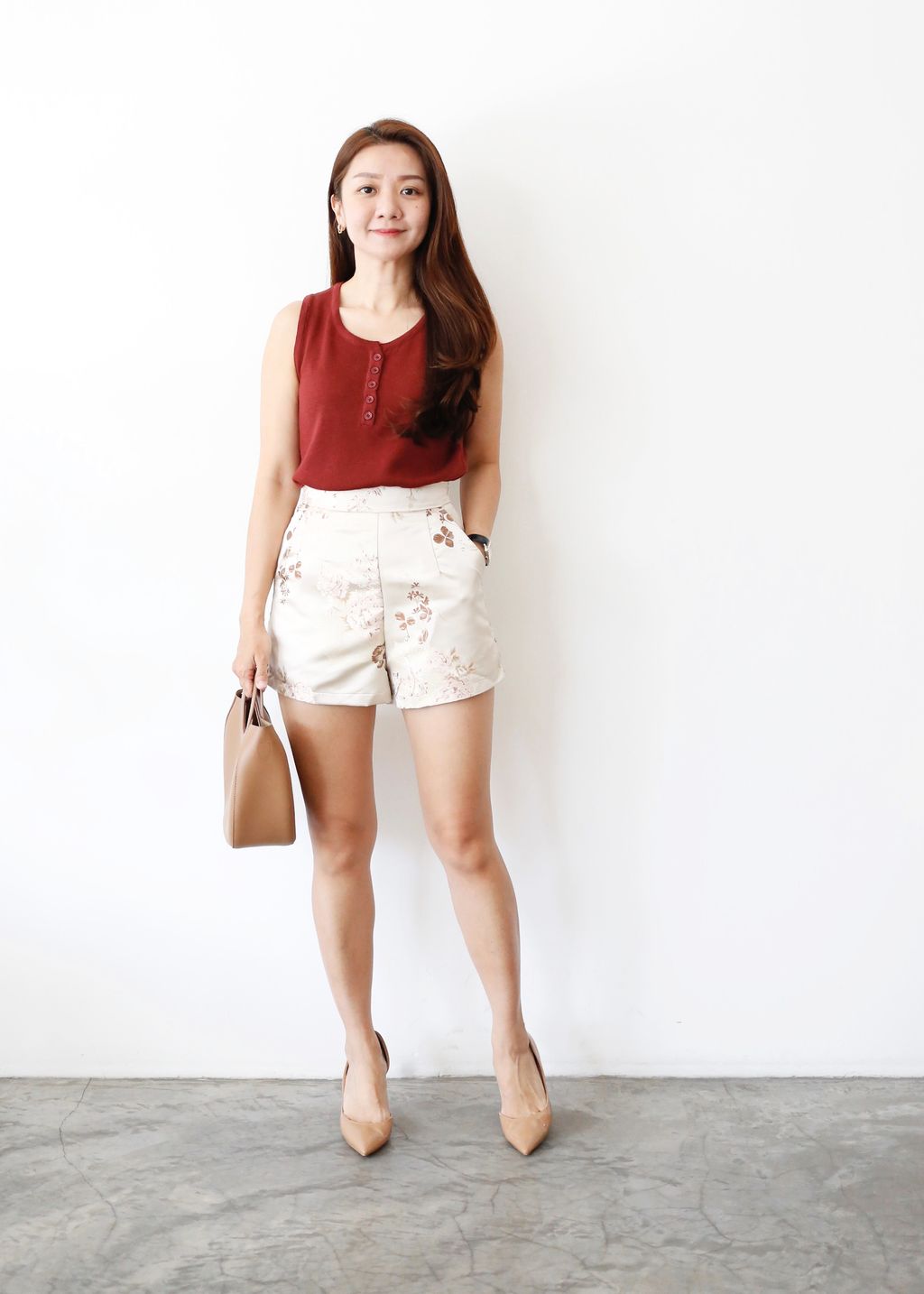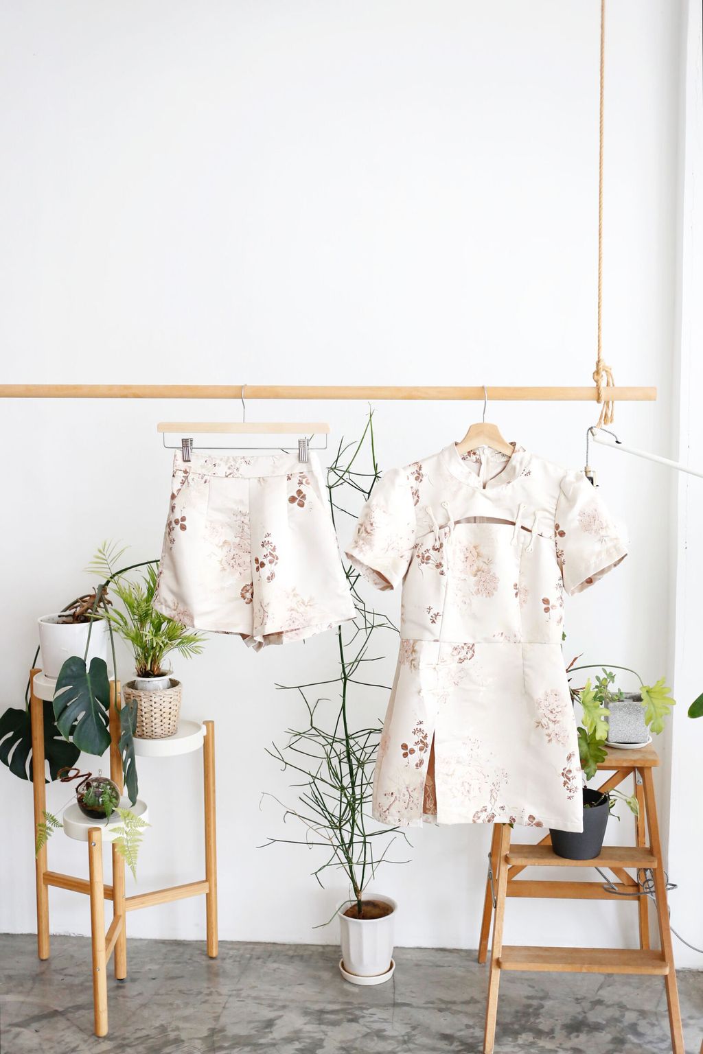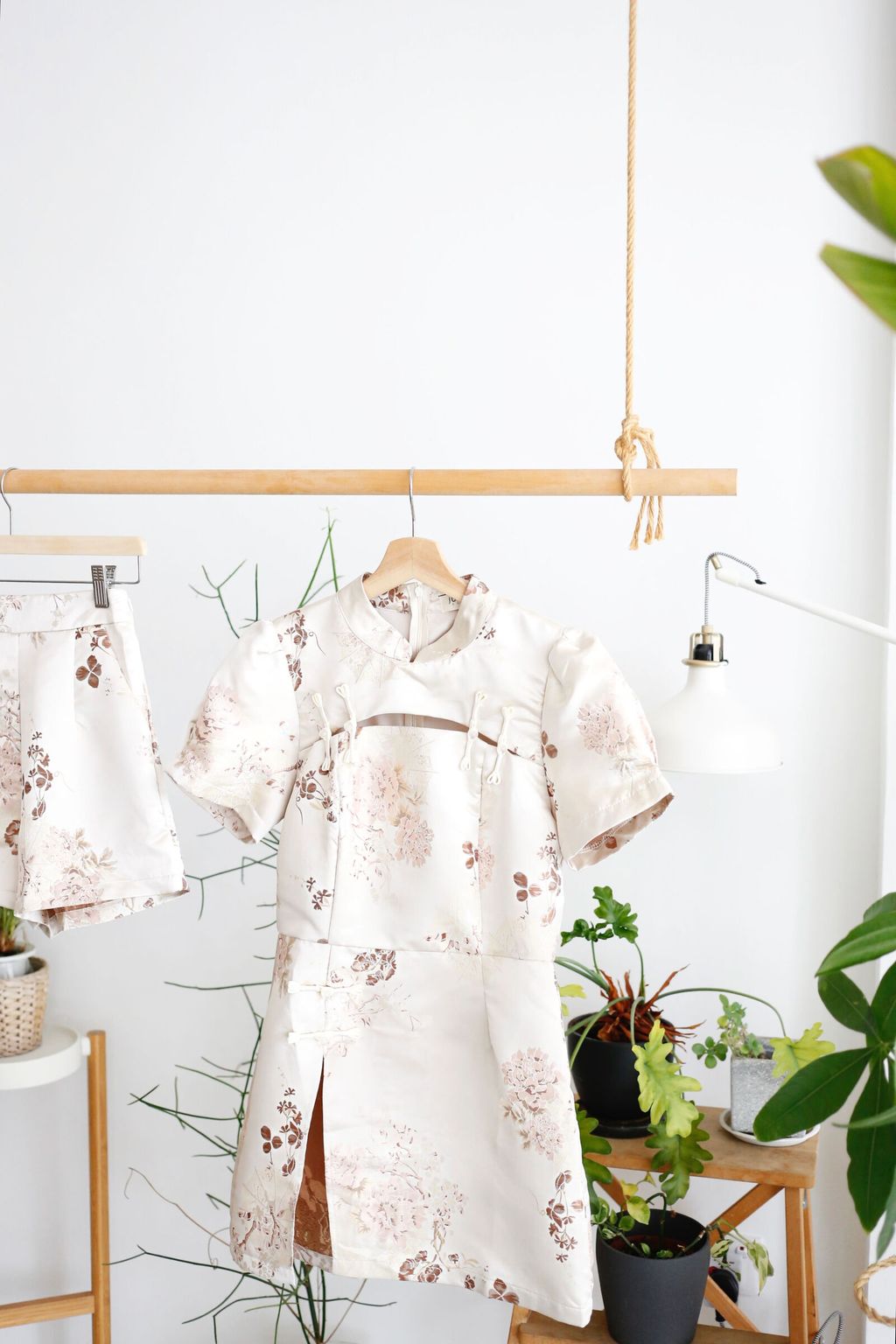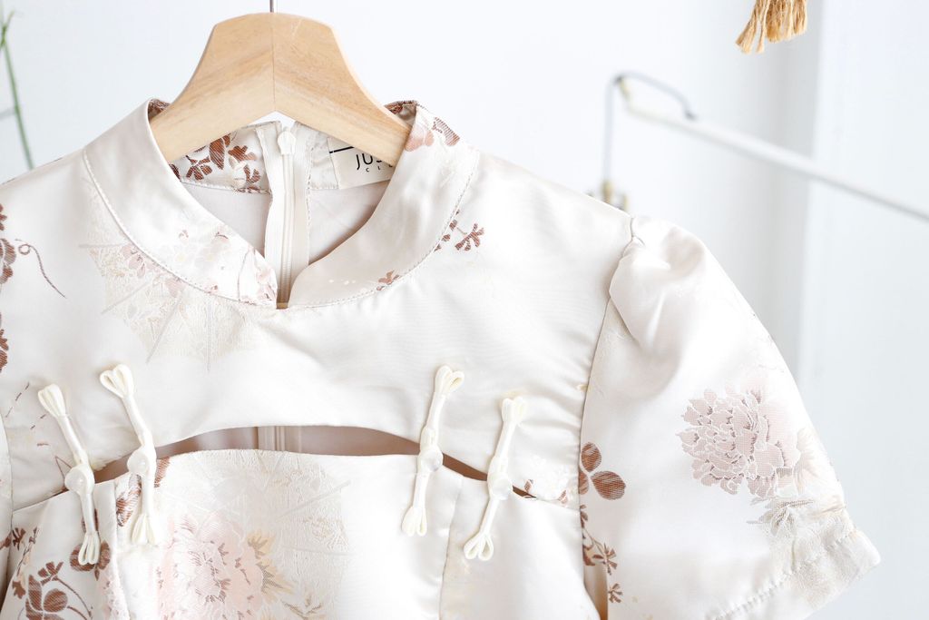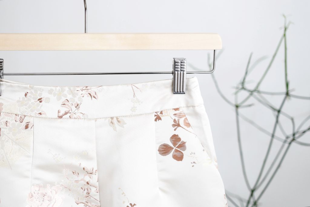 Type: 2PCS Floral Jacquard CNY Long Top and Shorts Set | PREMIUM SERIES | Jacquard Brocade Polyester Fabric | LightWeight and Breathable Fabric | Not Stretchable | Mandarin Collar with Knot-Buttons | Bust Cut-Out Design | Back Zipper for Top | Side Slit Design for Top | Stretchable Waistband (Back) for Shorts | Side Zipper for Shorts | Side Pockets