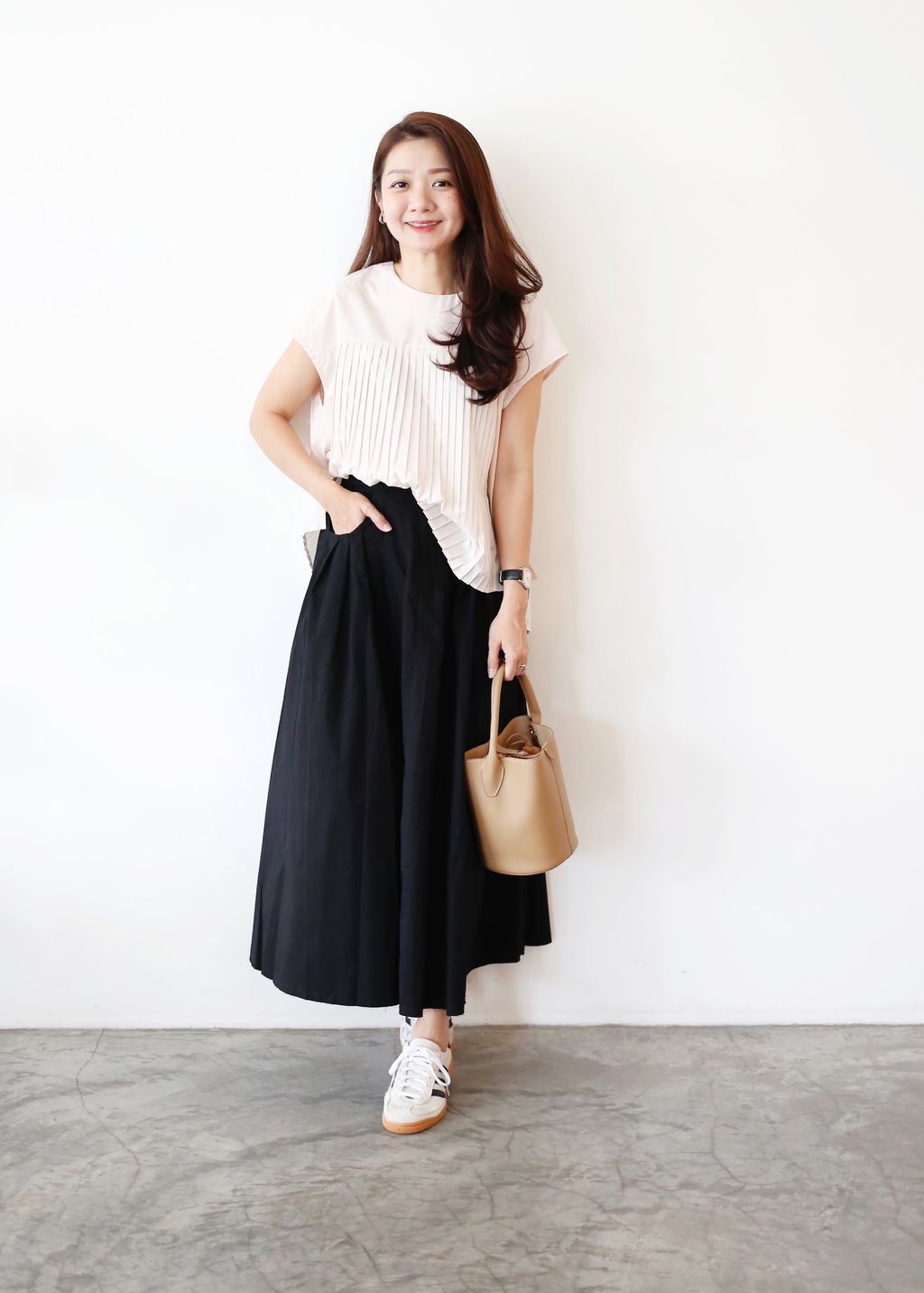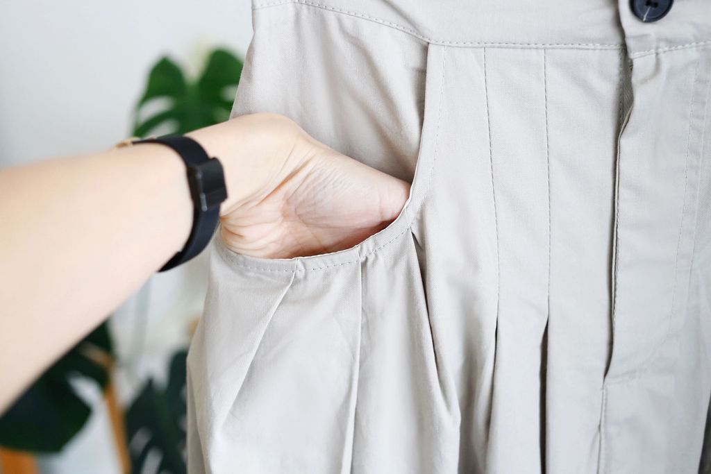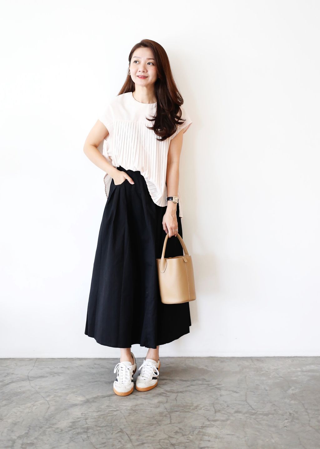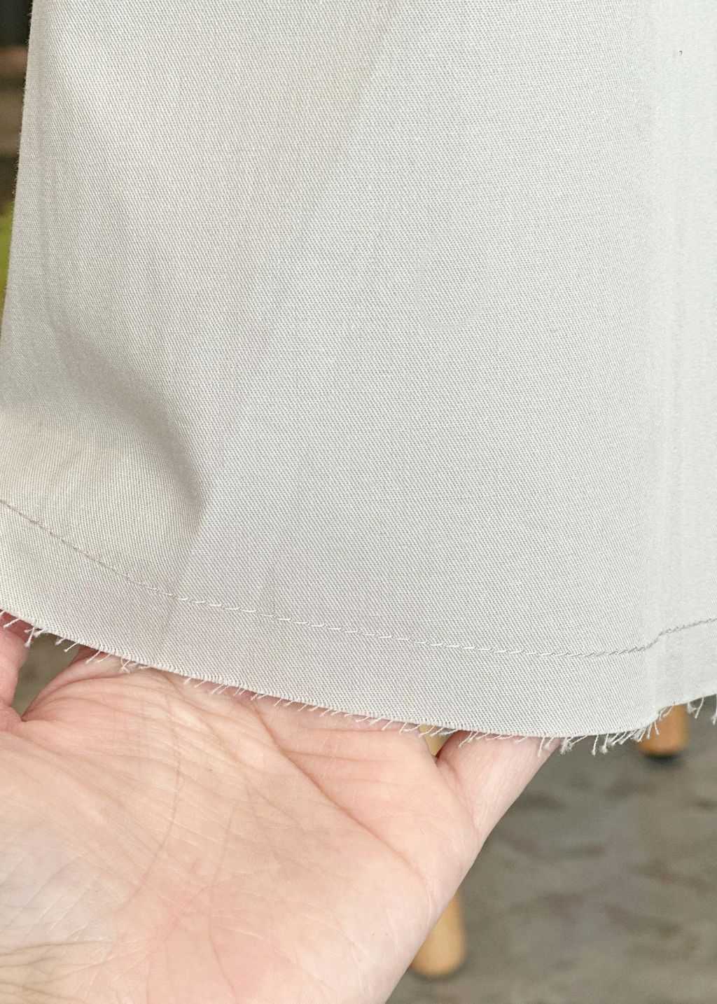 Type: Pleated Front Maxi Skirt | Cotton Fabric | Stretchable Waistband | Front Zipper | Side Pockets | Raw-Edge Design