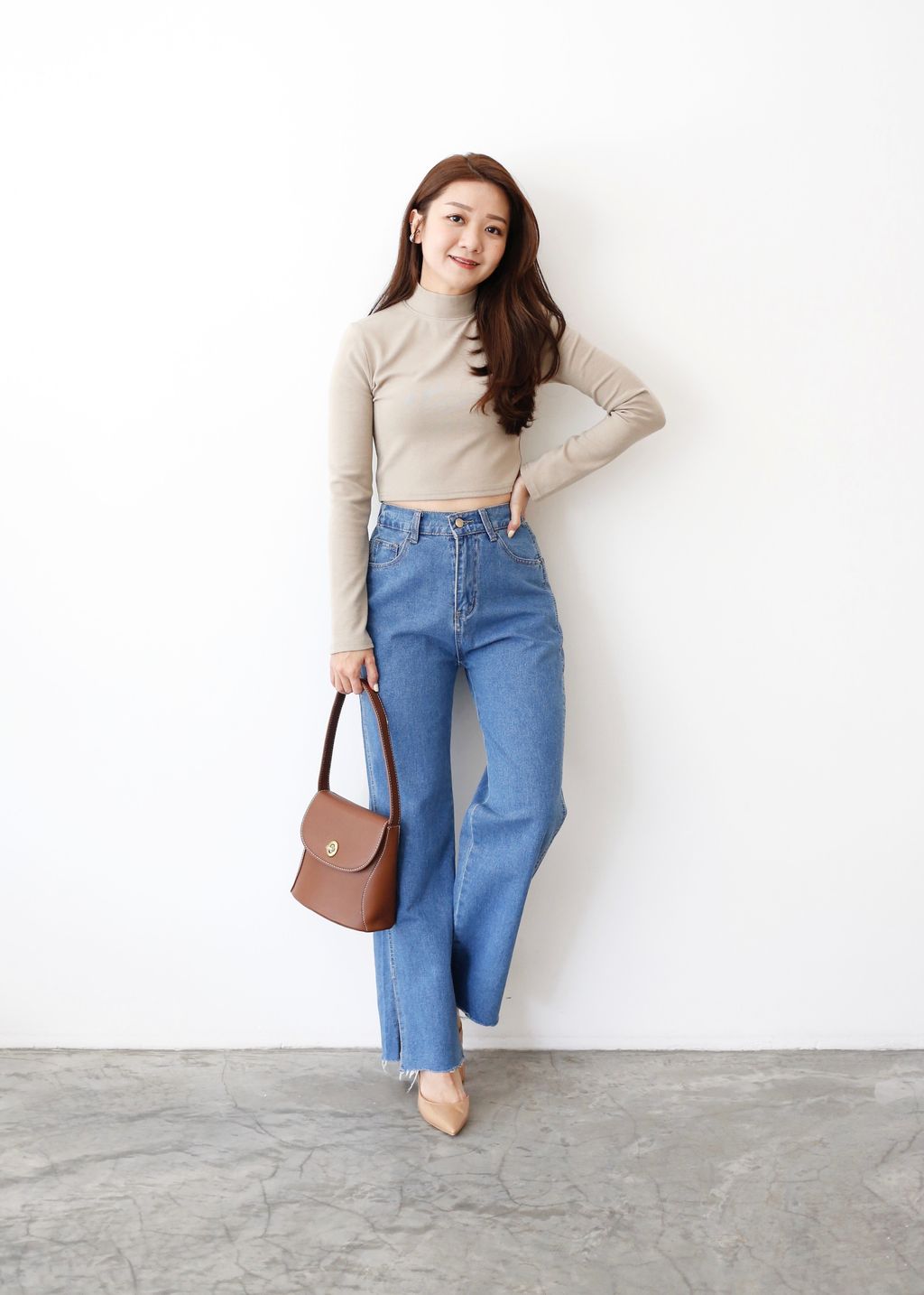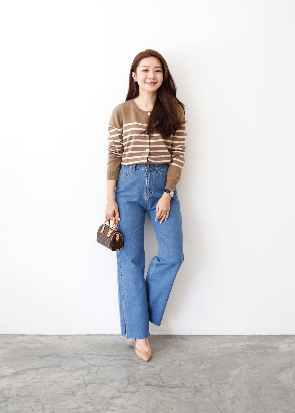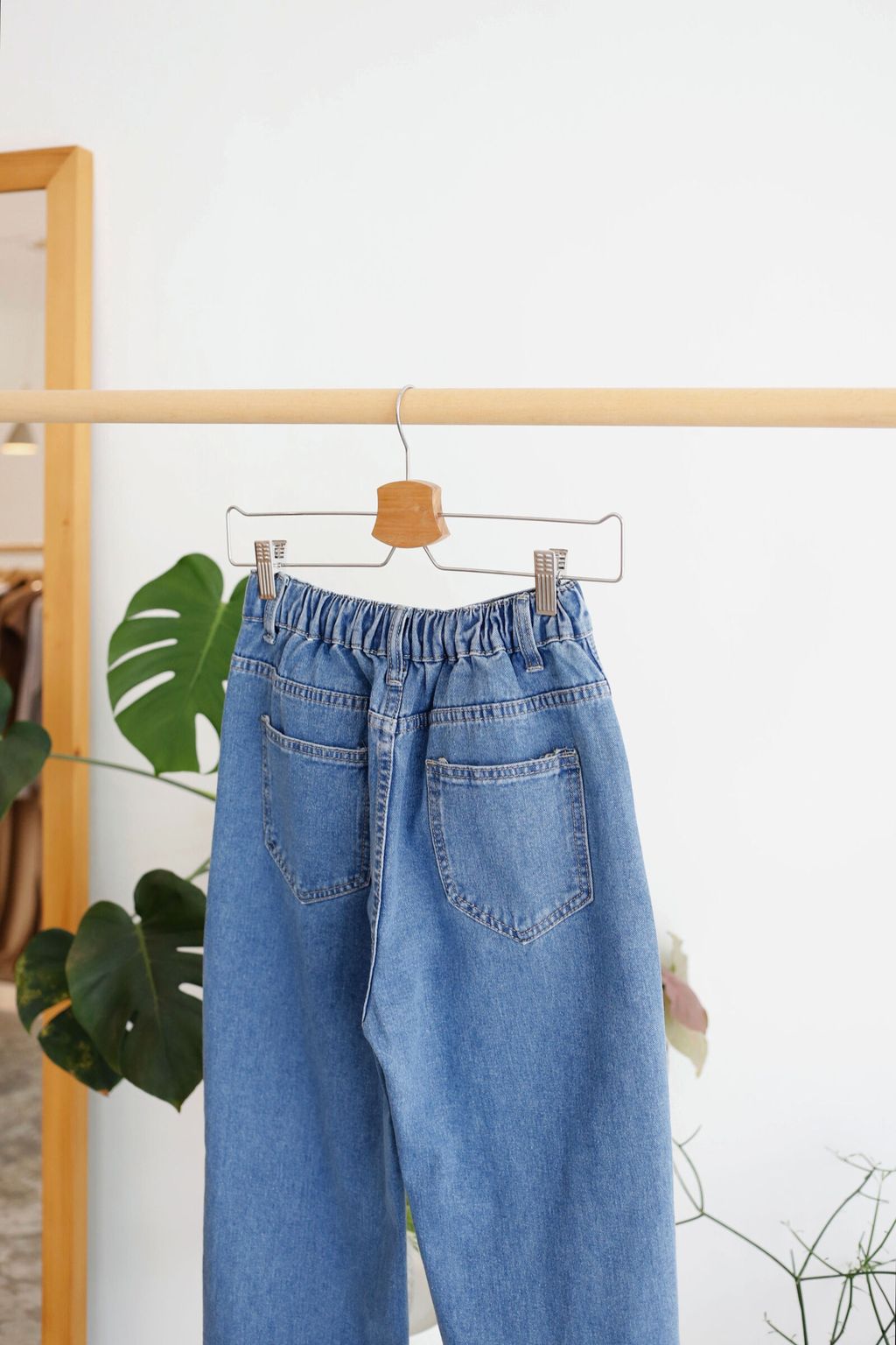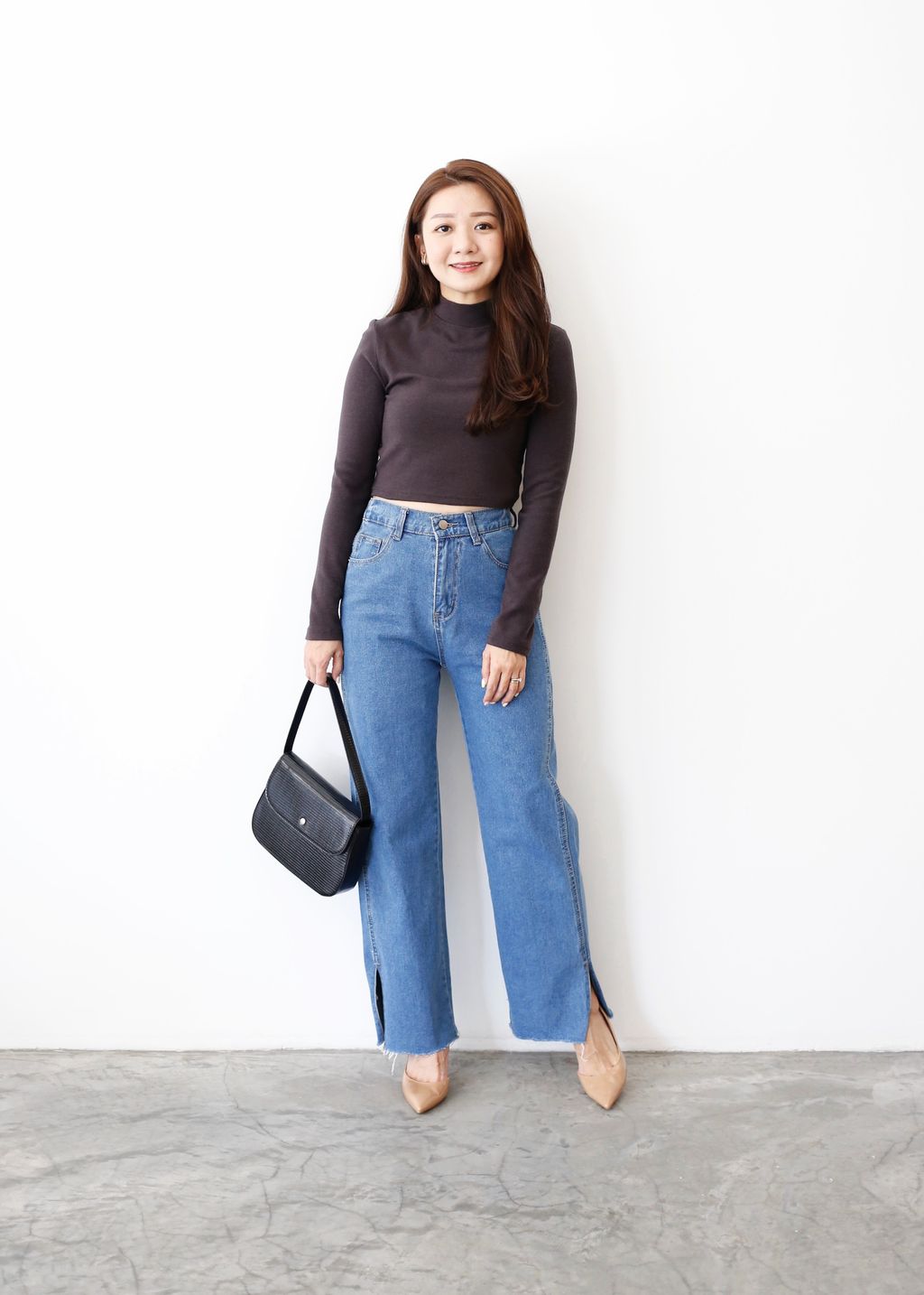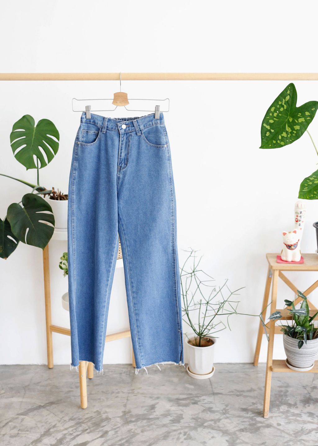 Type: Slit Hem Denim Straight Pants | Non Stretchable Denim | Stretcheable Waistband | Side Pockets | Front Zipper
