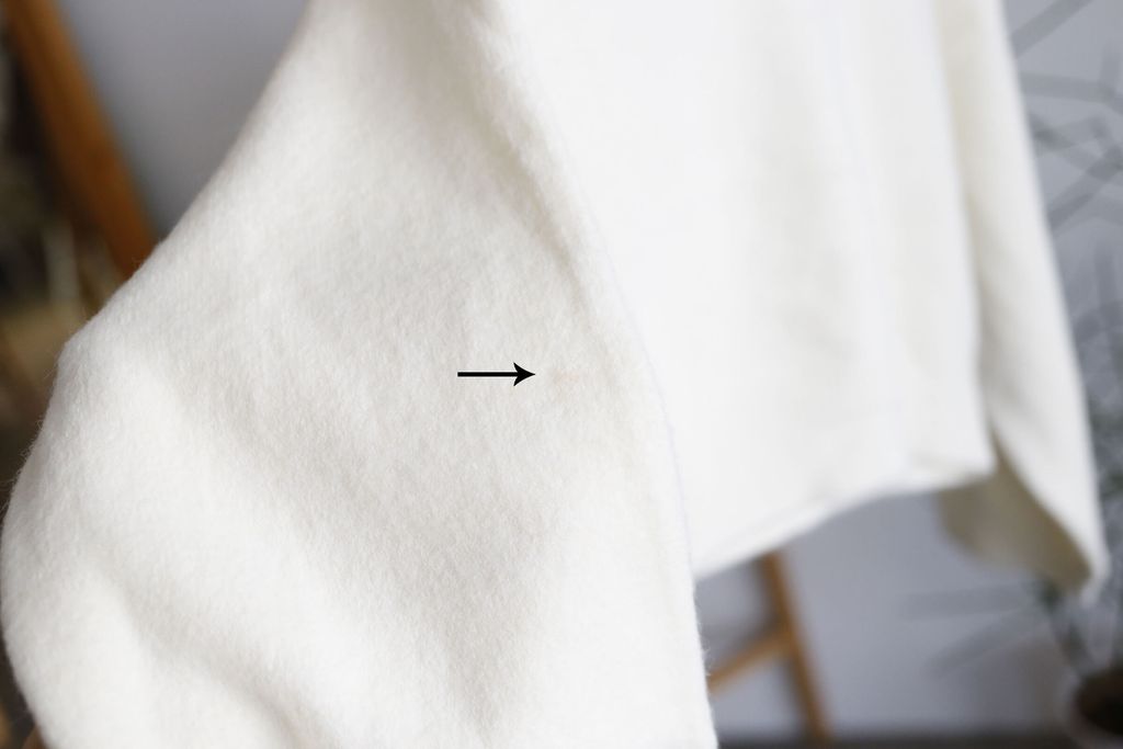 Defect Descriptions: Light Pink Stain on Back of Right Sleeve